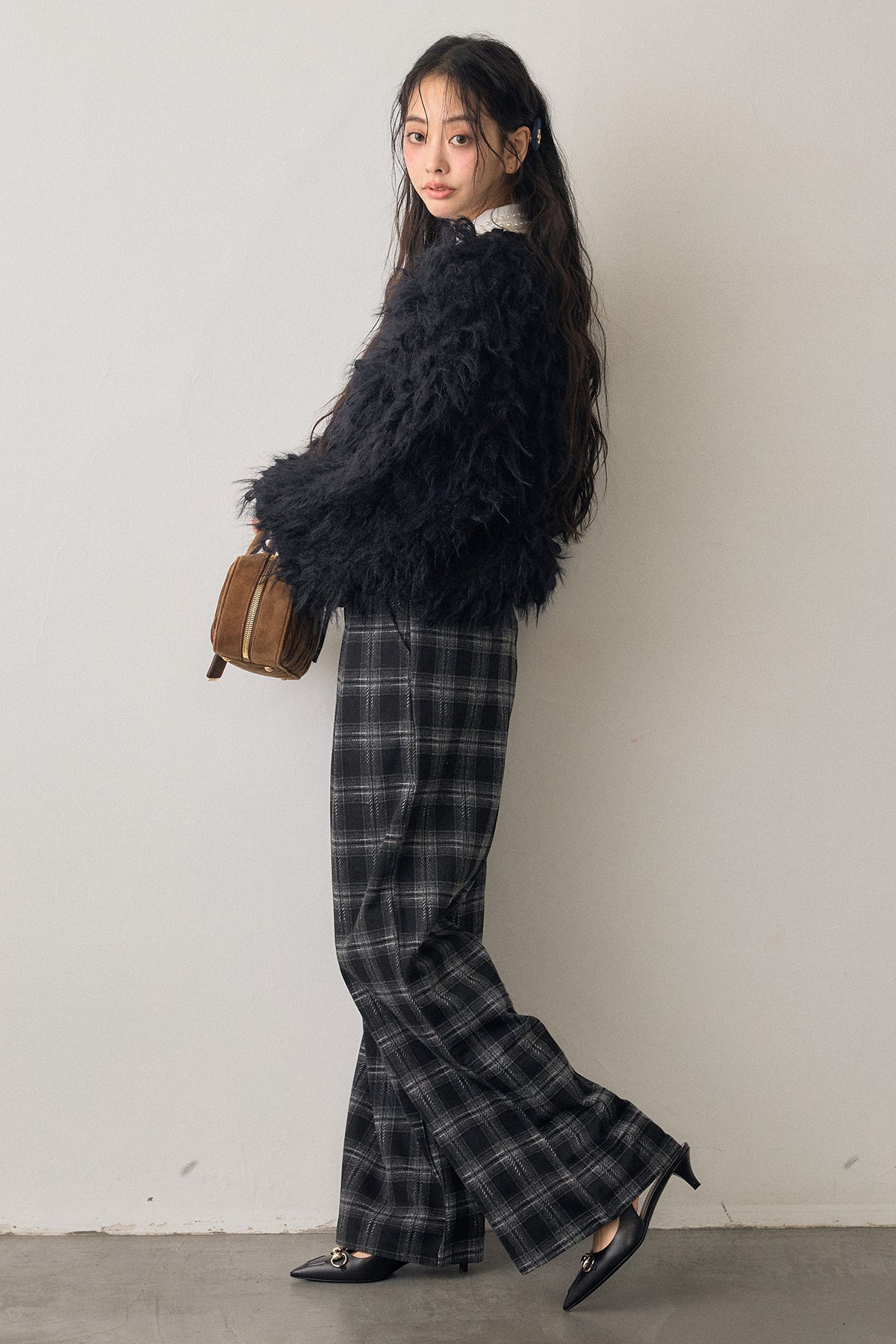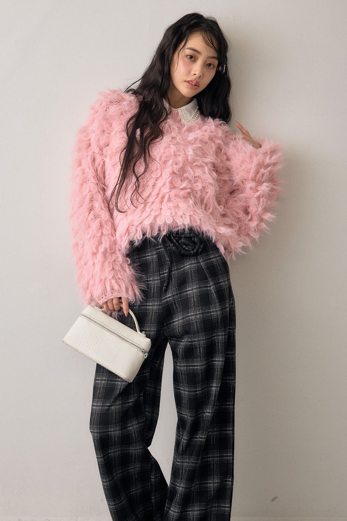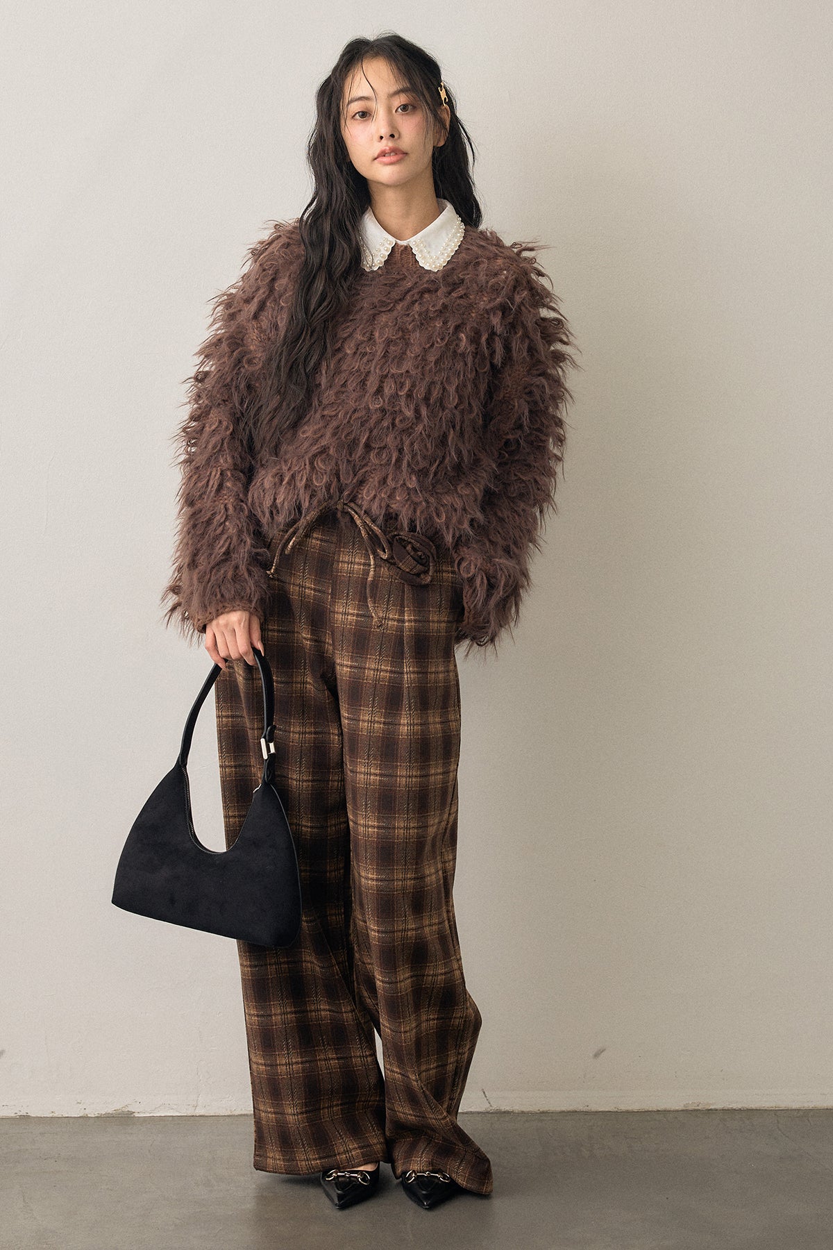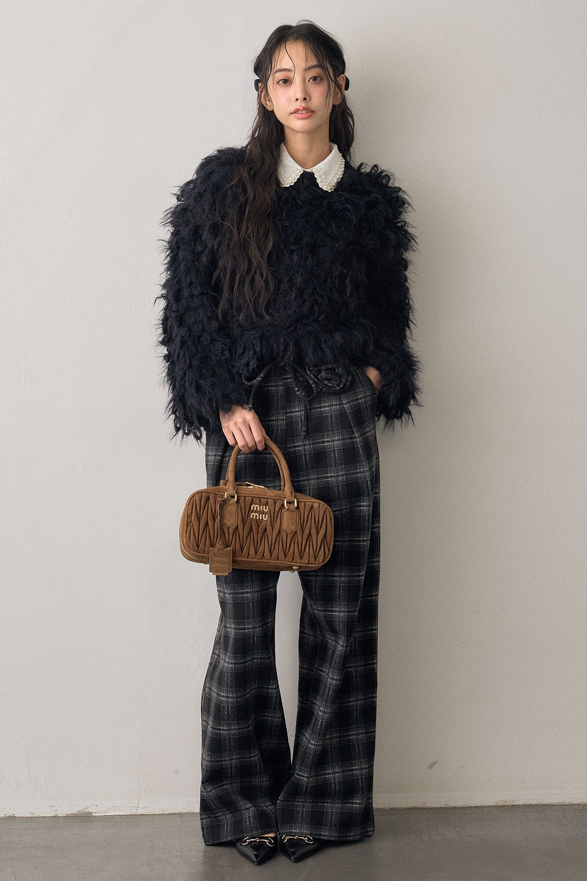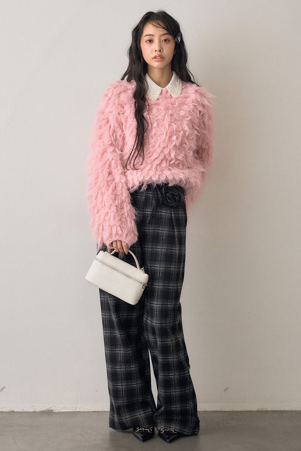 [予約/SET]2連パール付け襟+ループシャプルオーバーニット+クラシカルチェックフラワーモチーフ付きパンツ(3set)