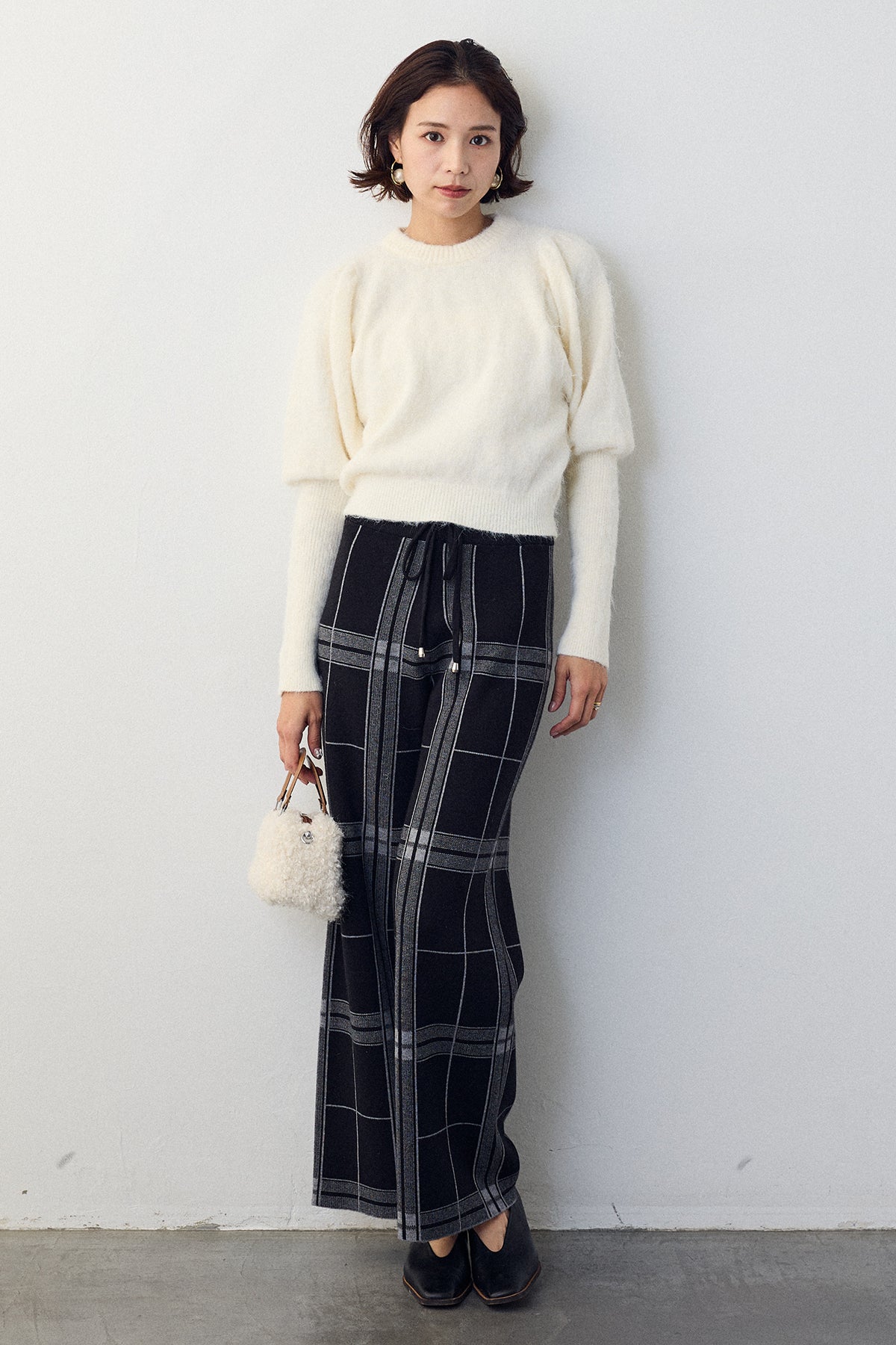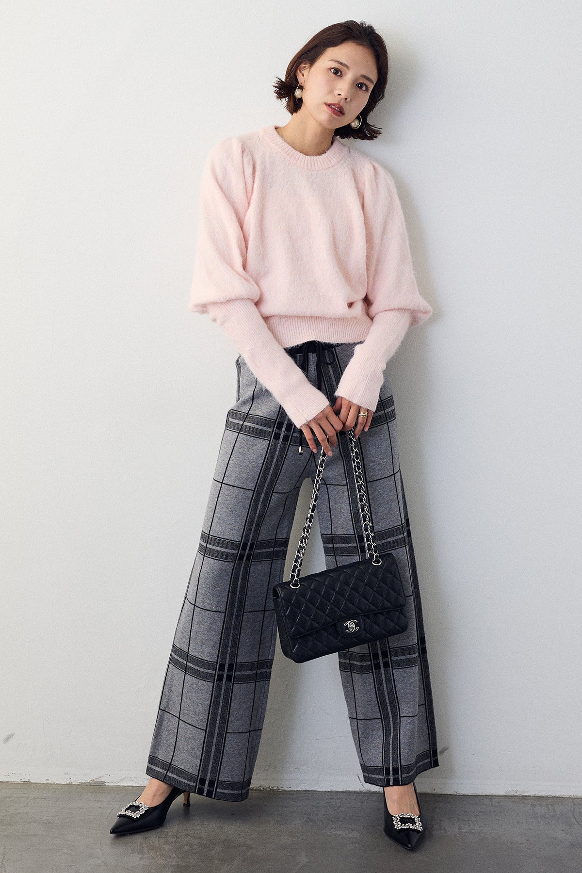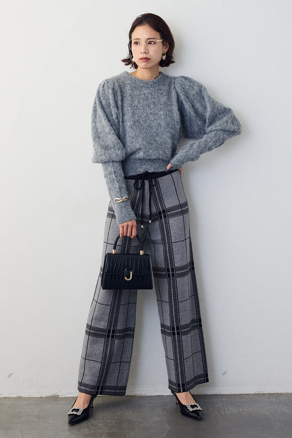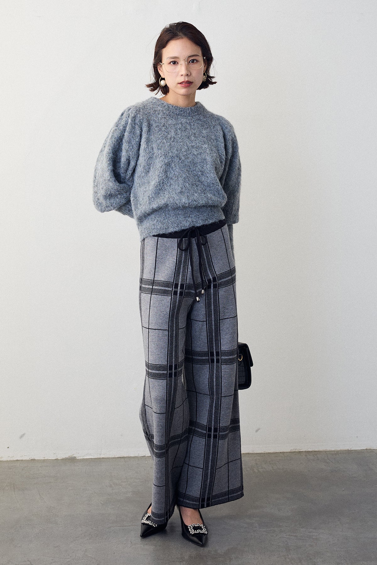 [予約/SET]モヘアパフスリーブプルオーバー+チェック柄ニットストレートパンツ(2set)