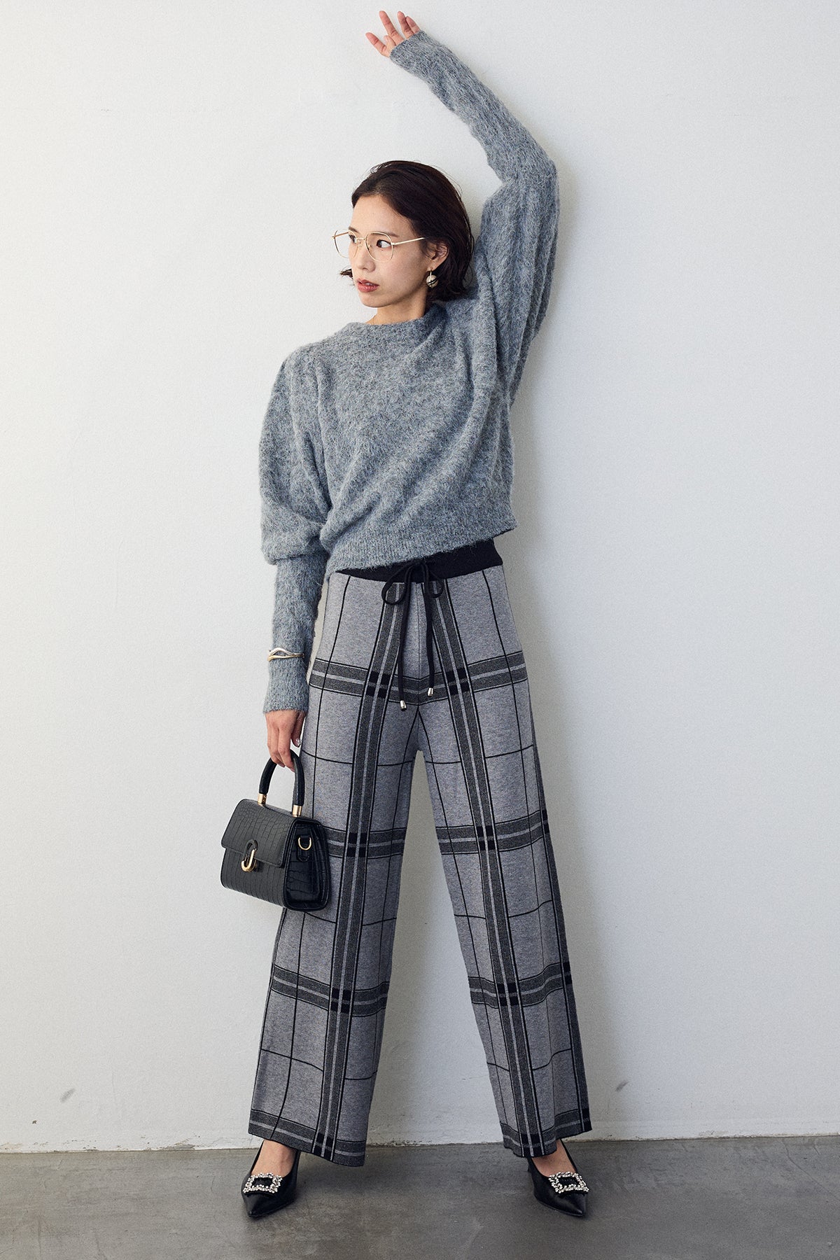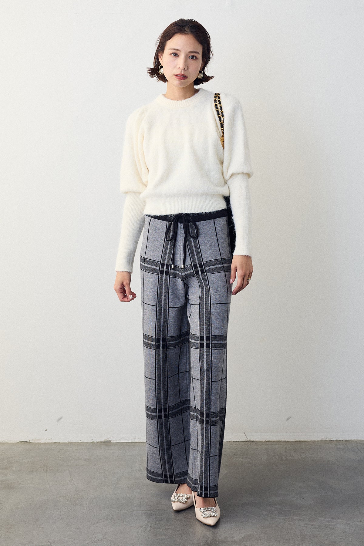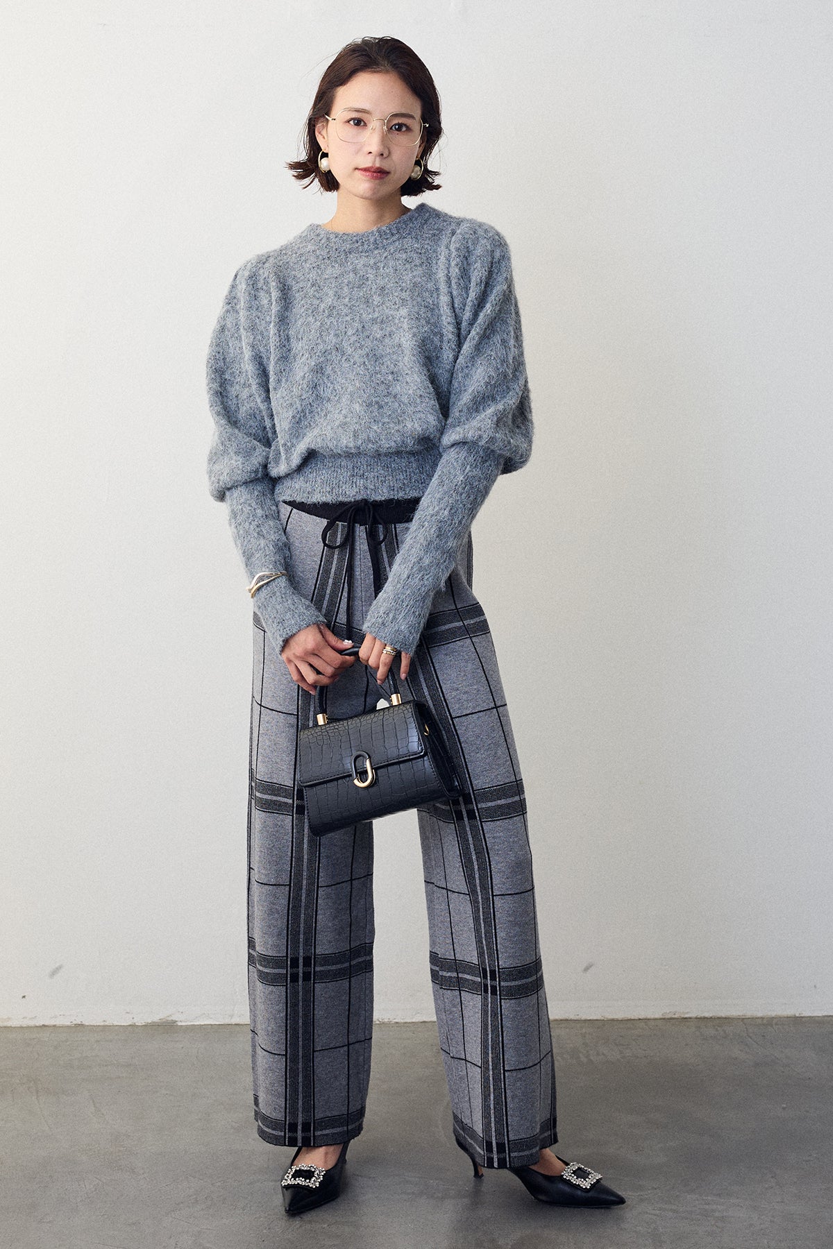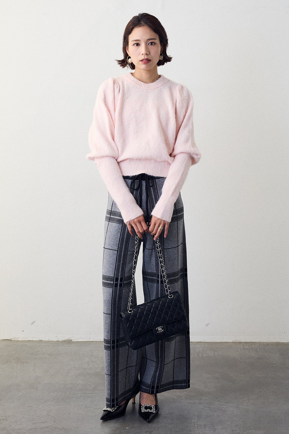 [予約/SET]モヘアパフスリーブプルオーバー+チェック柄ニットストレートパンツ(2set)
