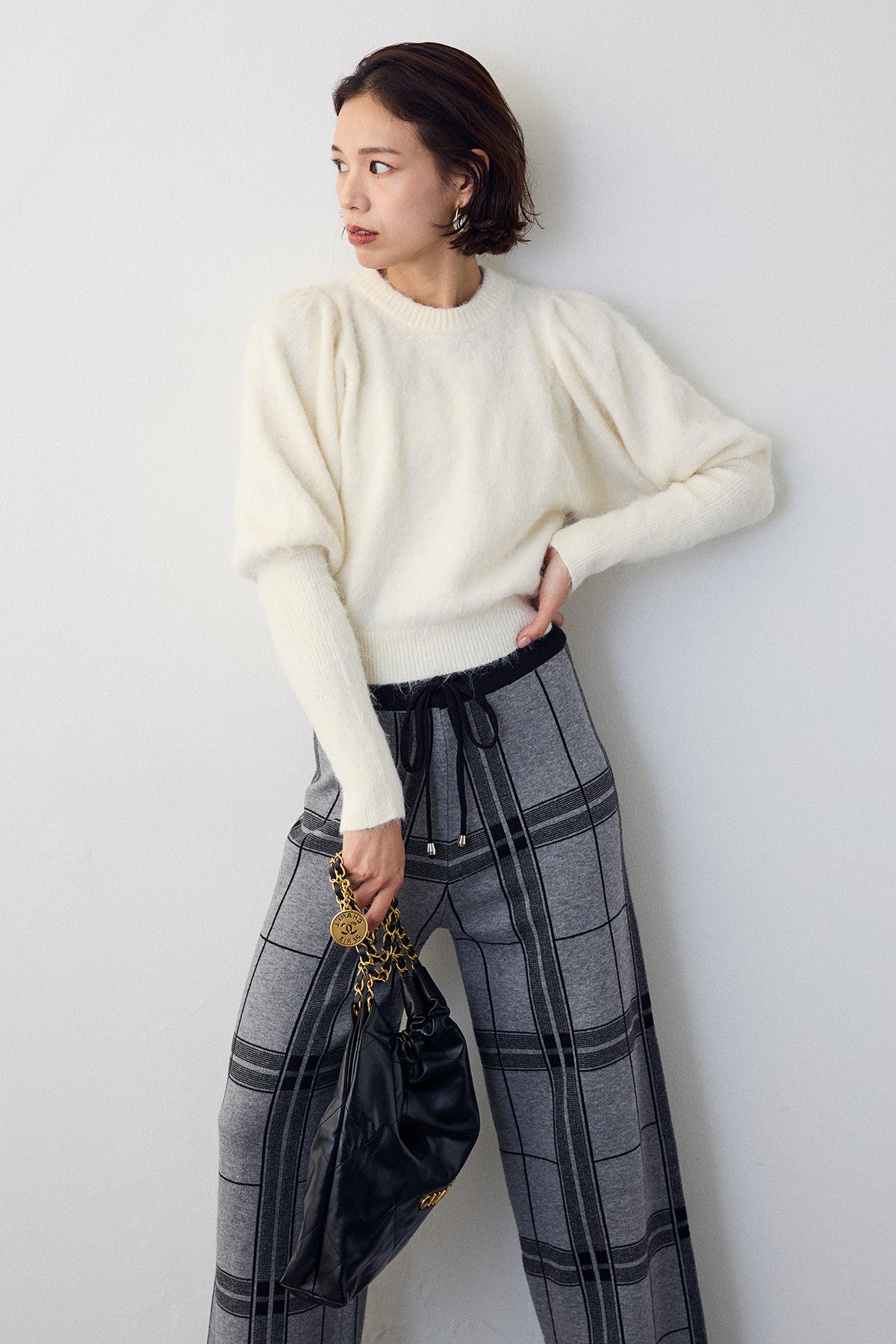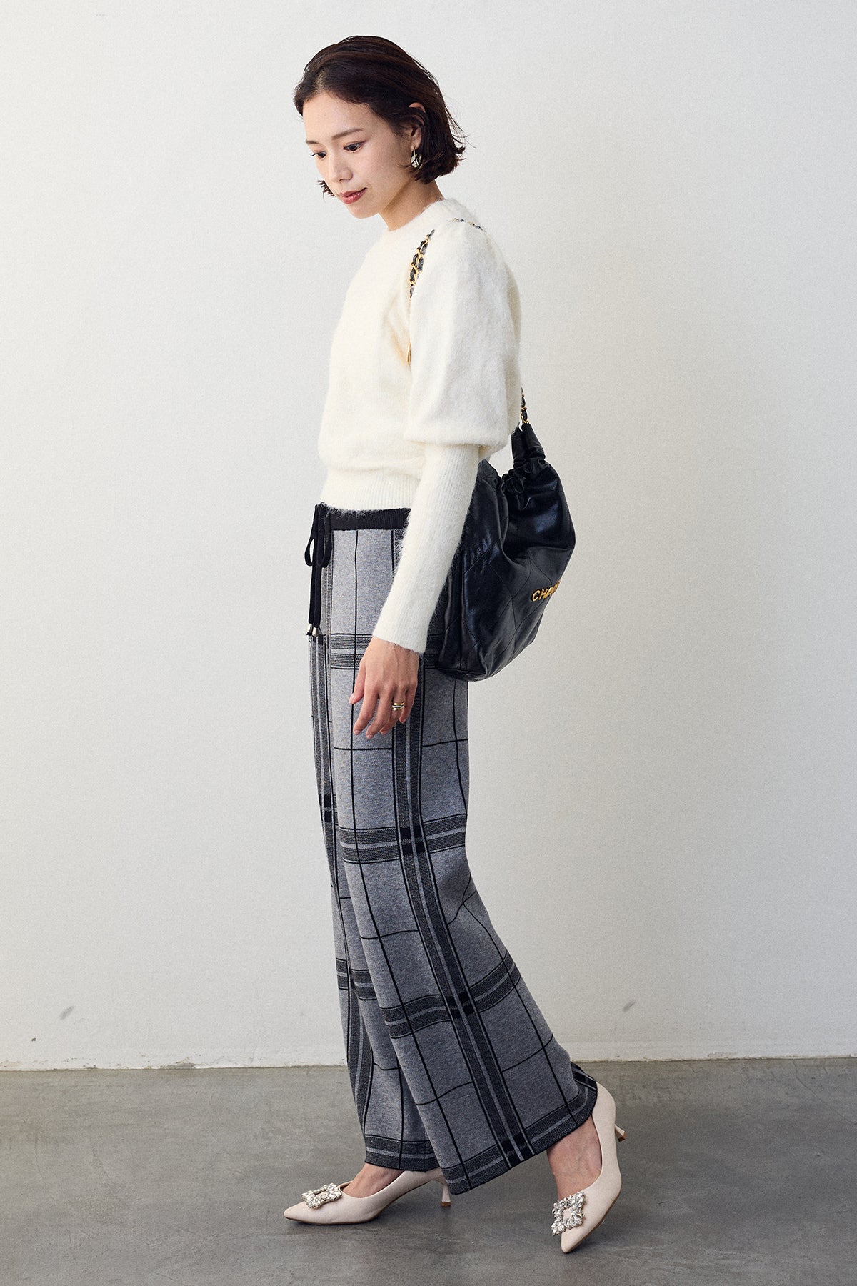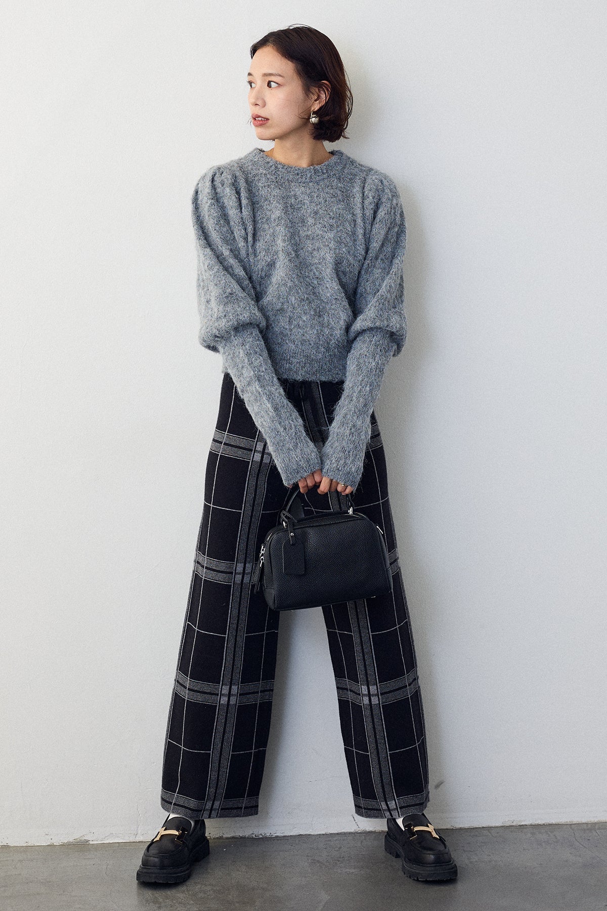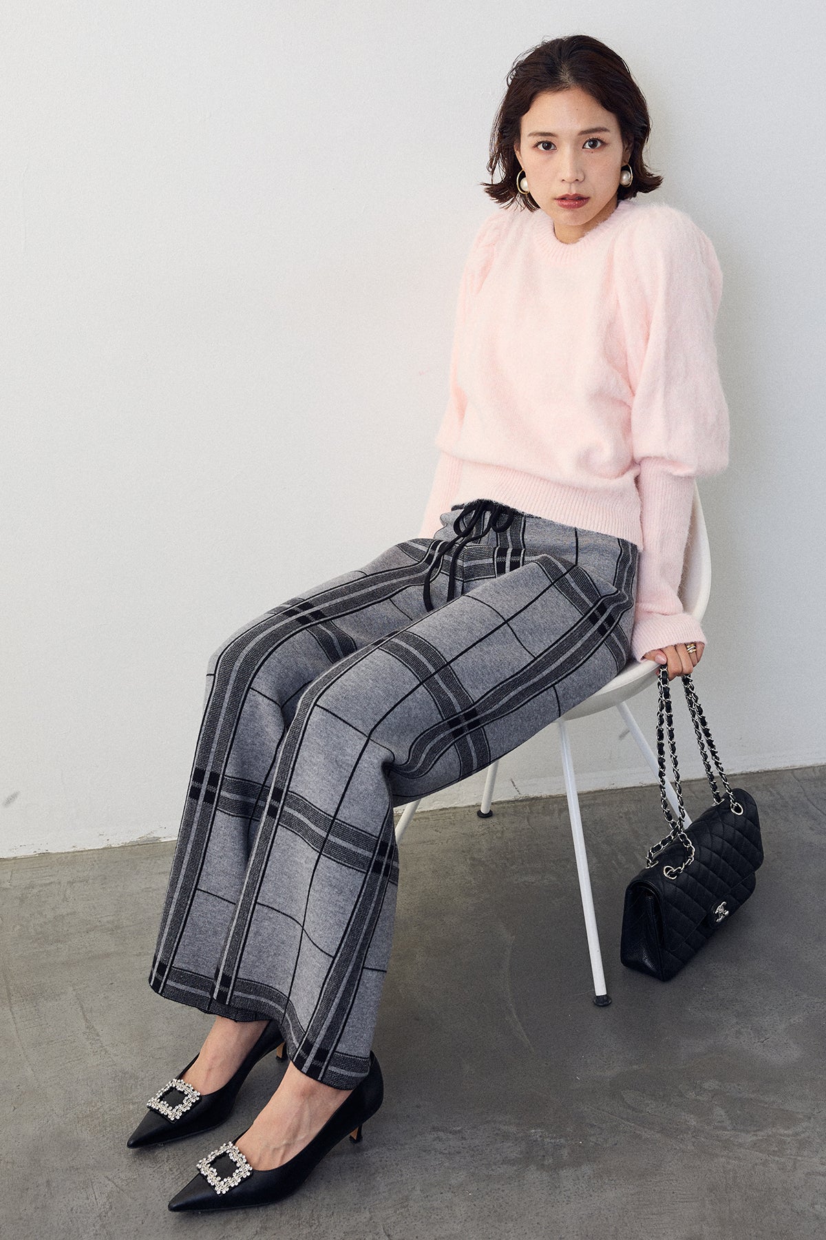 [予約/SET]モヘアパフスリーブプルオーバー+チェック柄ニットストレートパンツ(2set)