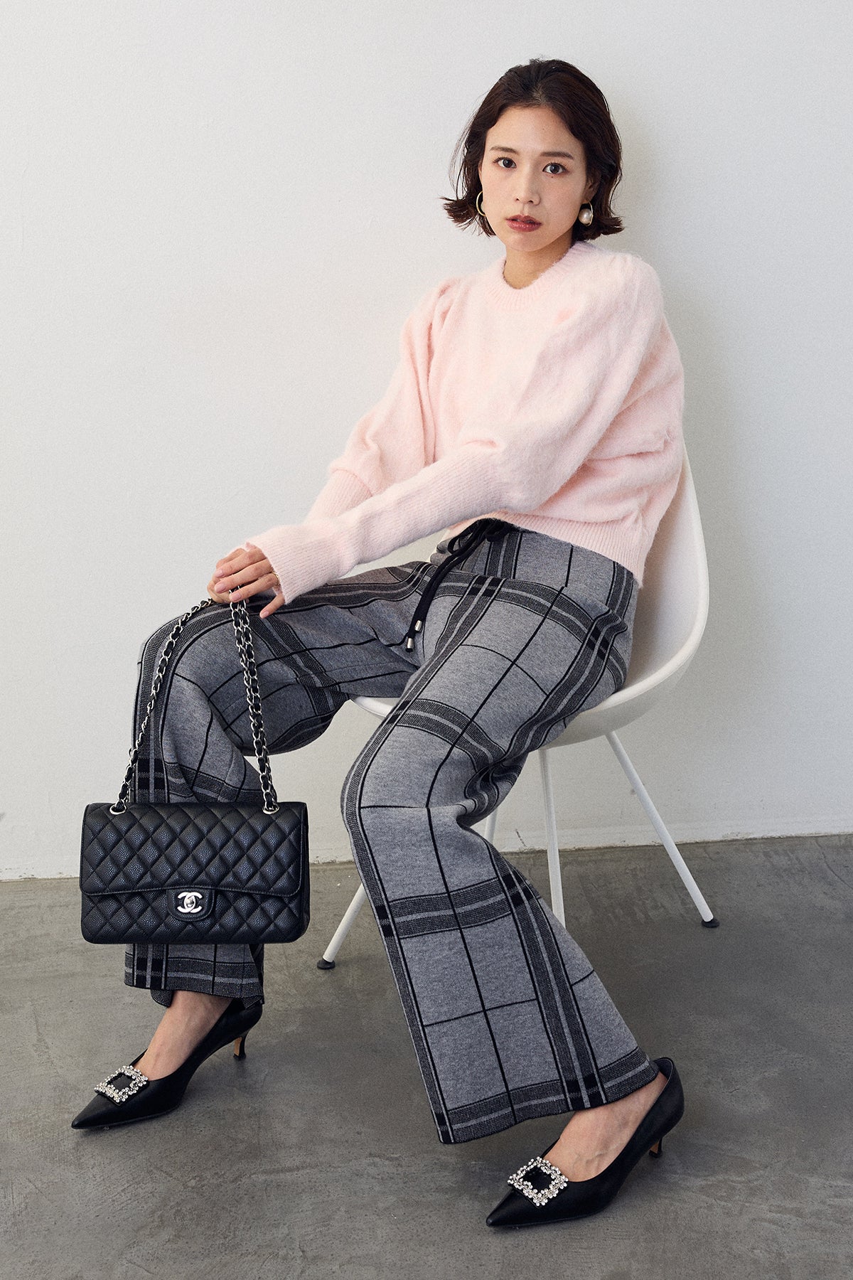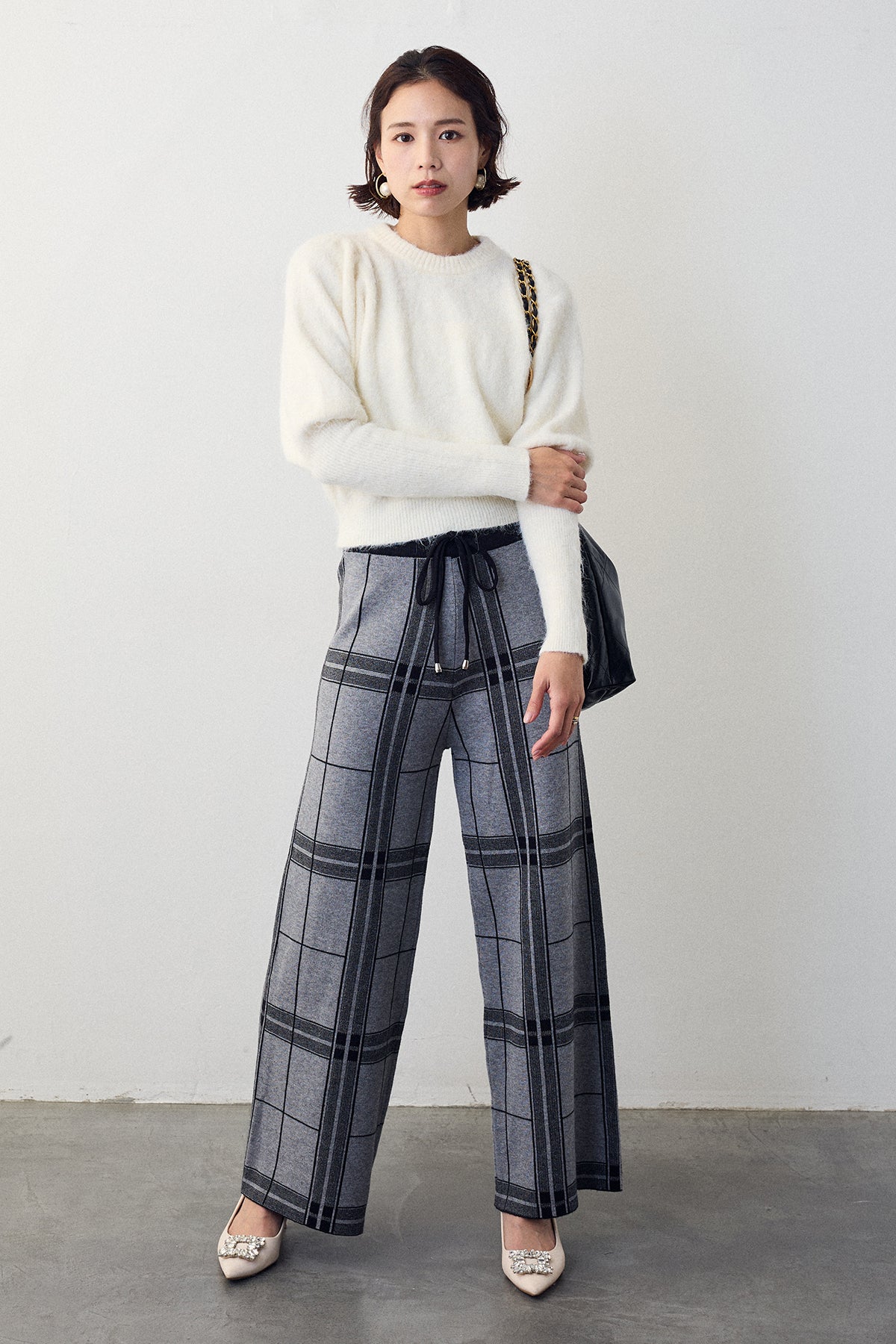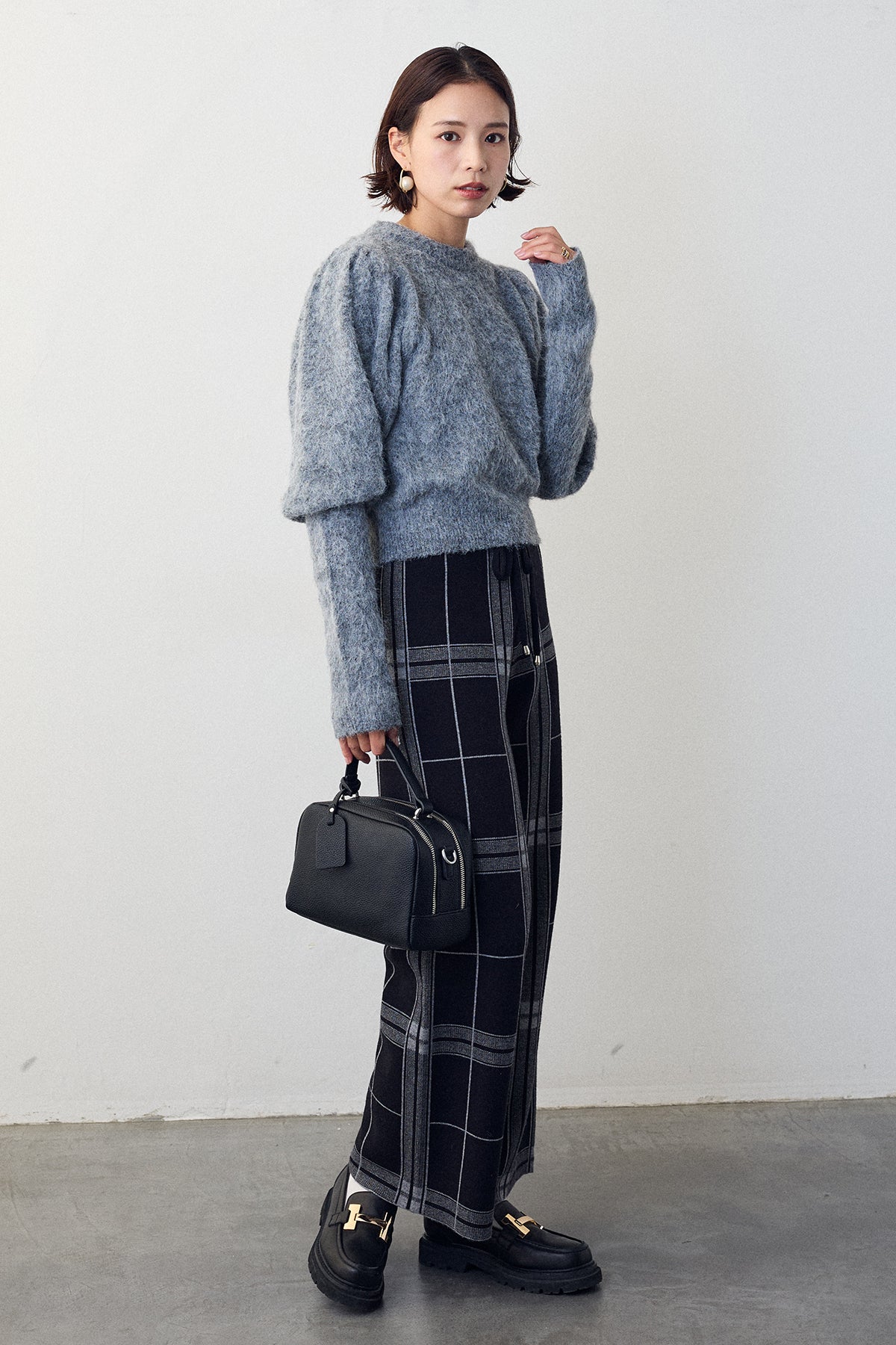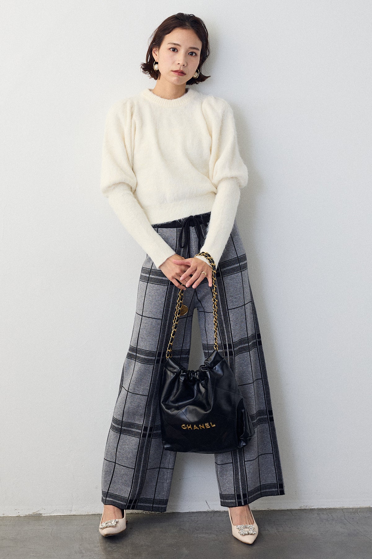 [予約/SET]モヘアパフスリーブプルオーバー+チェック柄ニットストレートパンツ(2set)