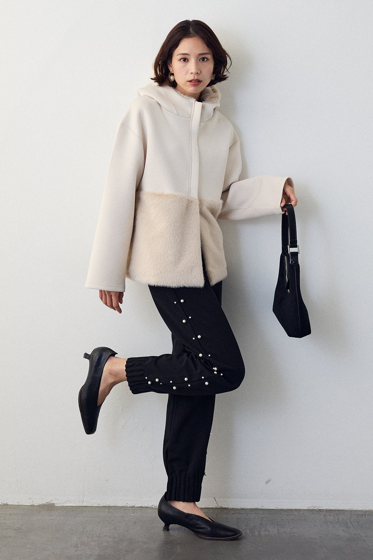 [予約/SET]ボンディングファーフーディー異素材ジャケット+サイドパール裾タックジョガーパンツ(2set)
