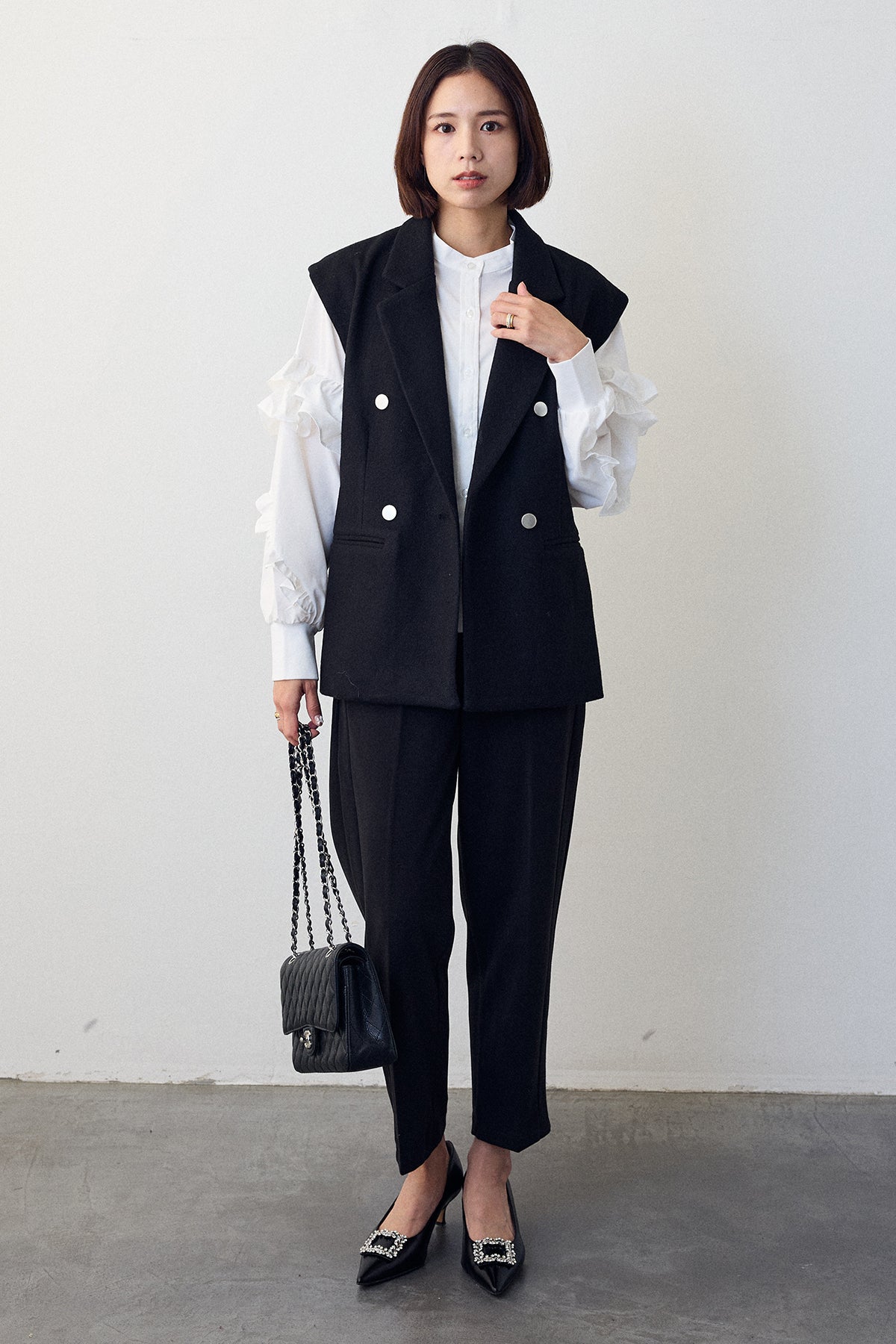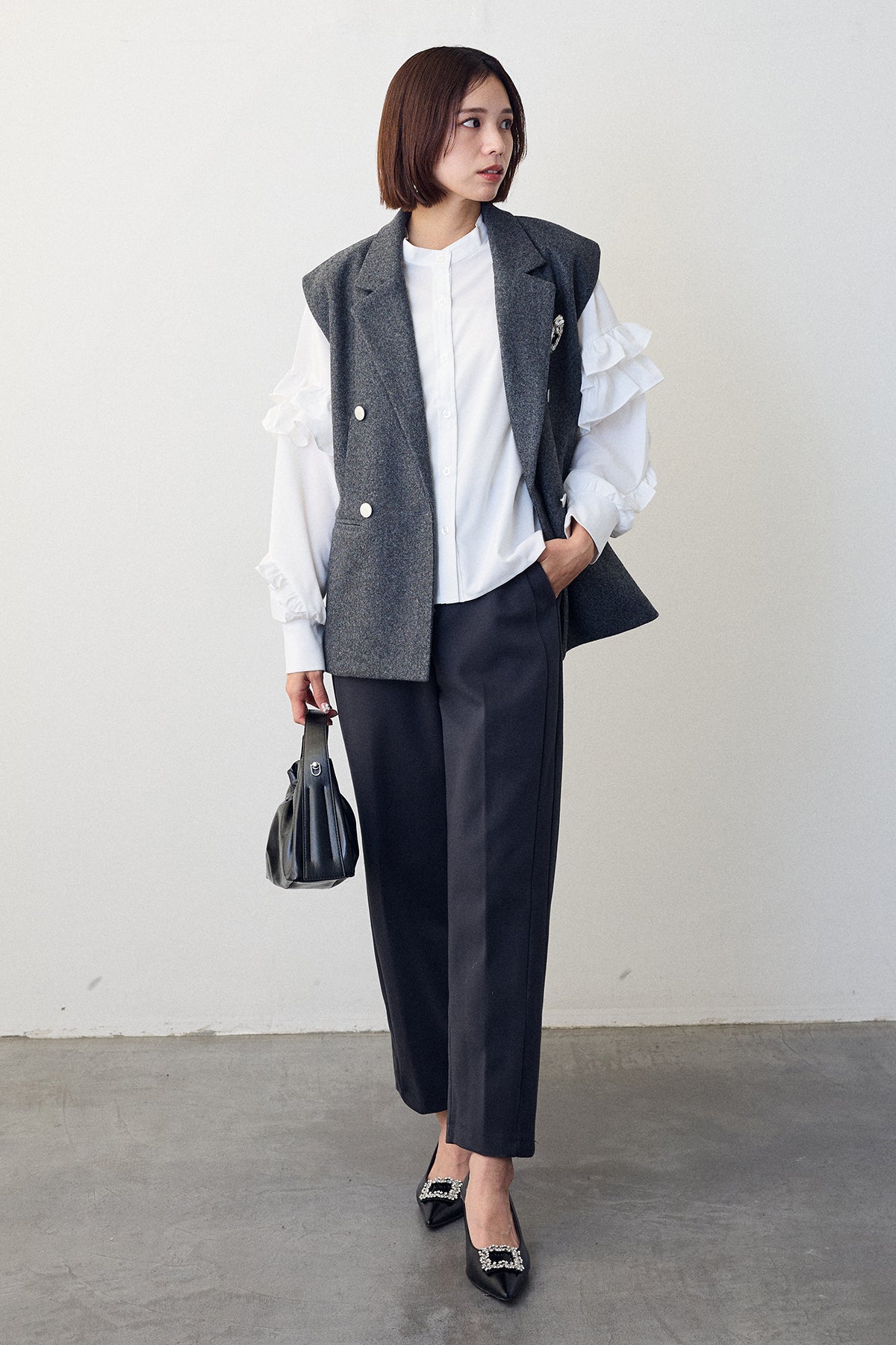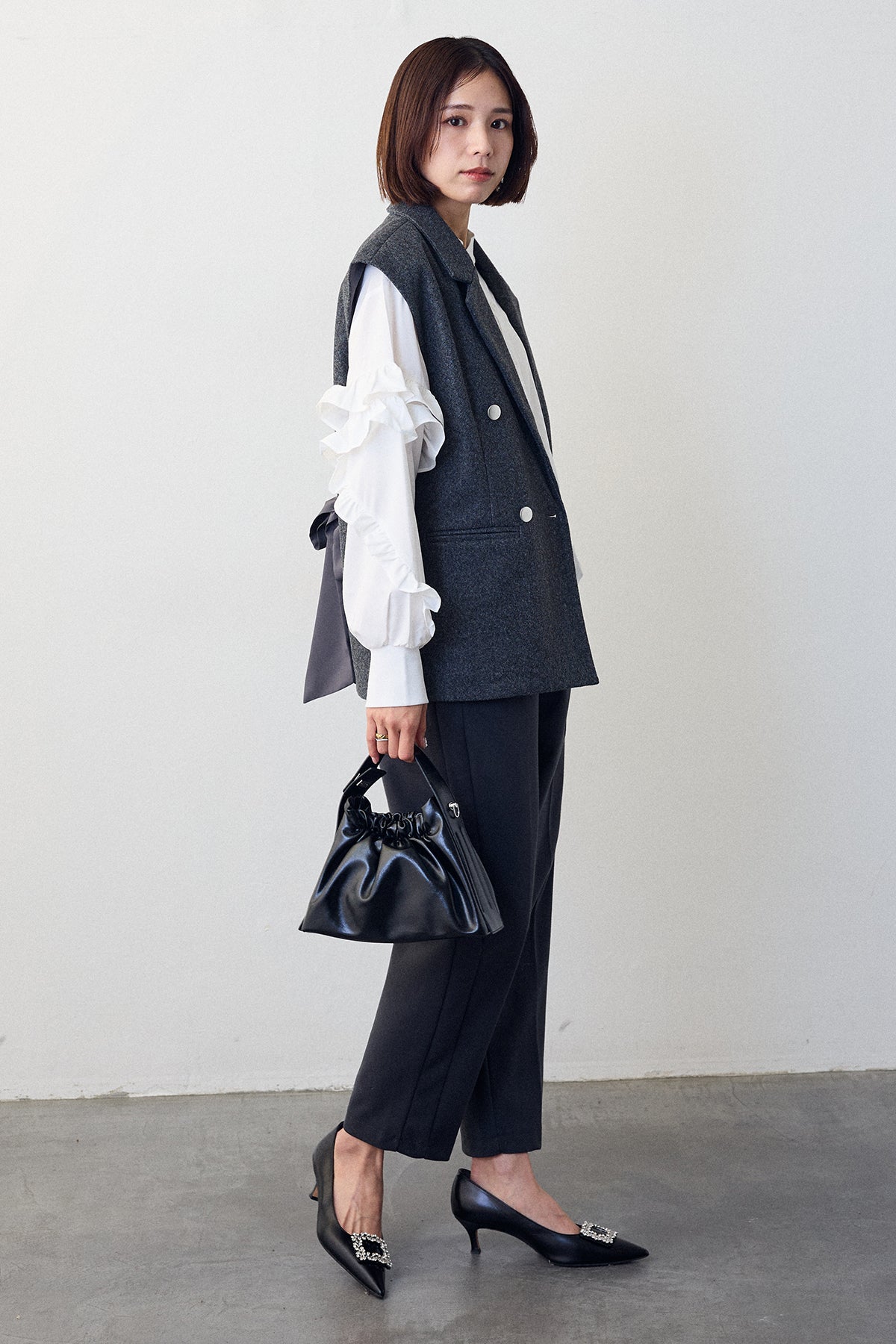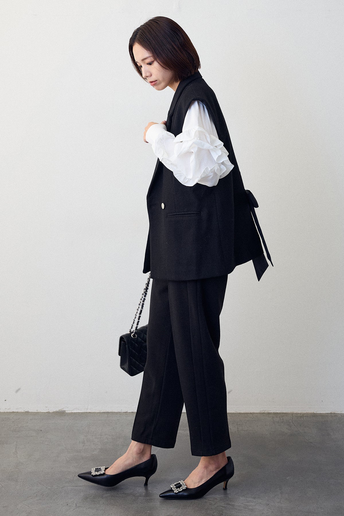 [予約/SET]スタンドカラーラッフルフリルスリーブブラウス+バックリボンテーラーベスト+ウォームセンタープレス美ラインテーパードパンツ(3set)