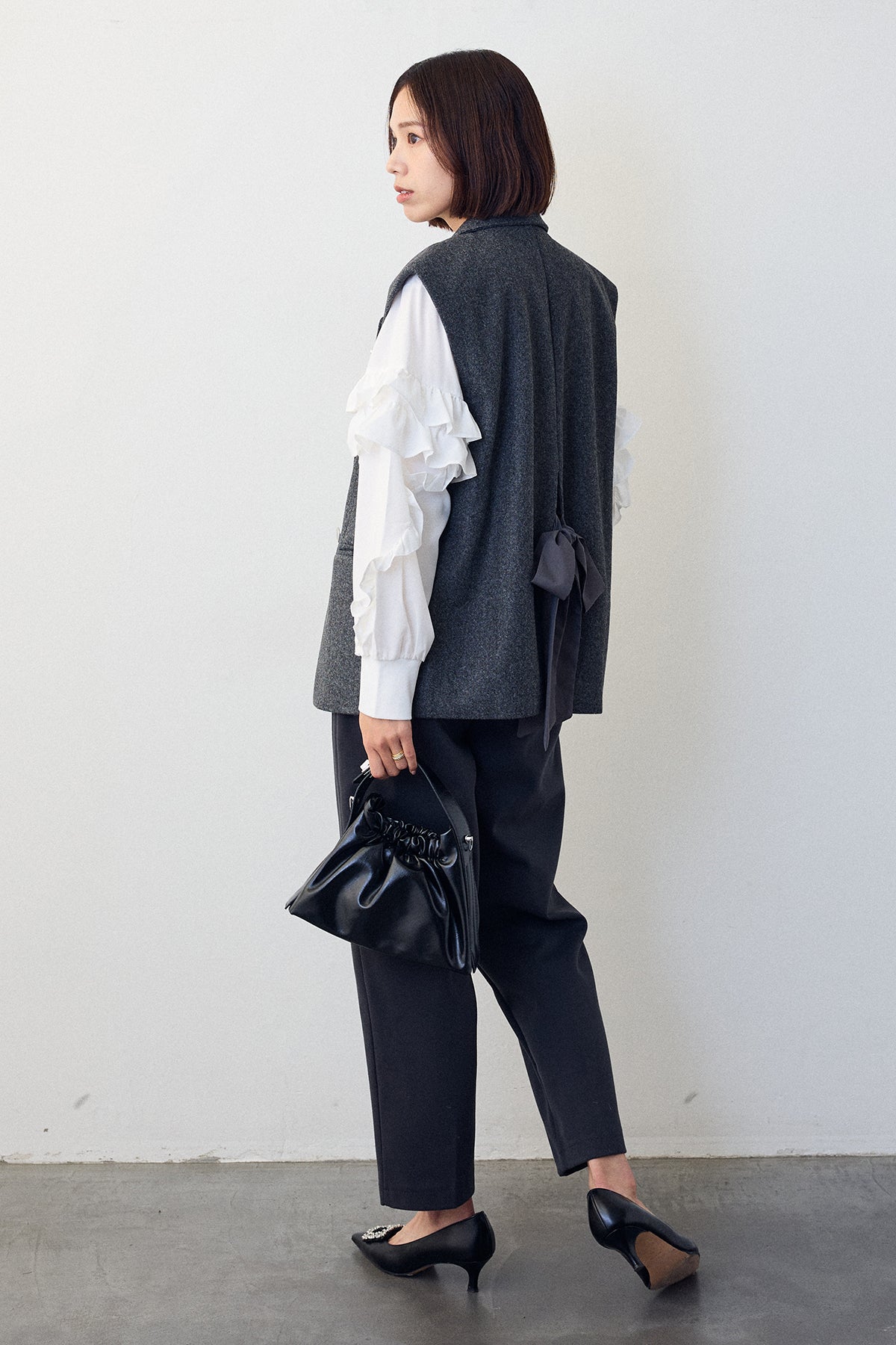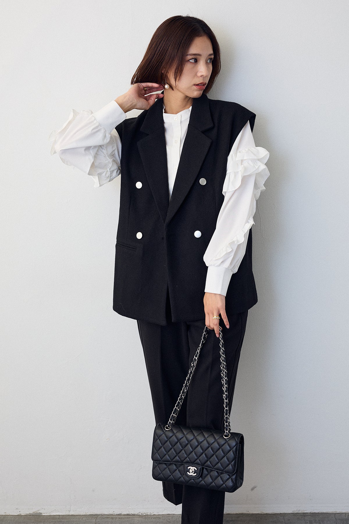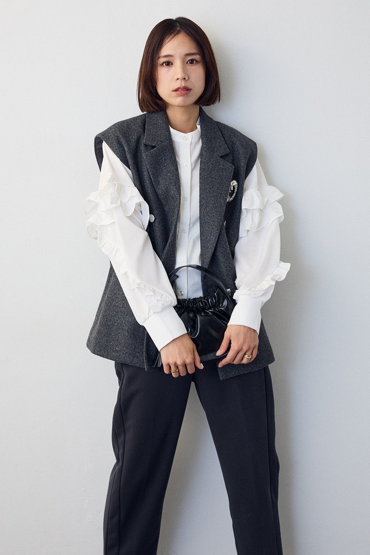 [予約/SET]スタンドカラーラッフルフリルスリーブブラウス+バックリボンテーラーベスト+ウォームセンタープレス美ラインテーパードパンツ(3set)