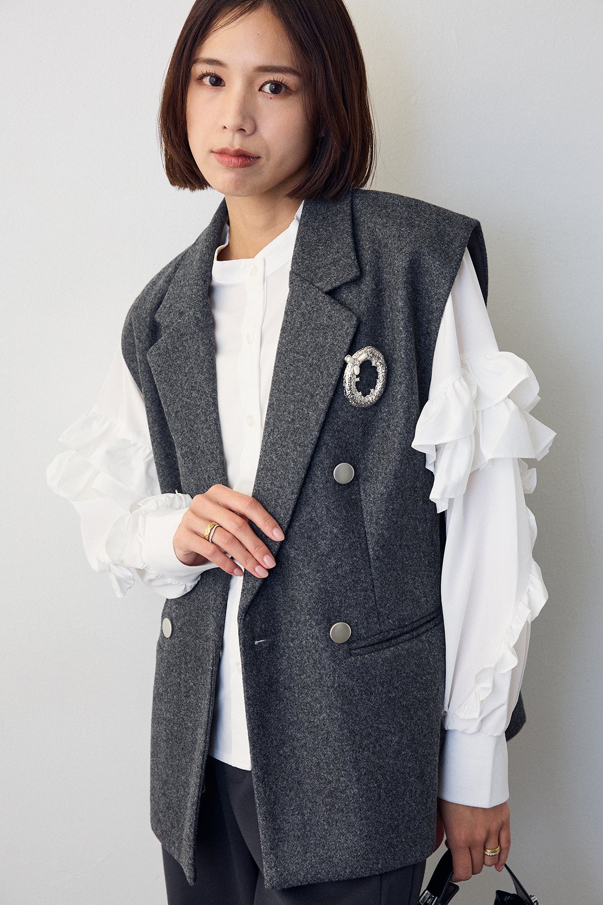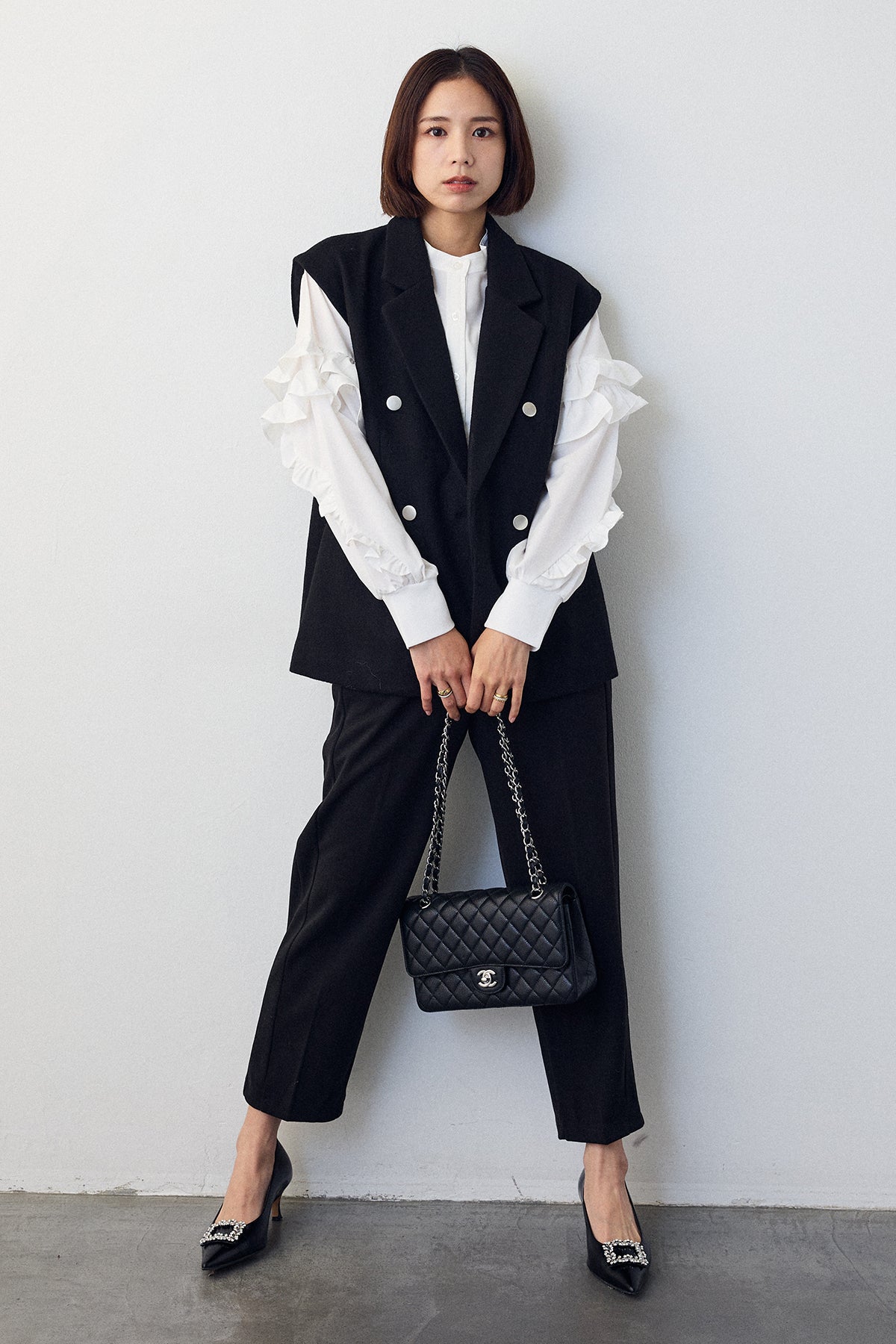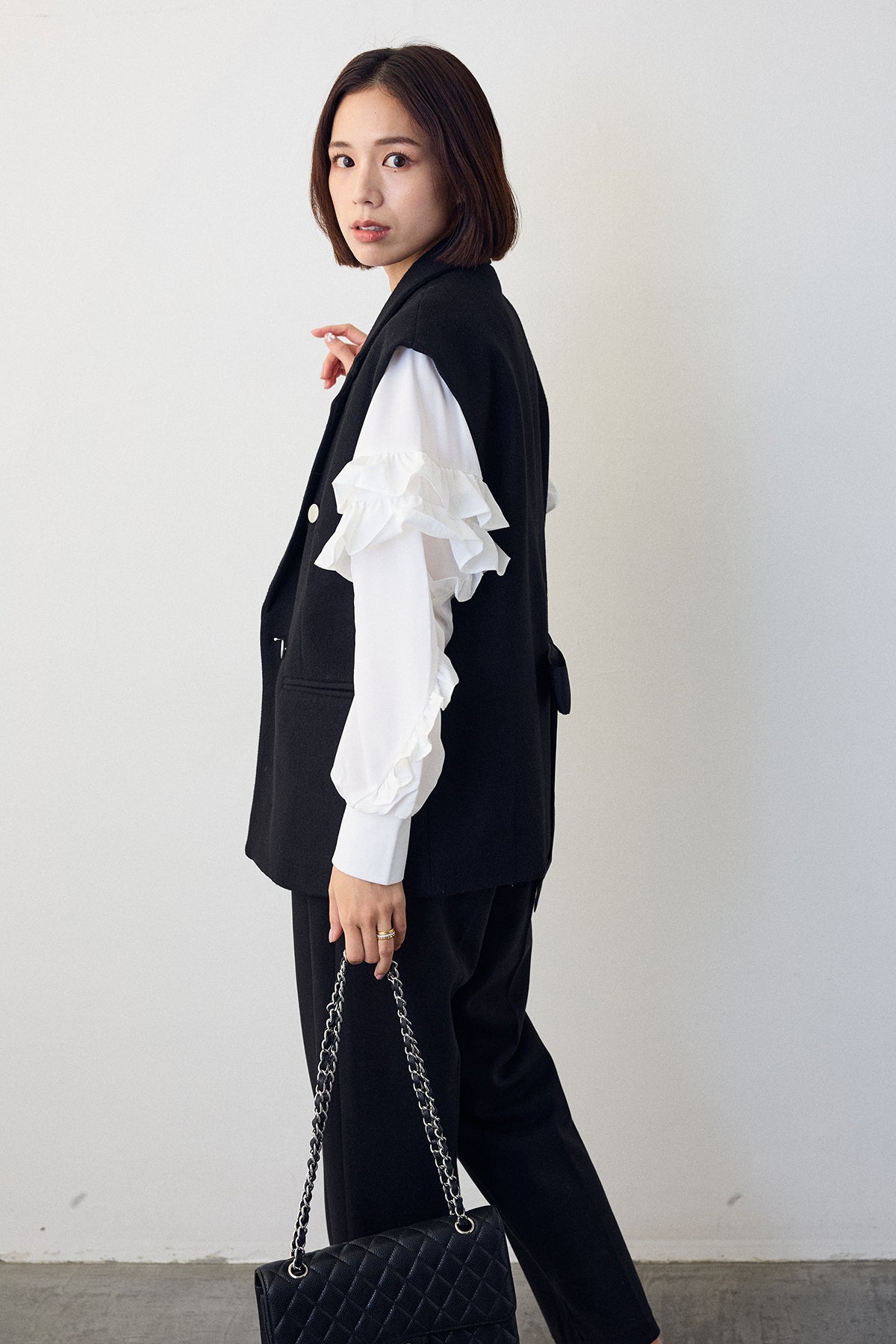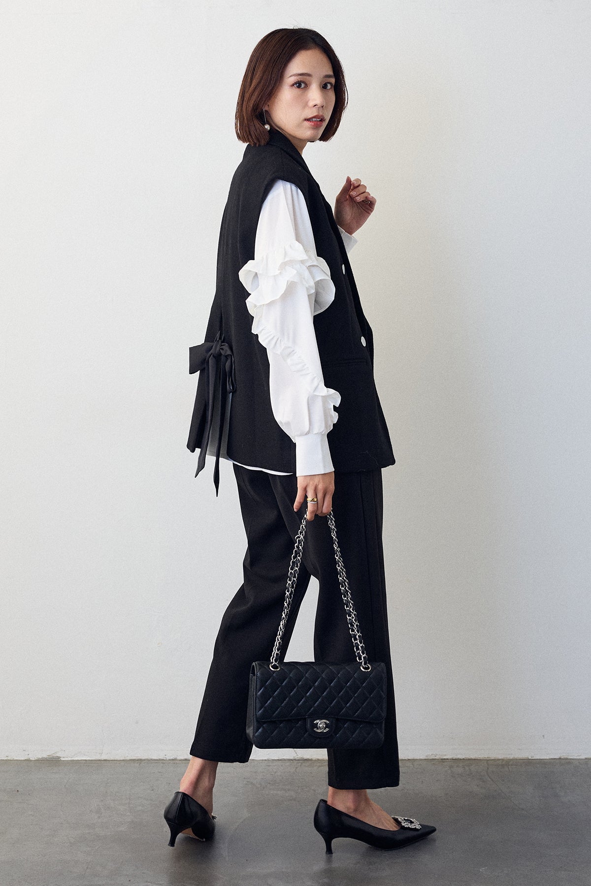 [予約/SET]スタンドカラーラッフルフリルスリーブブラウス+バックリボンテーラーベスト+ウォームセンタープレス美ラインテーパードパンツ(3set)
