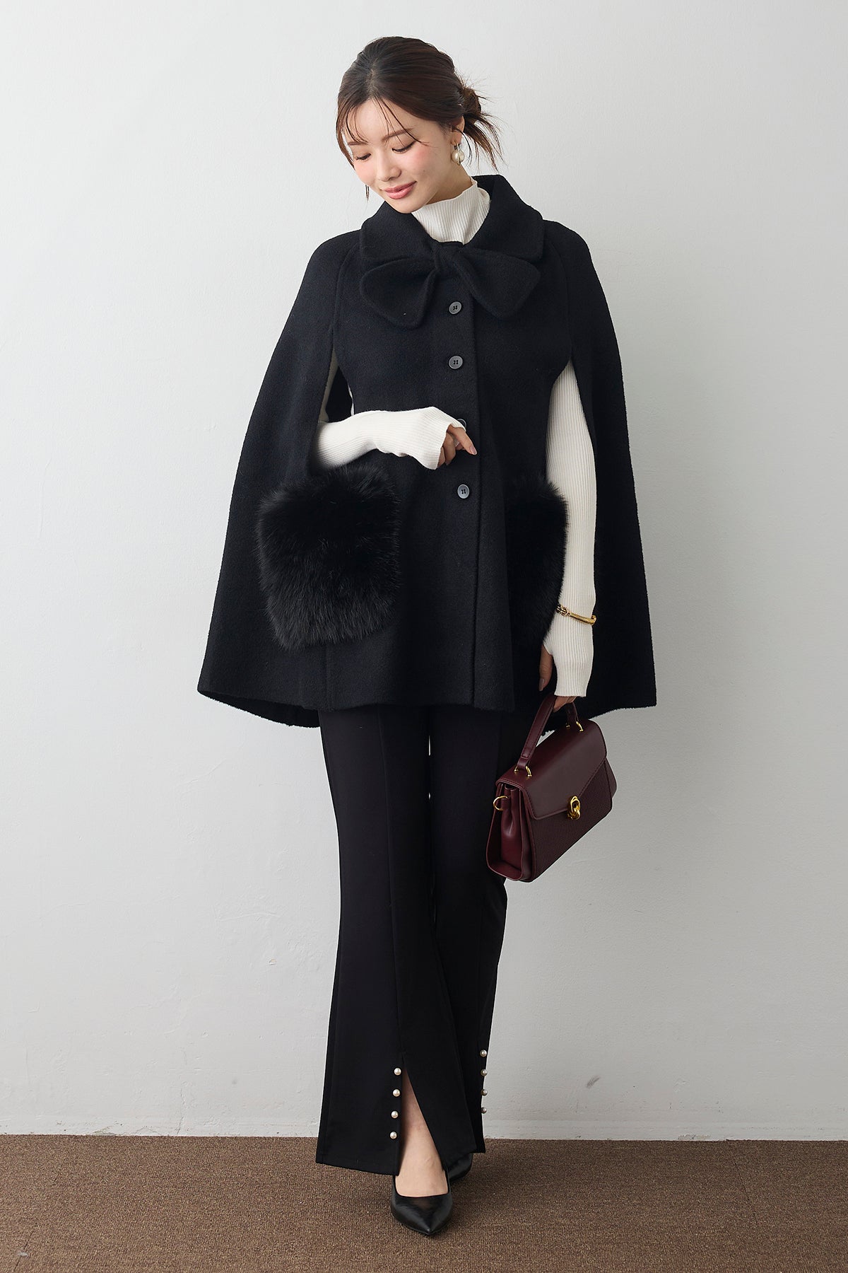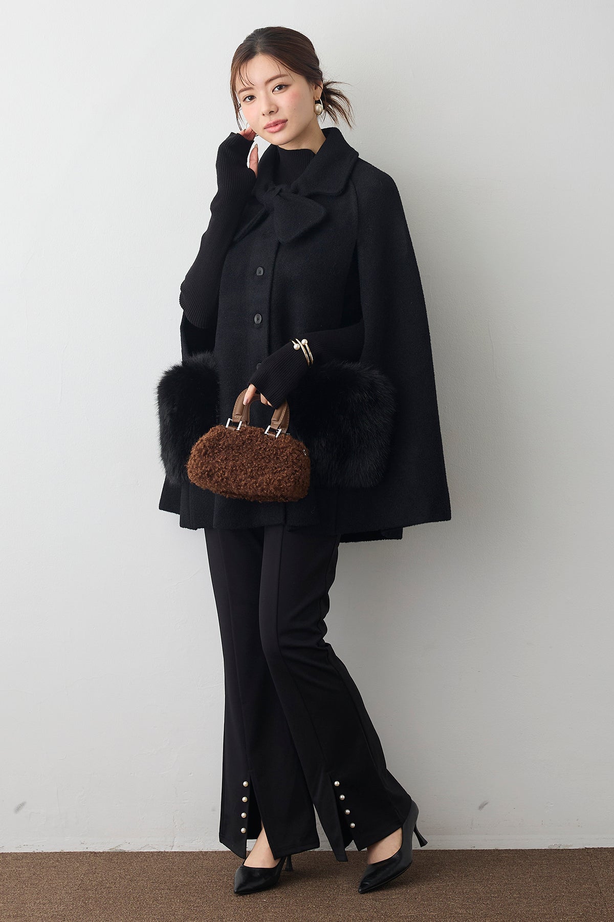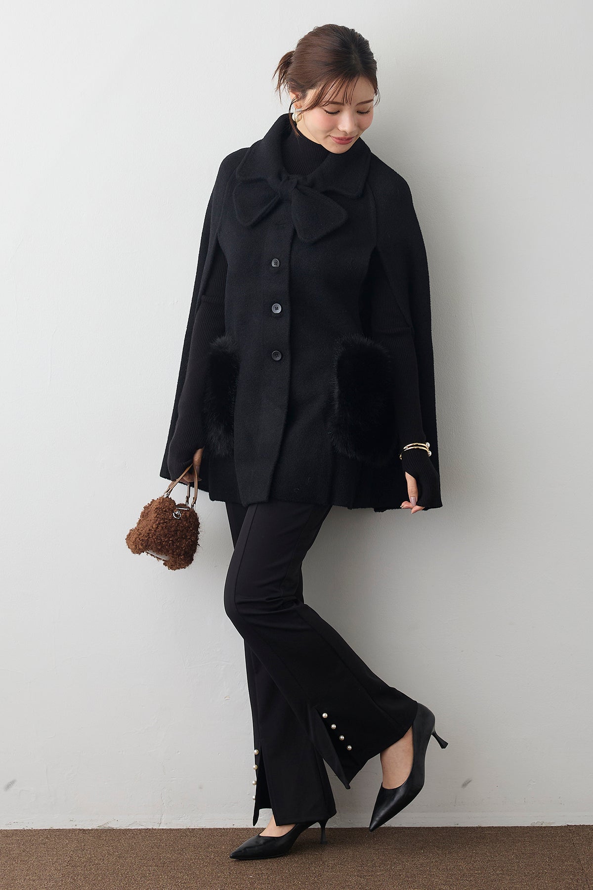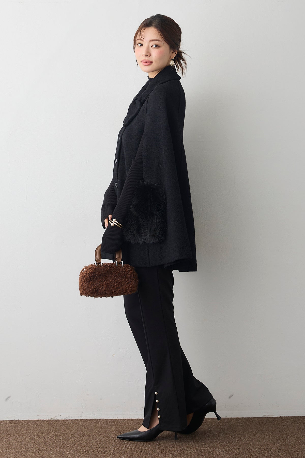 [予約/SET]ベーシックフィンガーホールリブニット+ウールタッチファーポケットポンチョコート+センタースリットパールパンツ(3set)