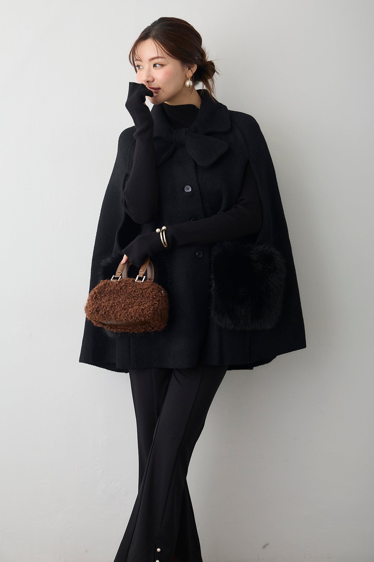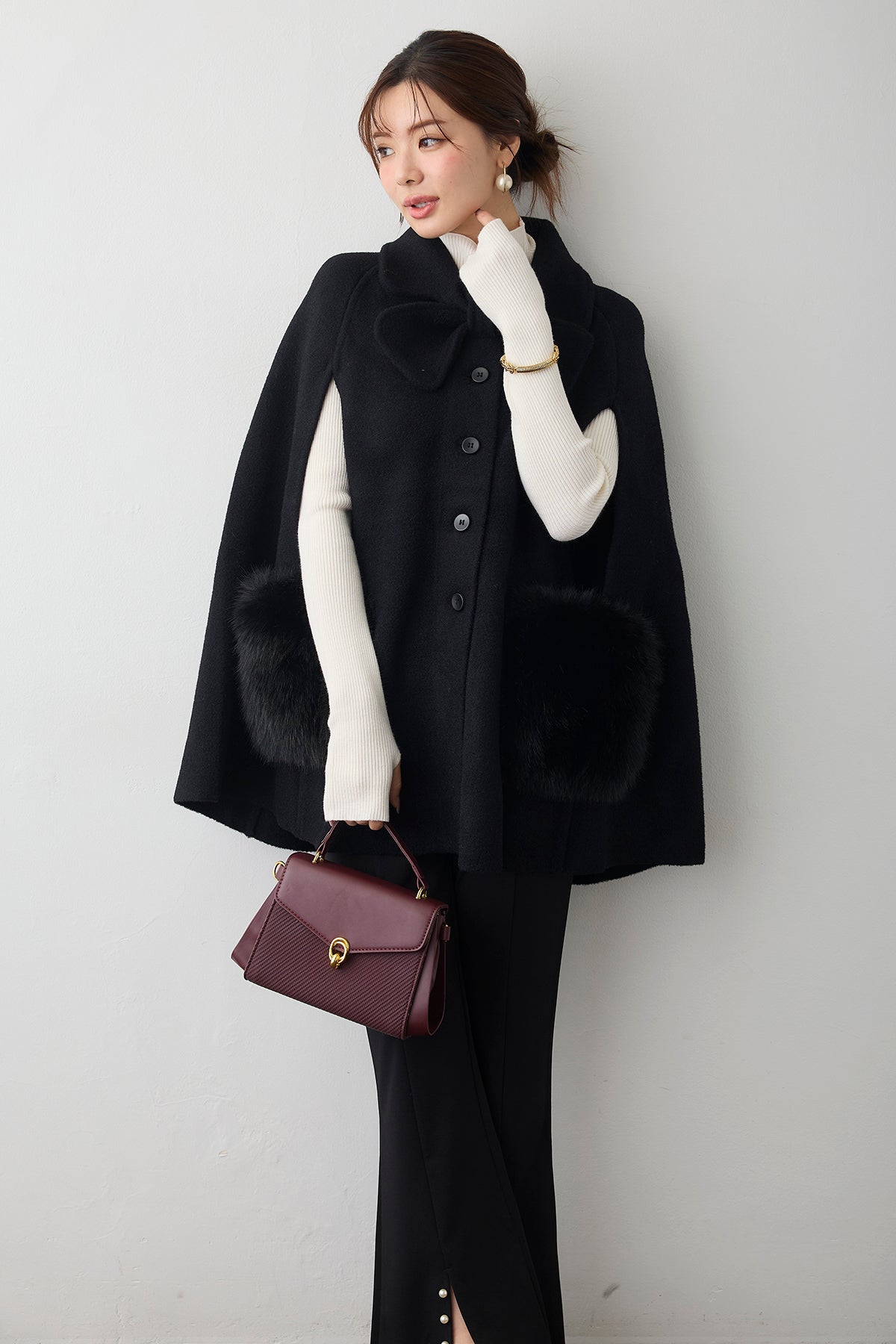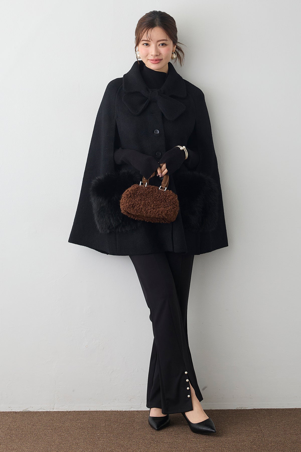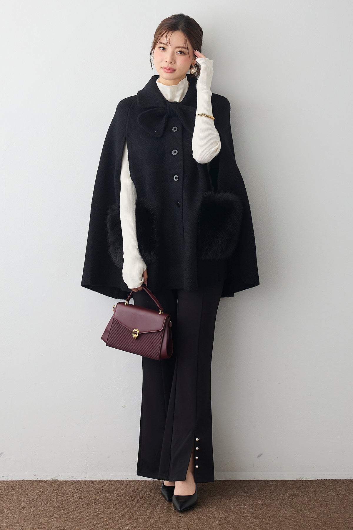 [予約/SET]ベーシックフィンガーホールリブニット+ウールタッチファーポケットポンチョコート+センタースリットパールパンツ(3set)