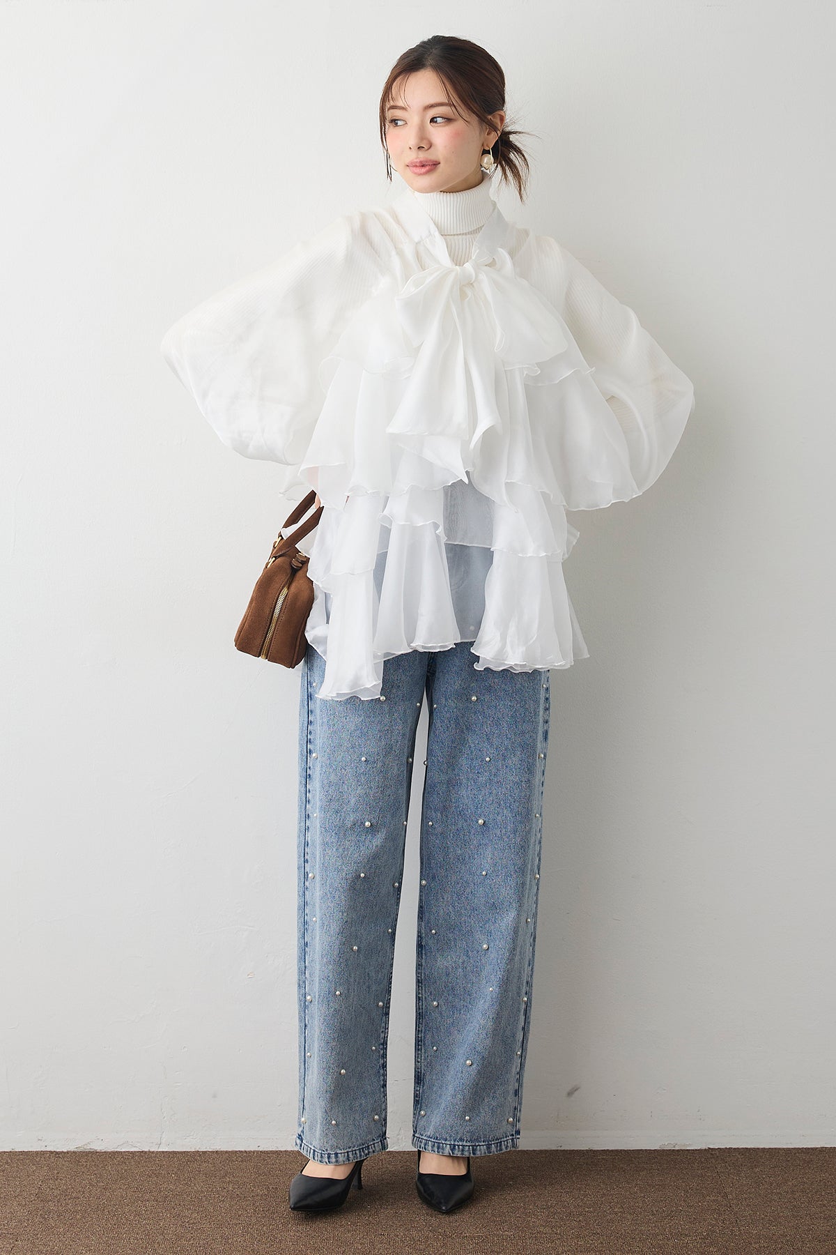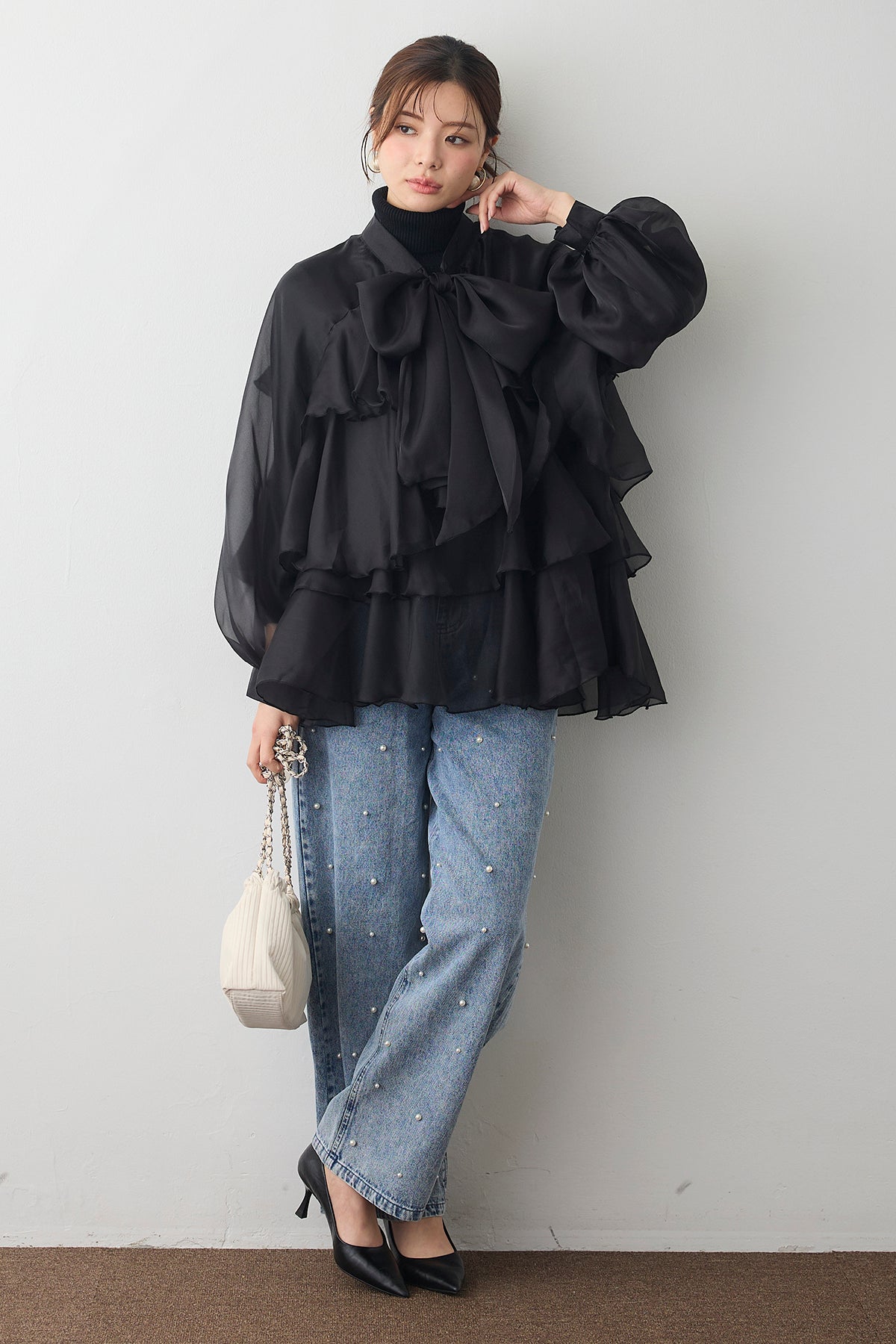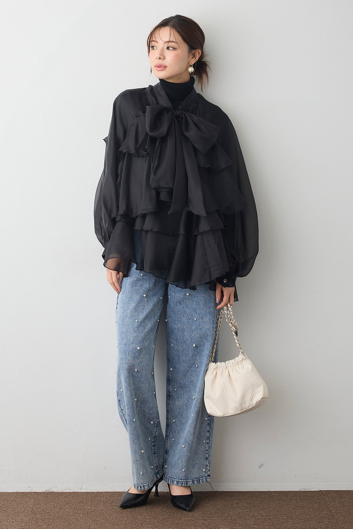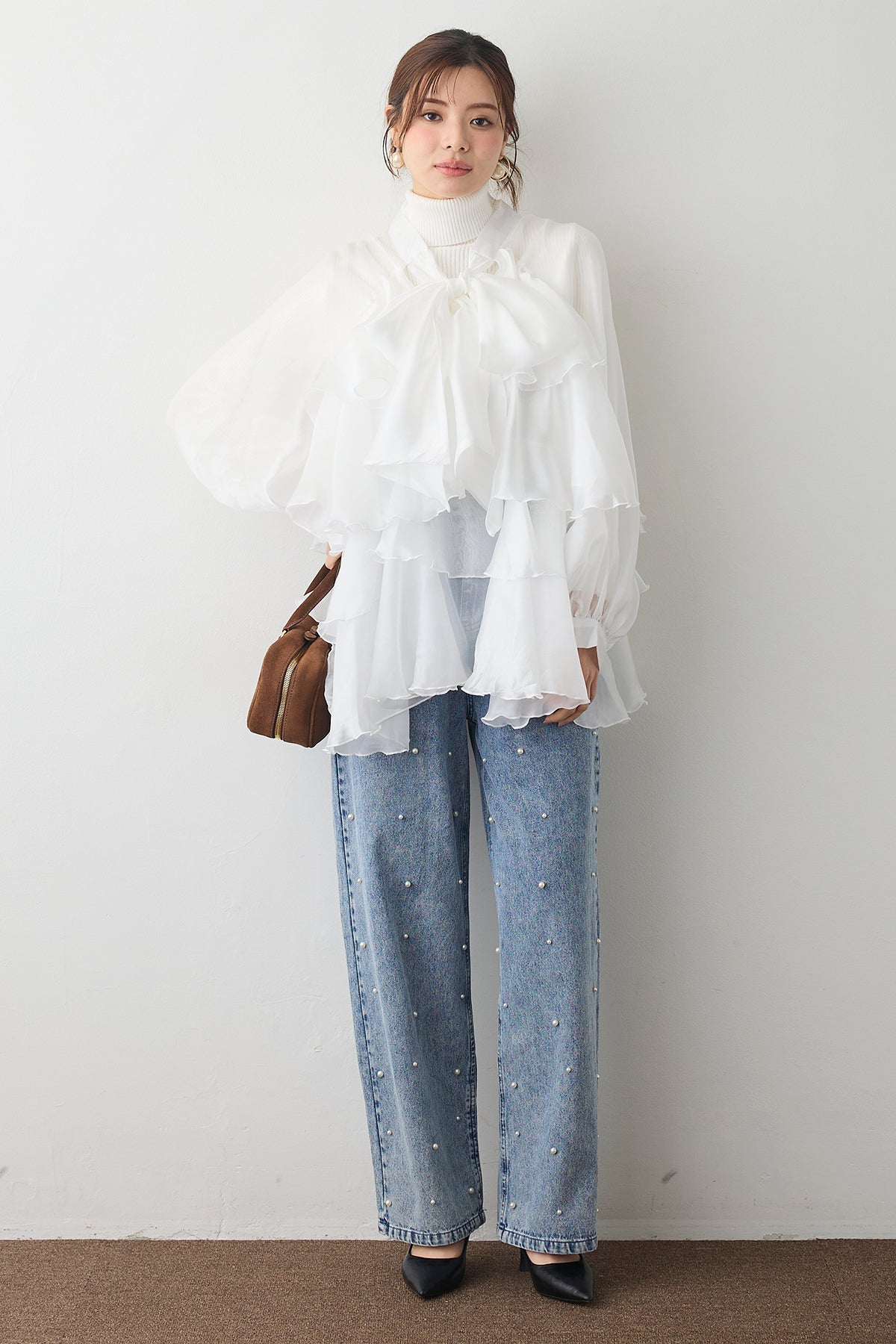 [予約/SET]フロントBIGリボンティアードエアリーチュニック+パールスタッズストレートハイウエストデニム(2set)