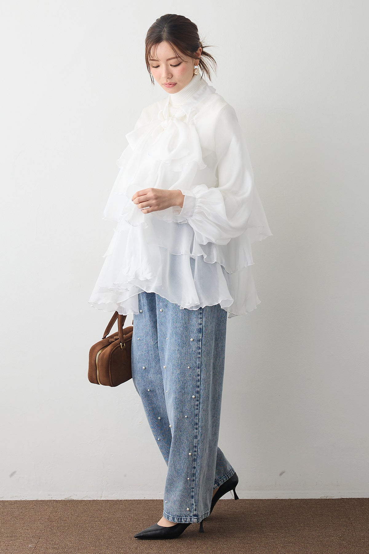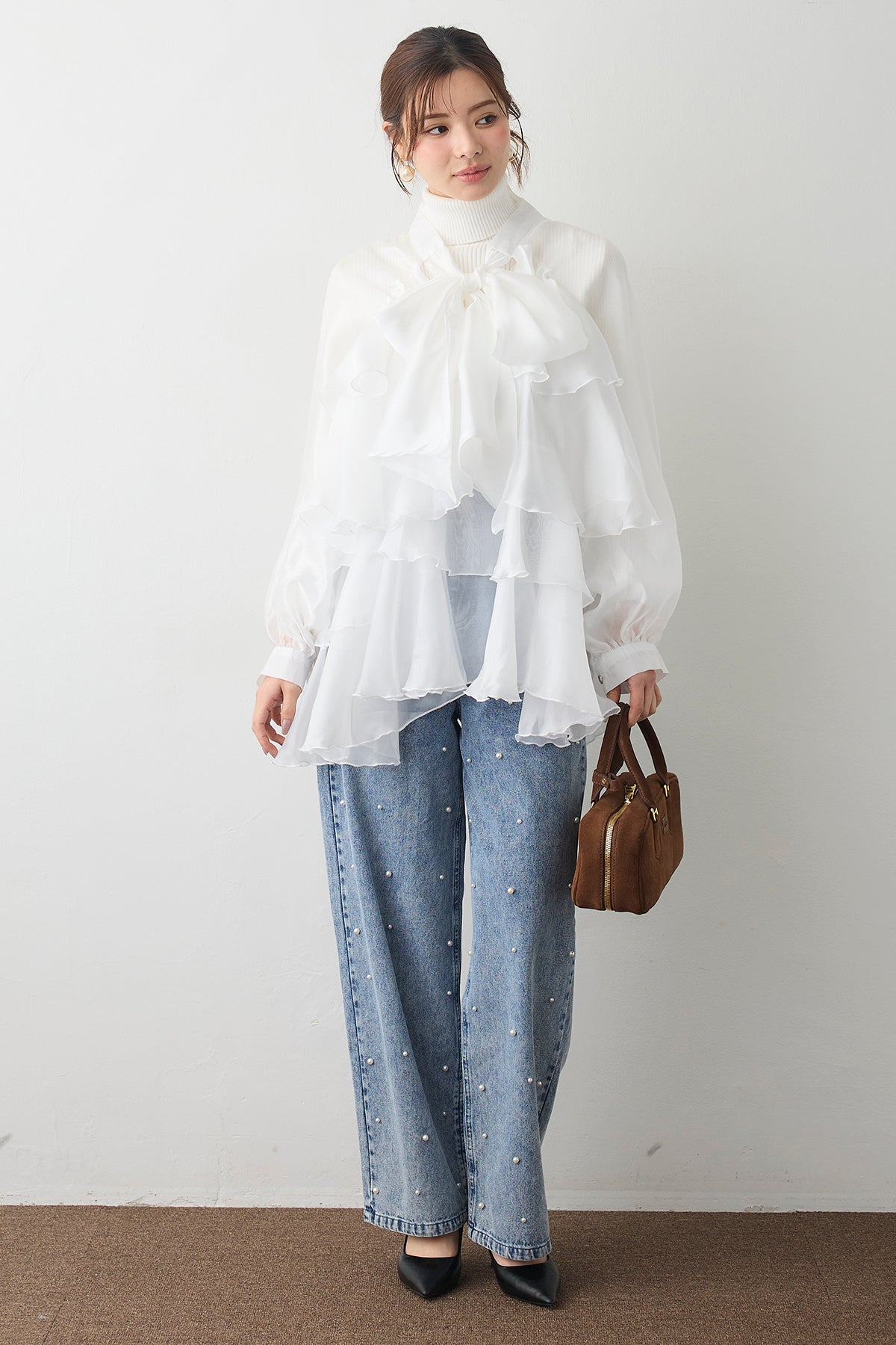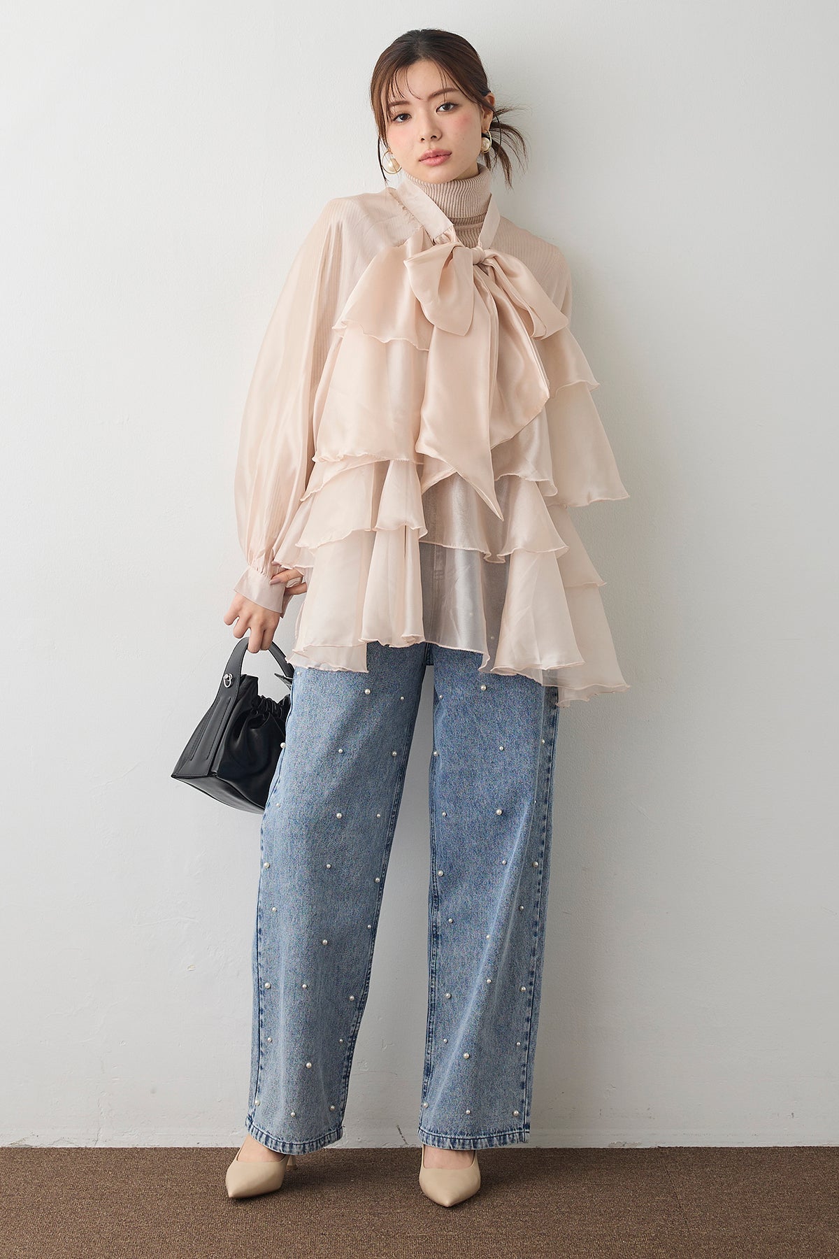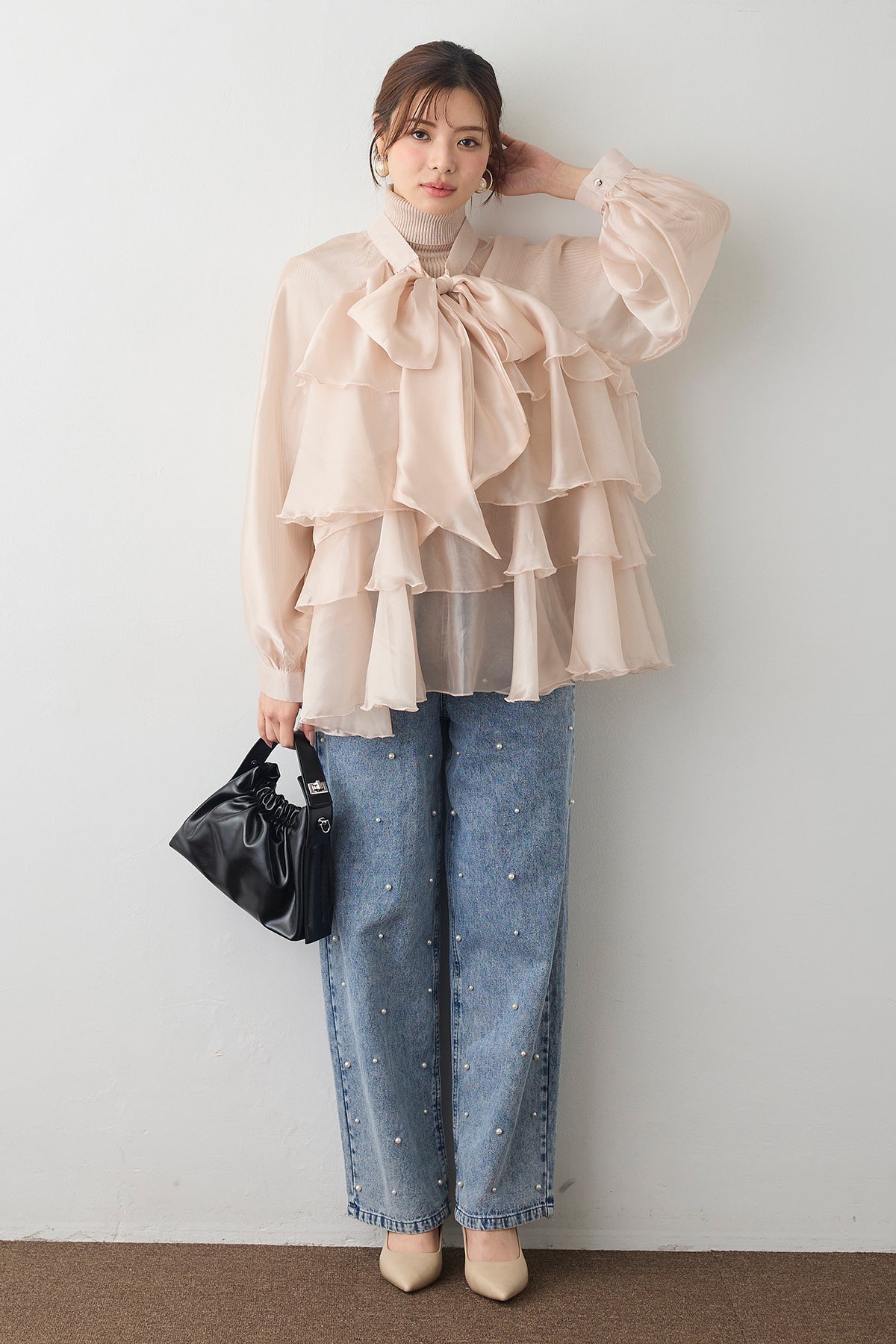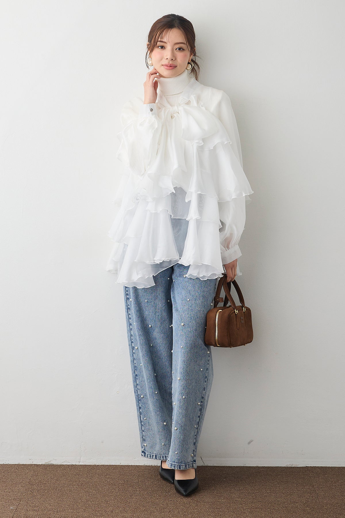 [予約/SET]フロントBIGリボンティアードエアリーチュニック+パールスタッズストレートハイウエストデニム(2set)