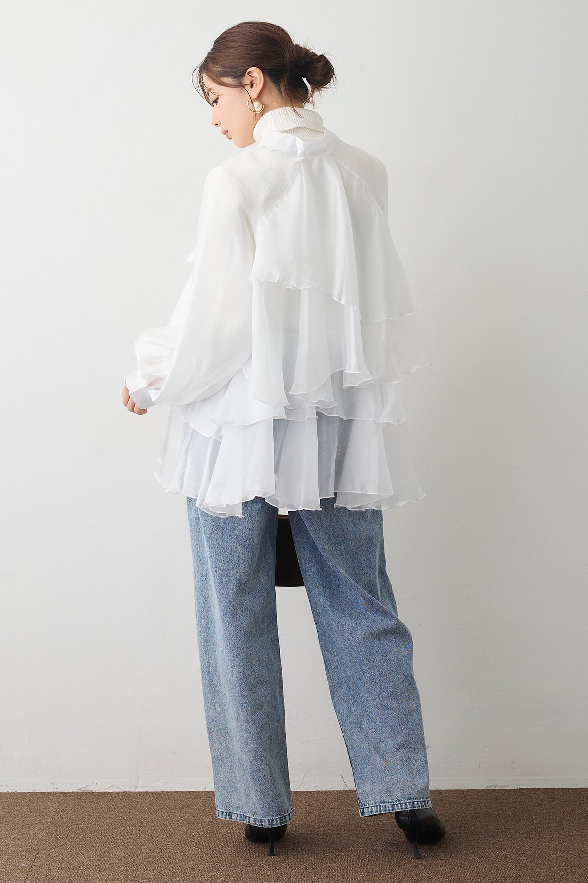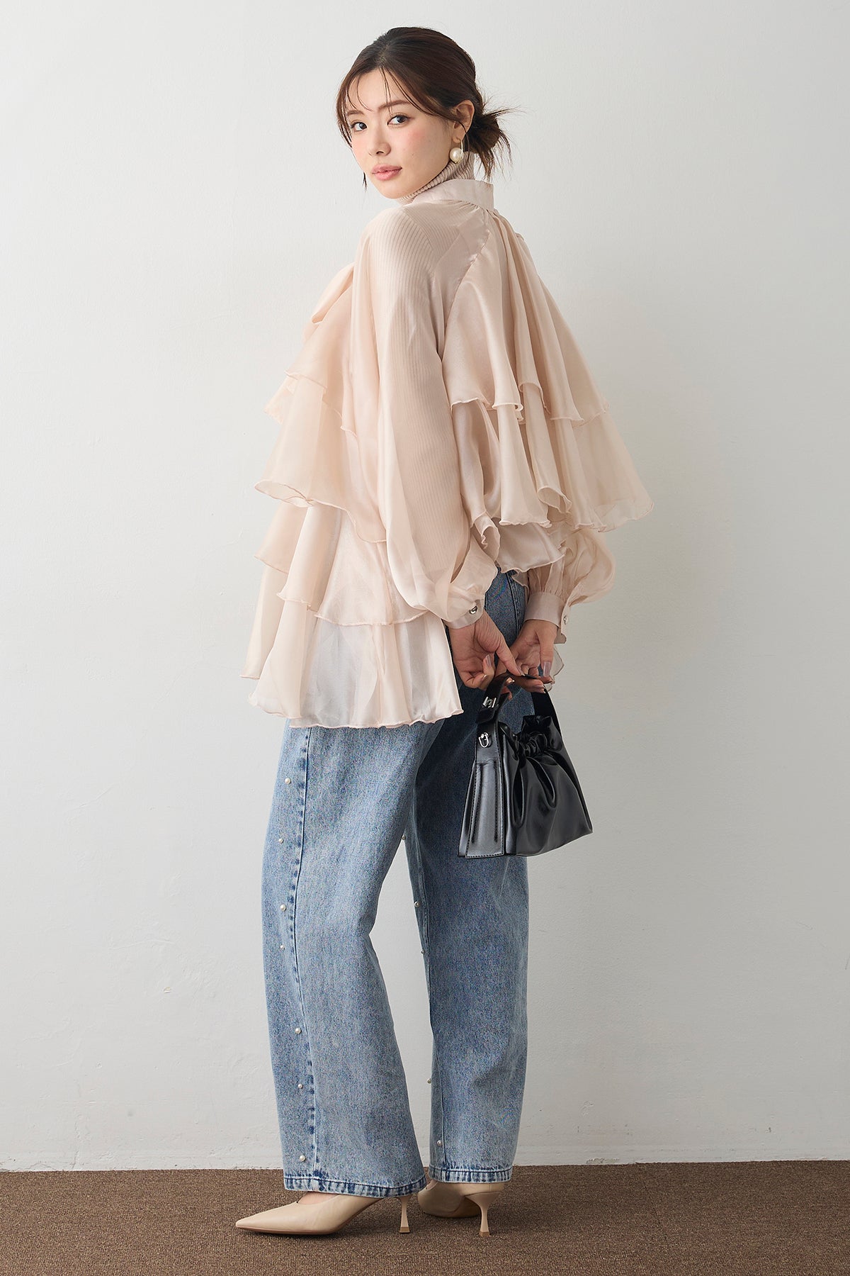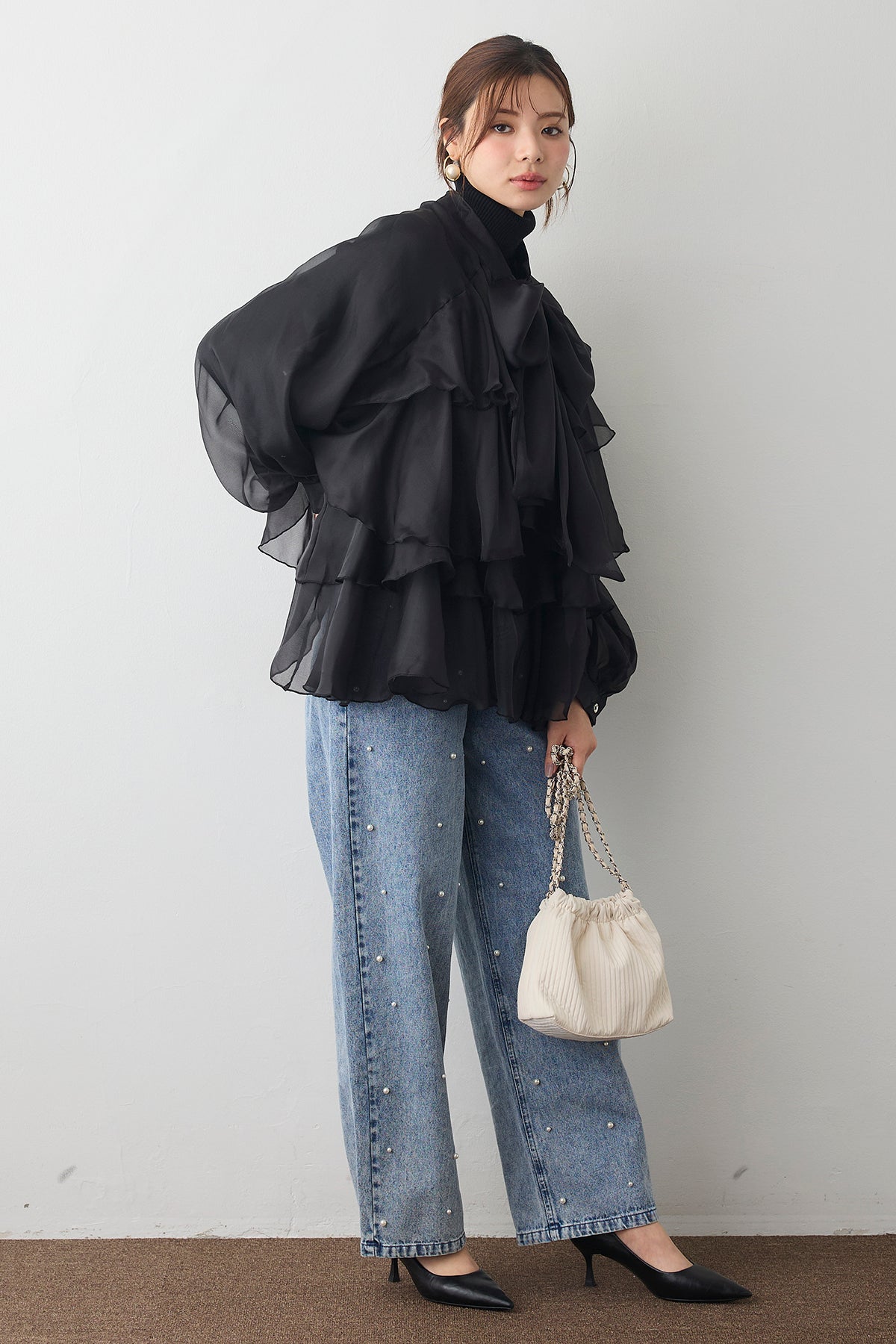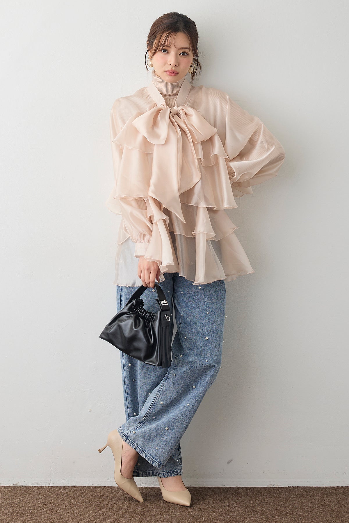 [予約/SET]フロントBIGリボンティアードエアリーチュニック+パールスタッズストレートハイウエストデニム(2set)