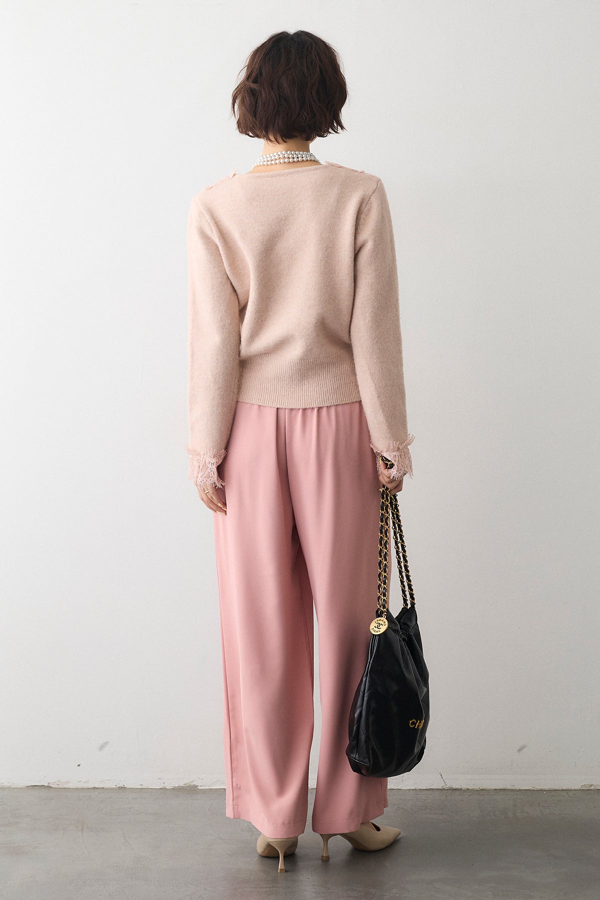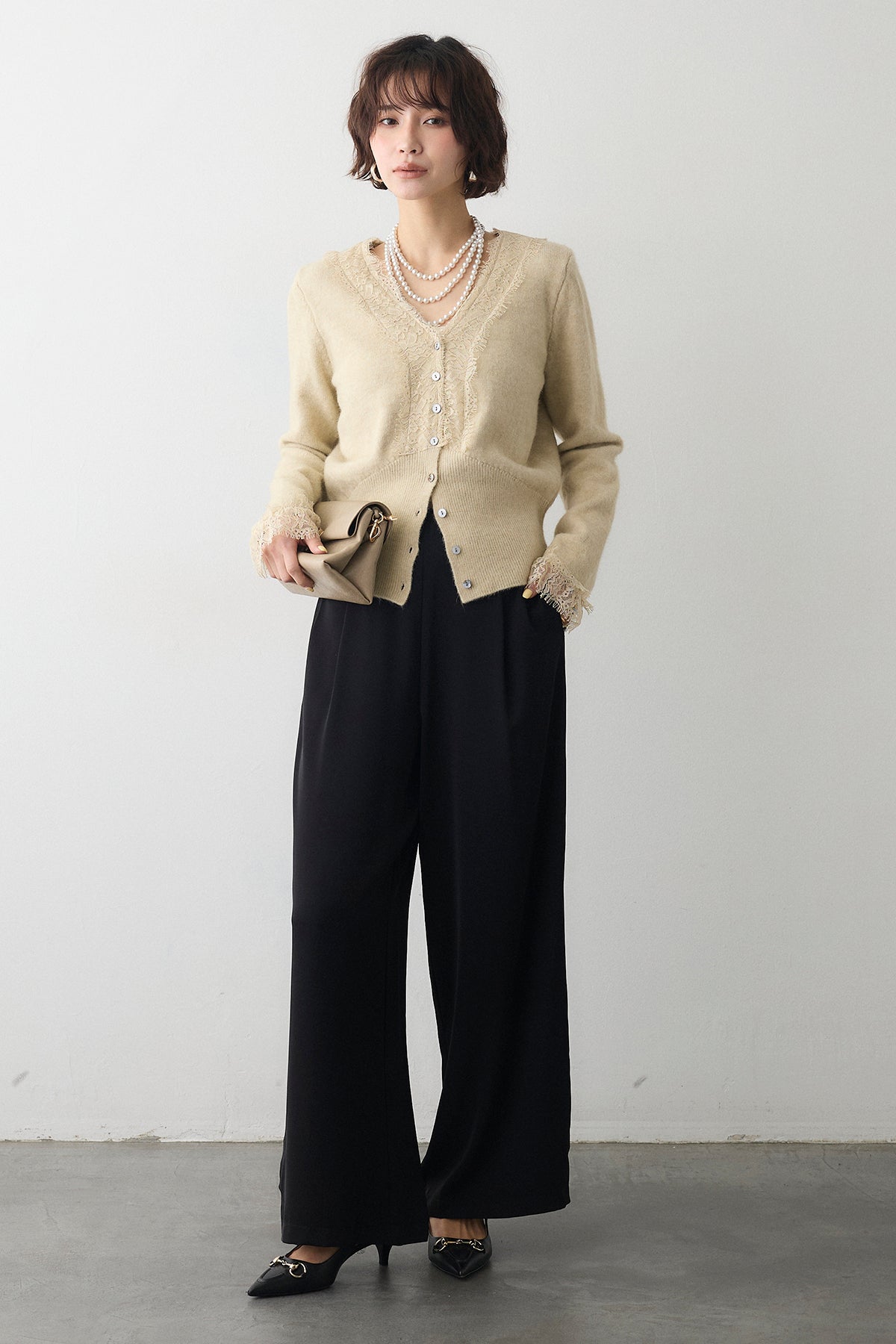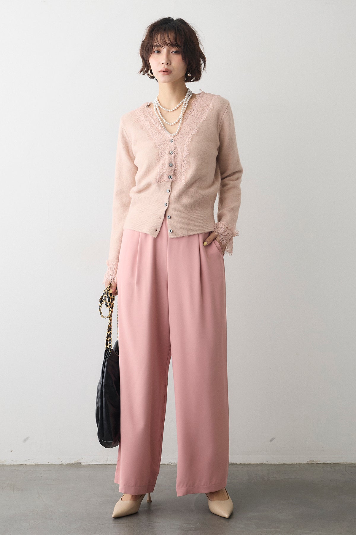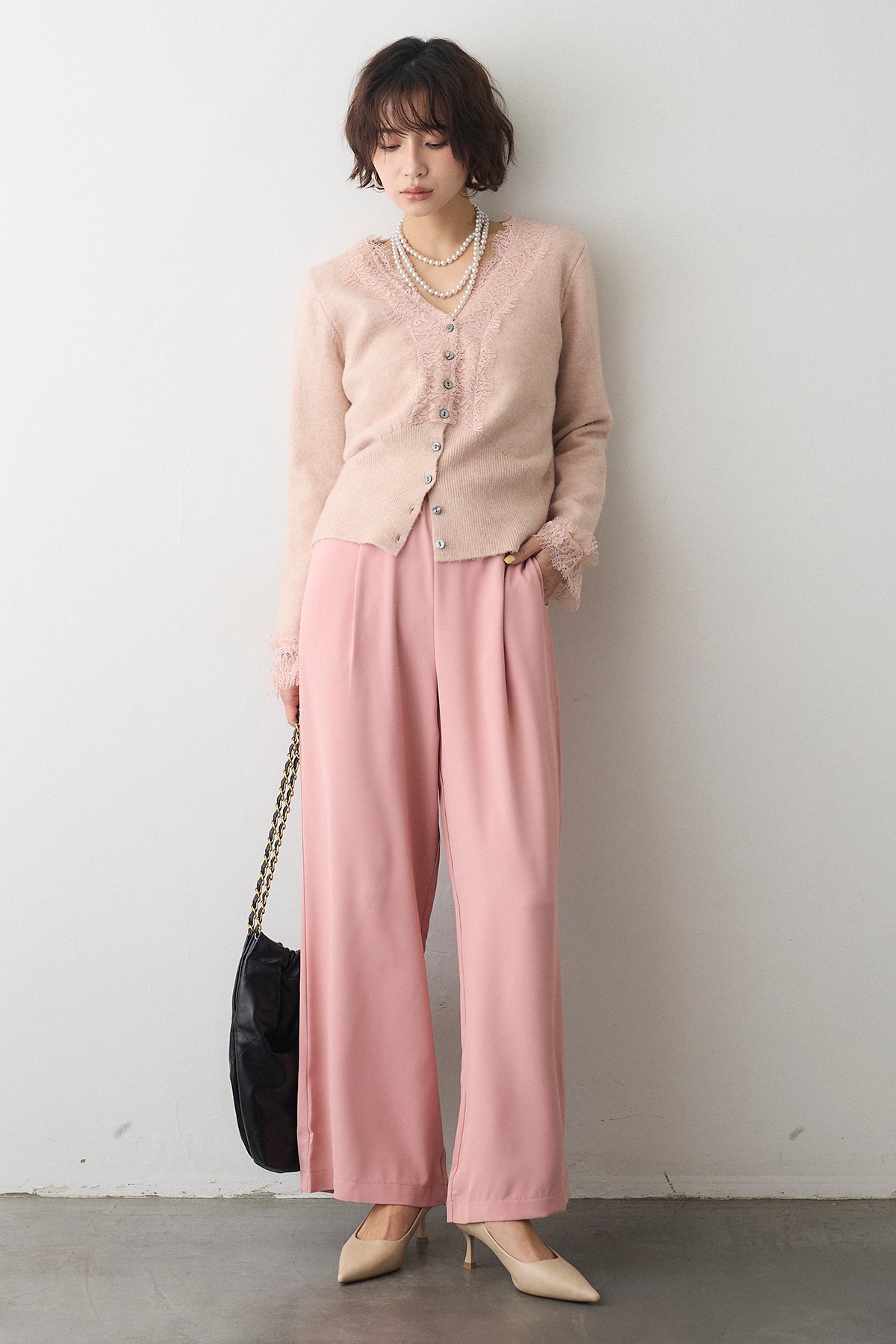 [予約/SET]レースVラインボタンニット+とろみドロストワイドパンツ(2set)