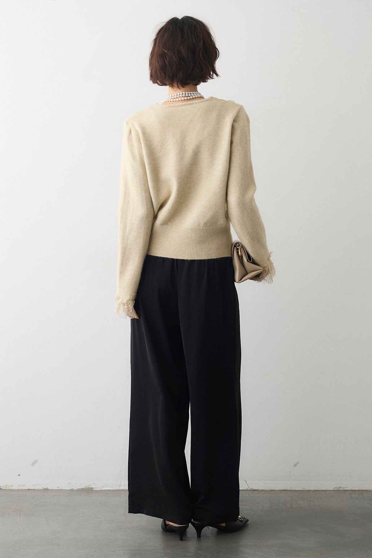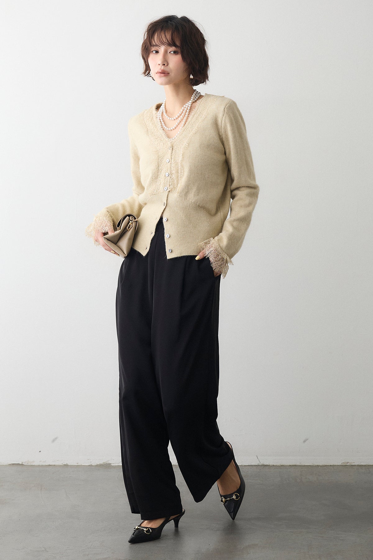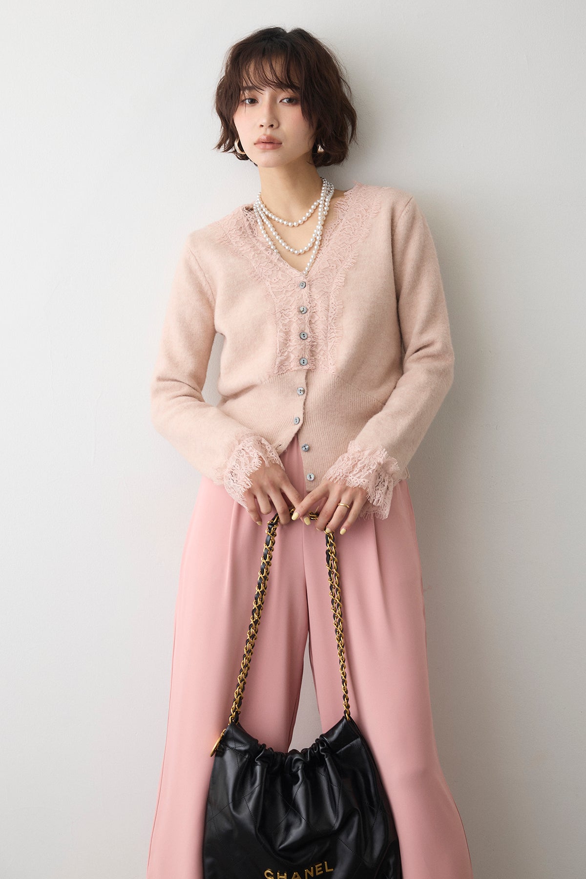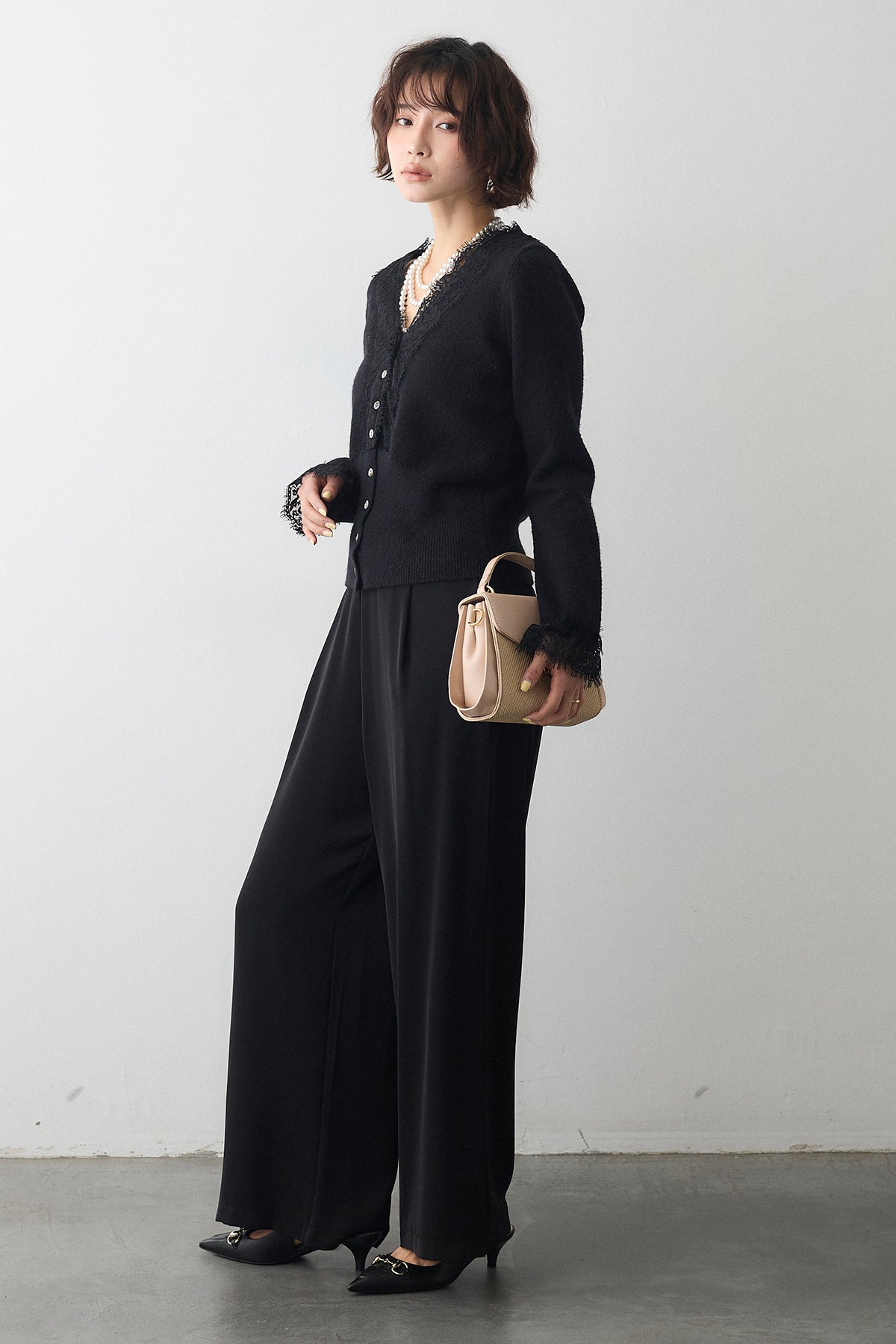 [予約/SET]レースVラインボタンニット+とろみドロストワイドパンツ(2set)