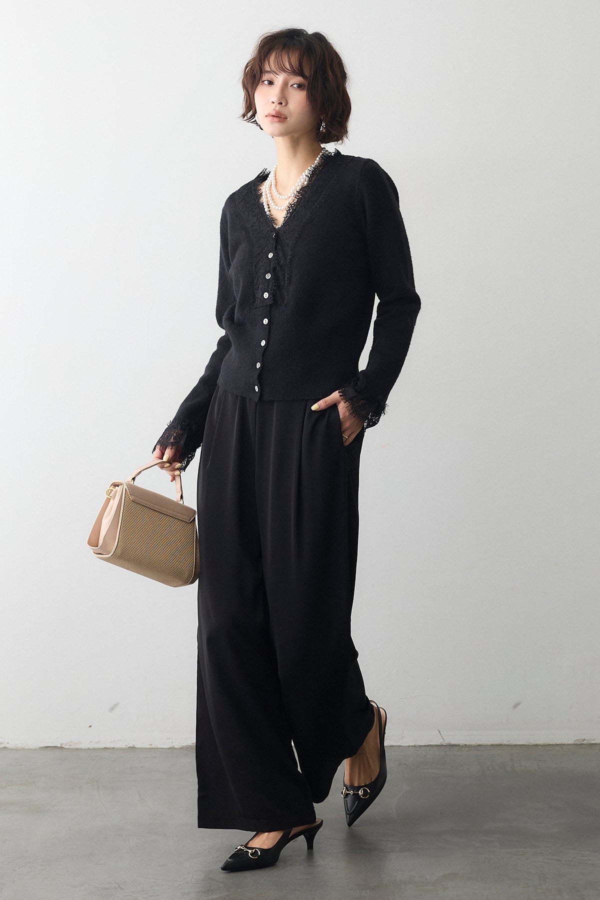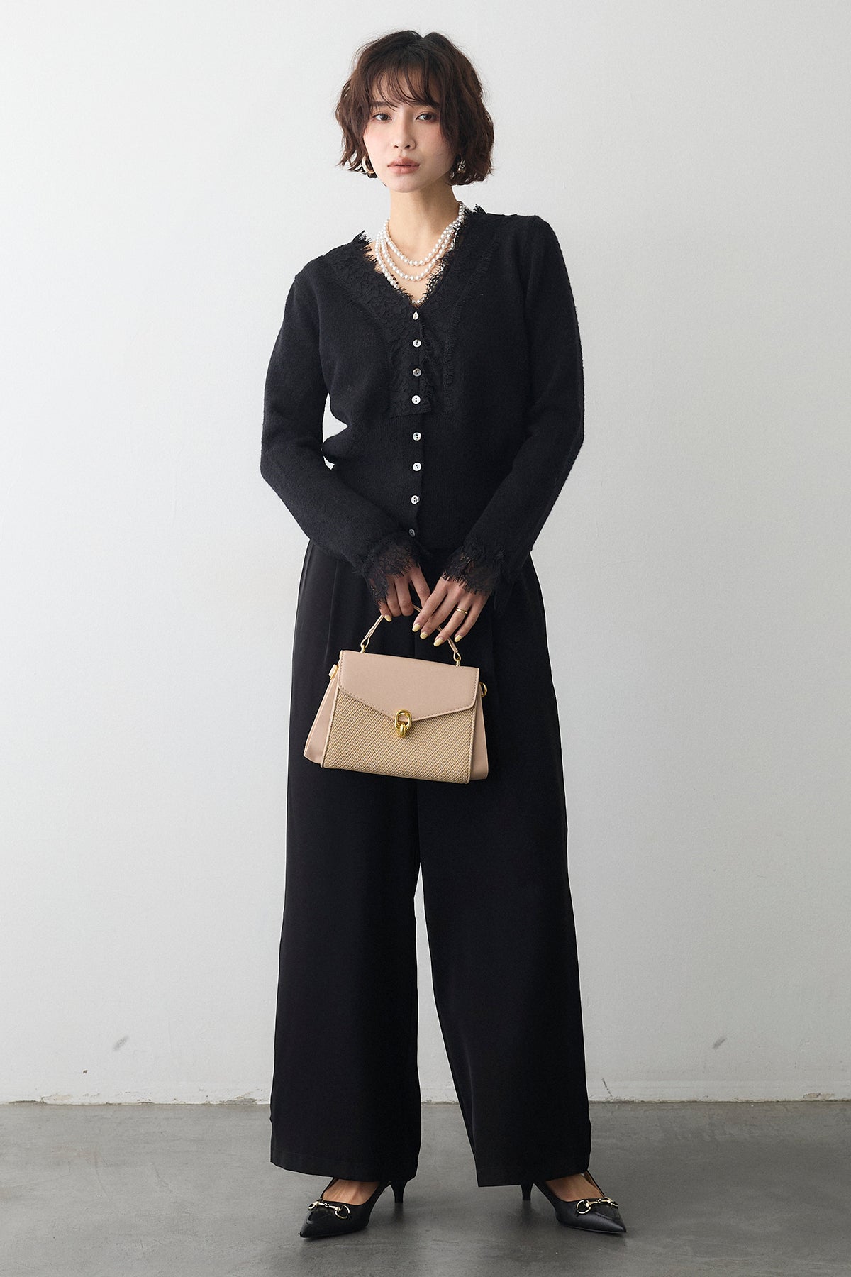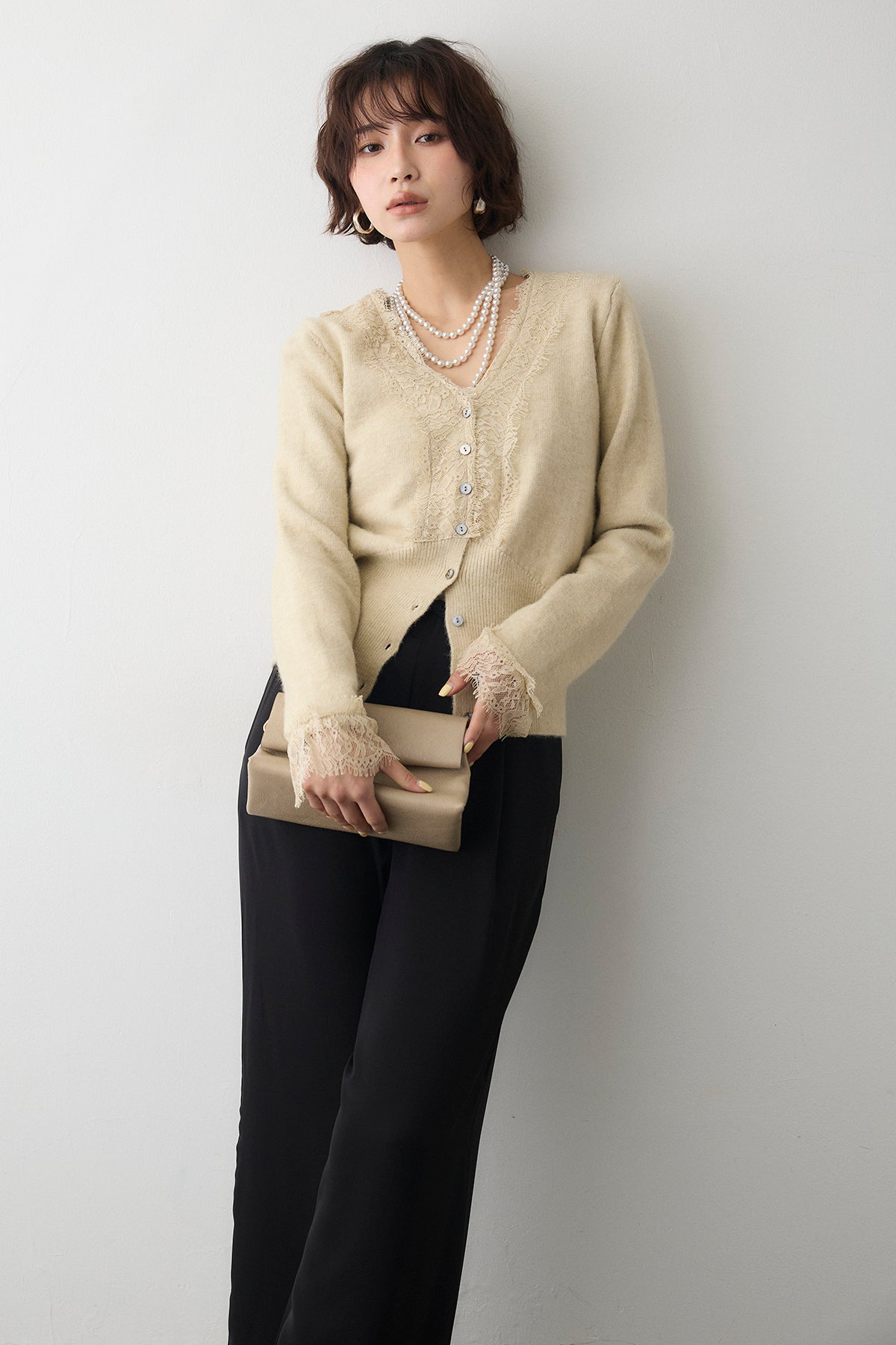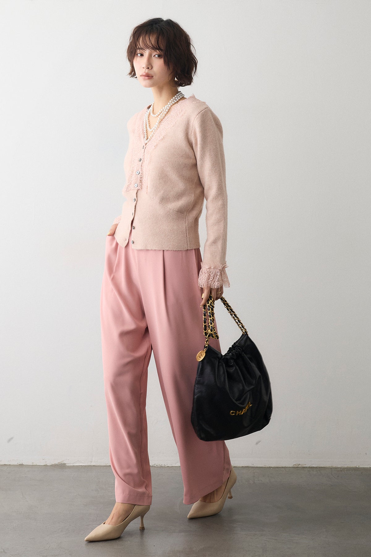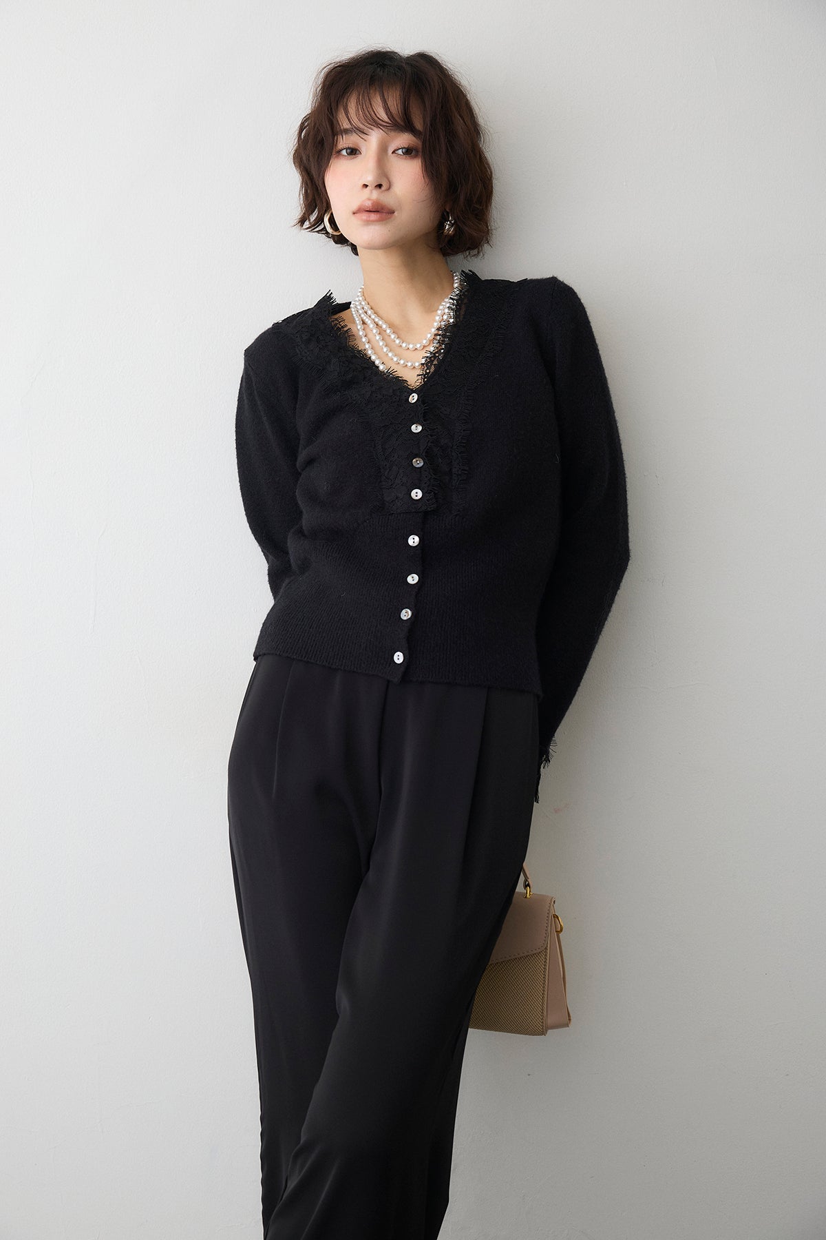 [予約/SET]レースVラインボタンニット+とろみドロストワイドパンツ(2set)