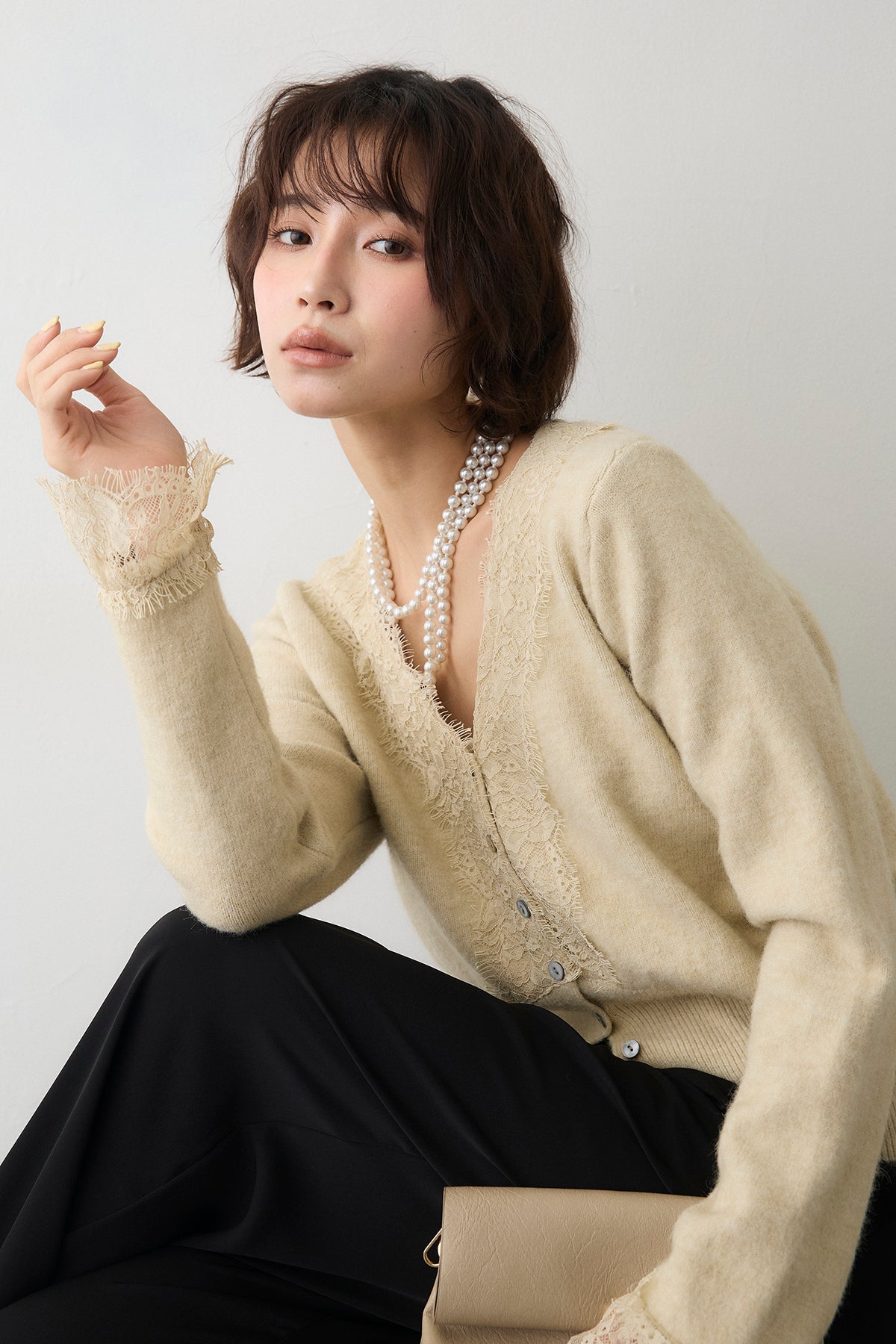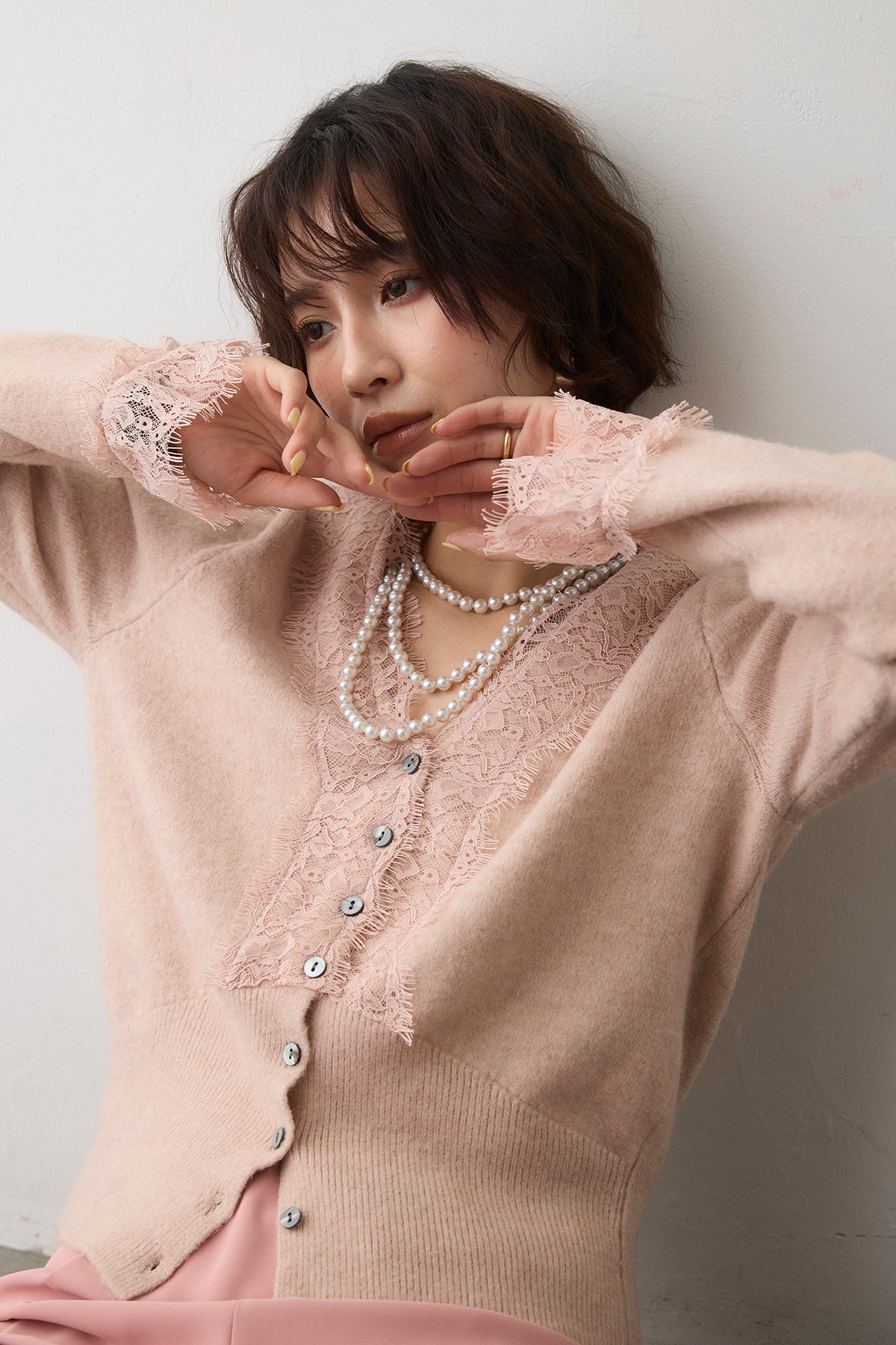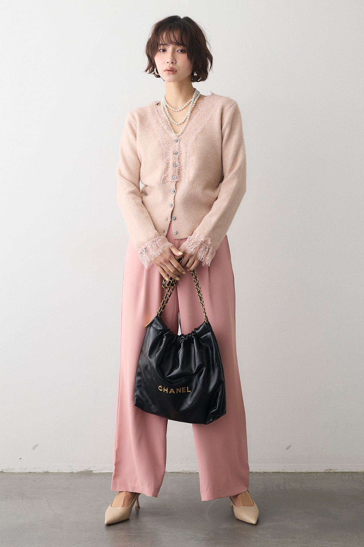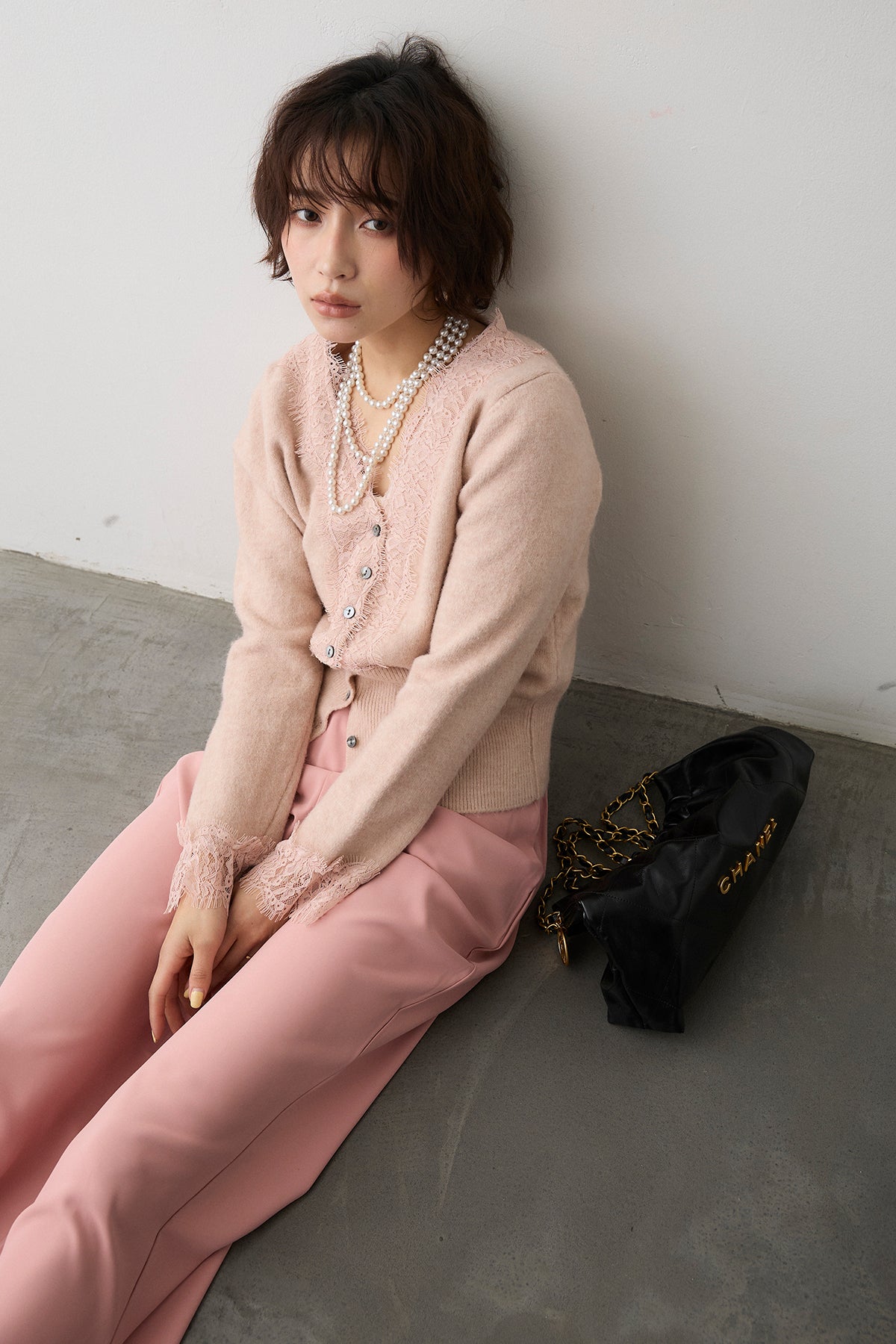 [予約/SET]レースVラインボタンニット+とろみドロストワイドパンツ(2set)