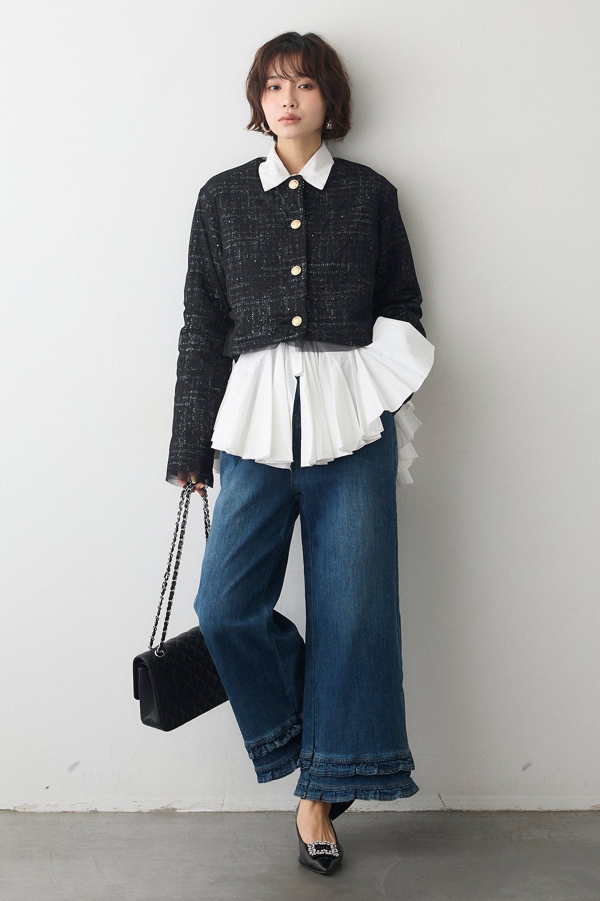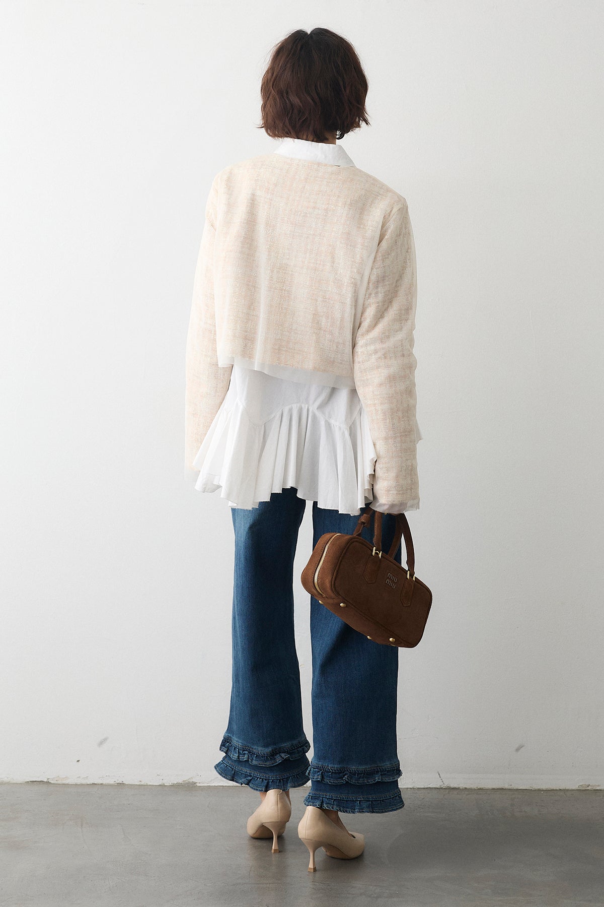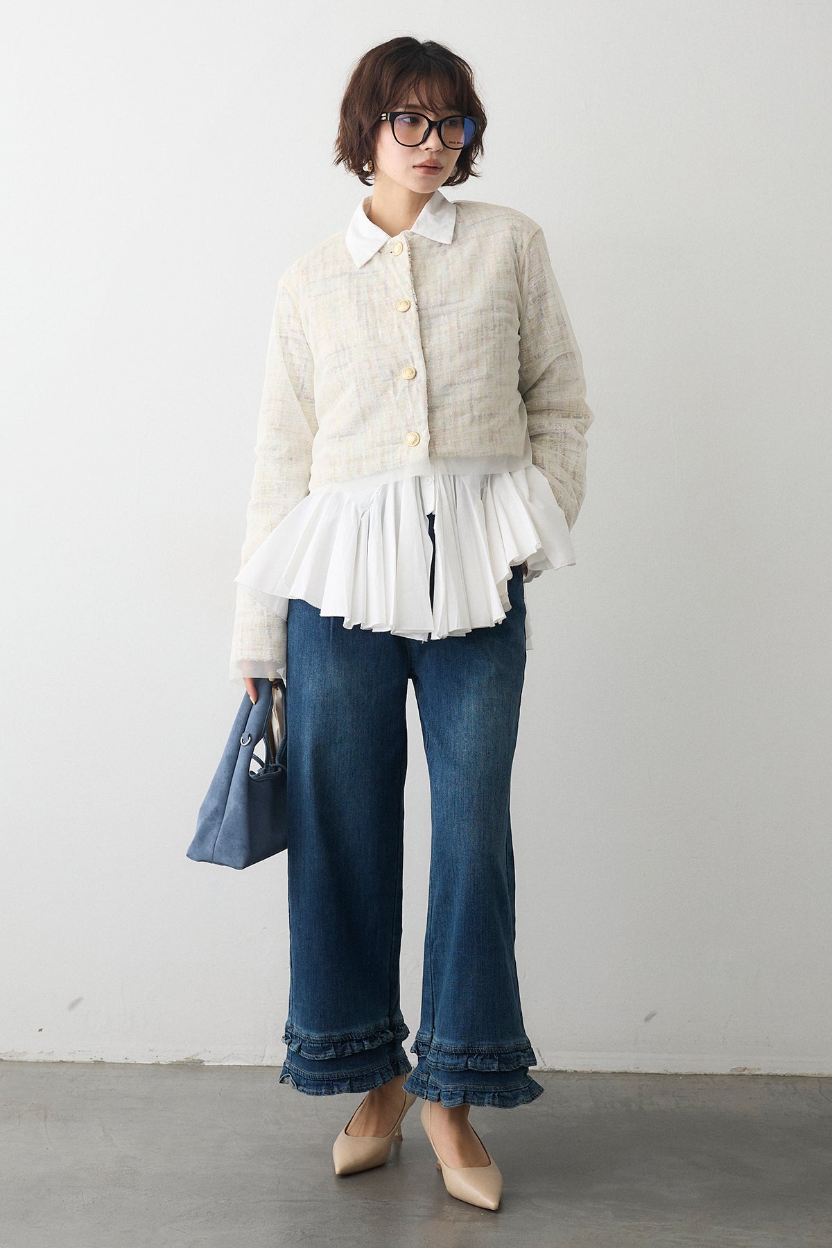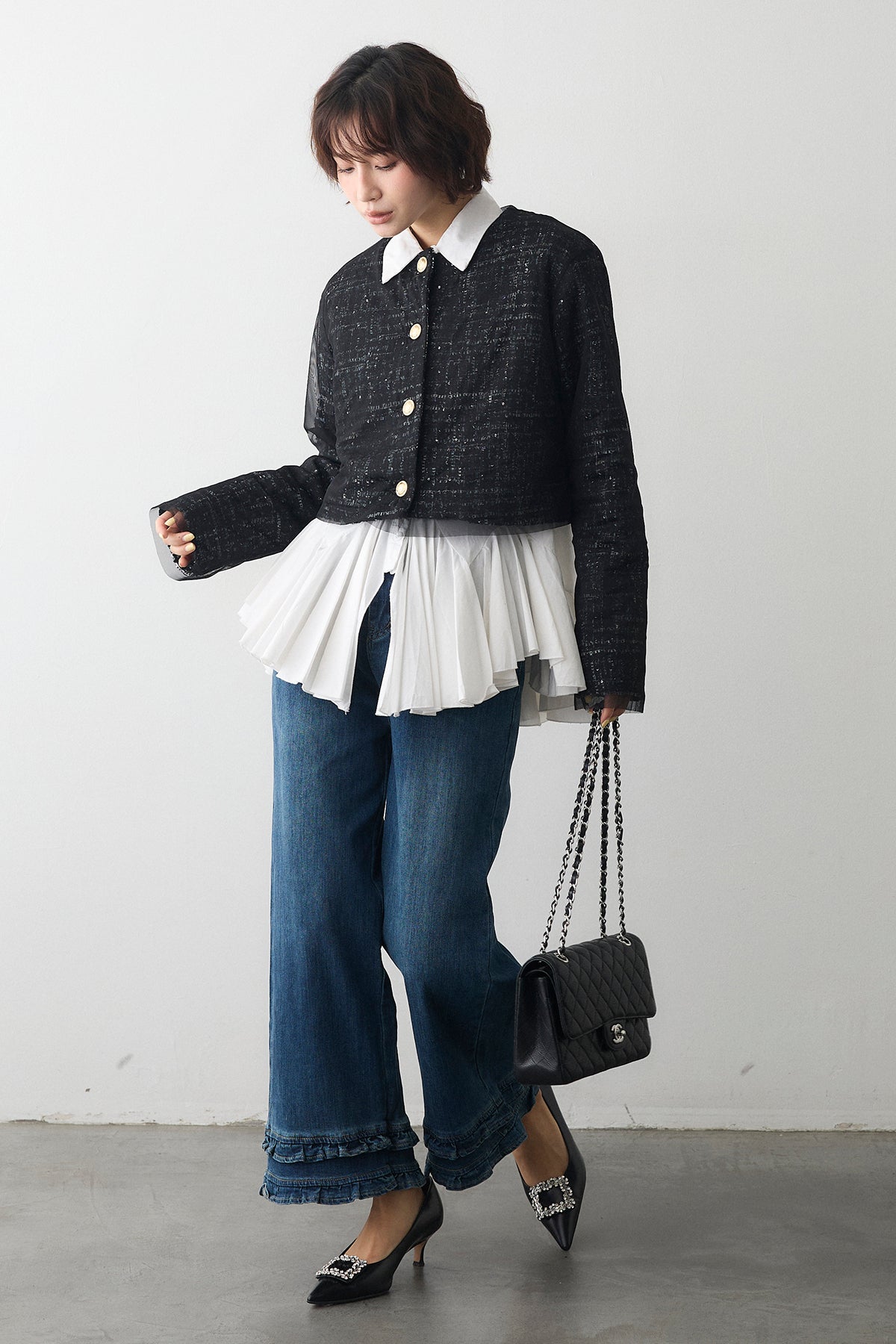 [予約/SET]パネルフレアヘムシャツ+ツイード×チュールレイヤードクロップドジャケット+フリルヘムデニムパンツ(3set)