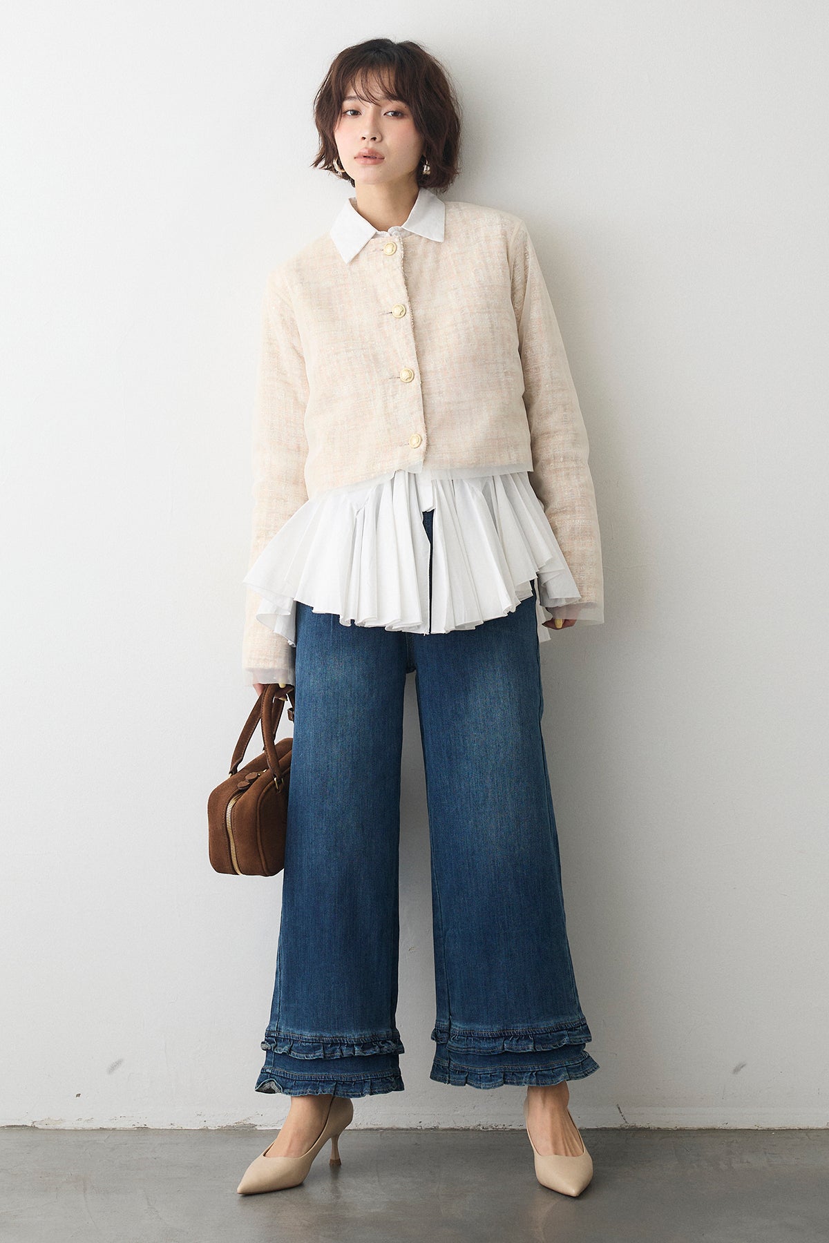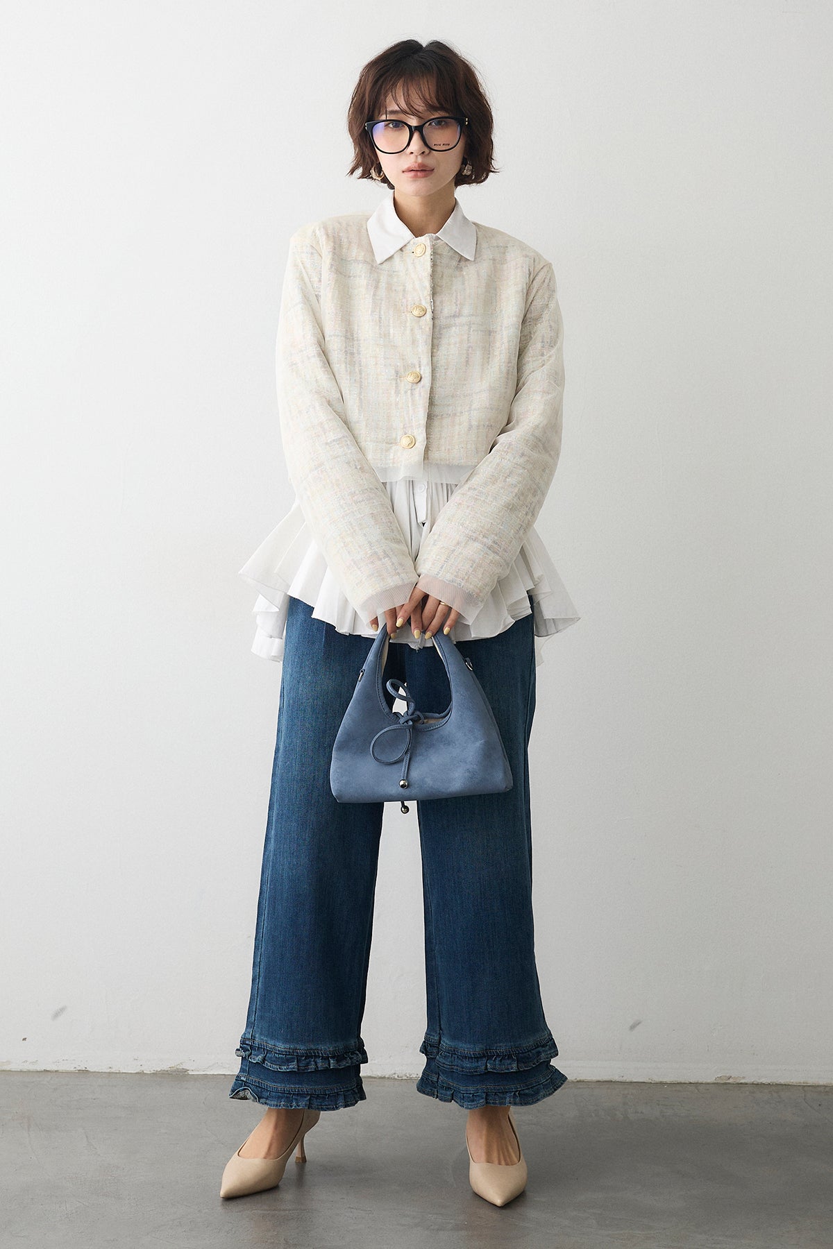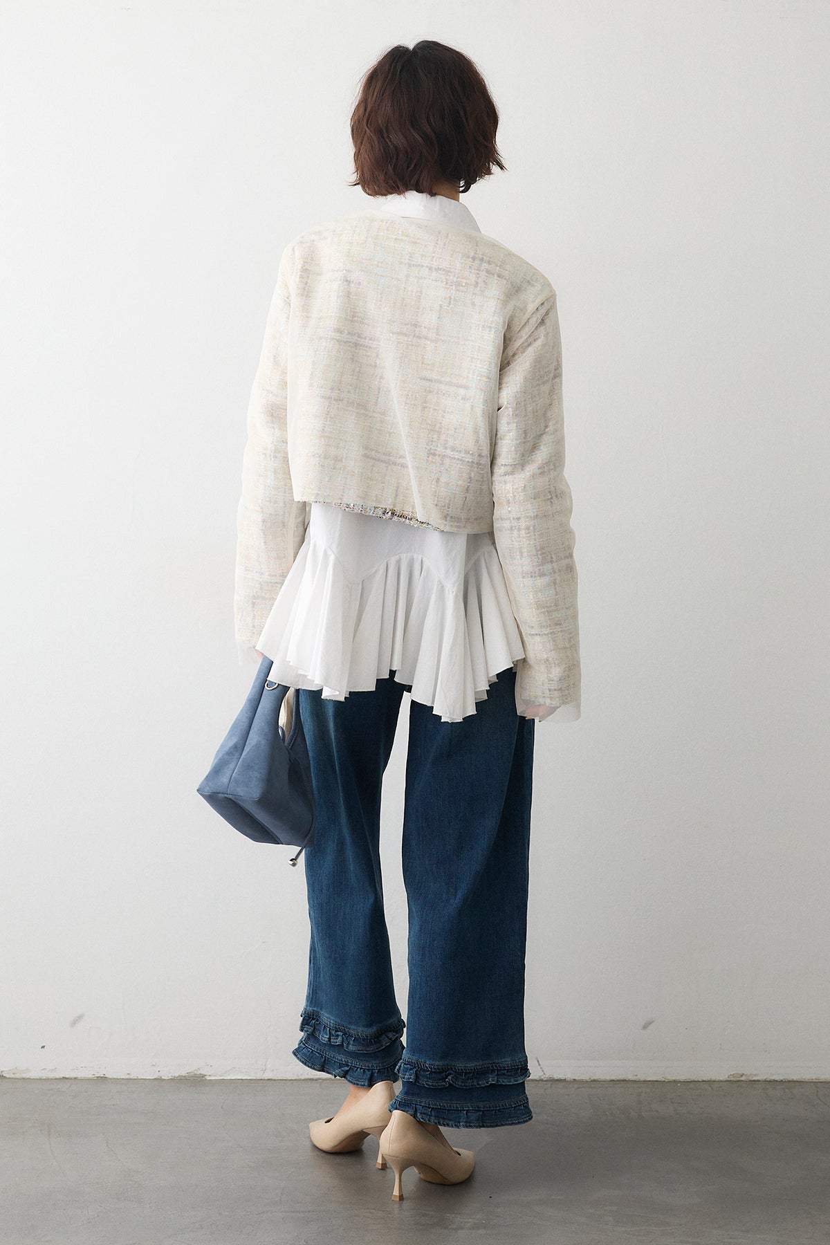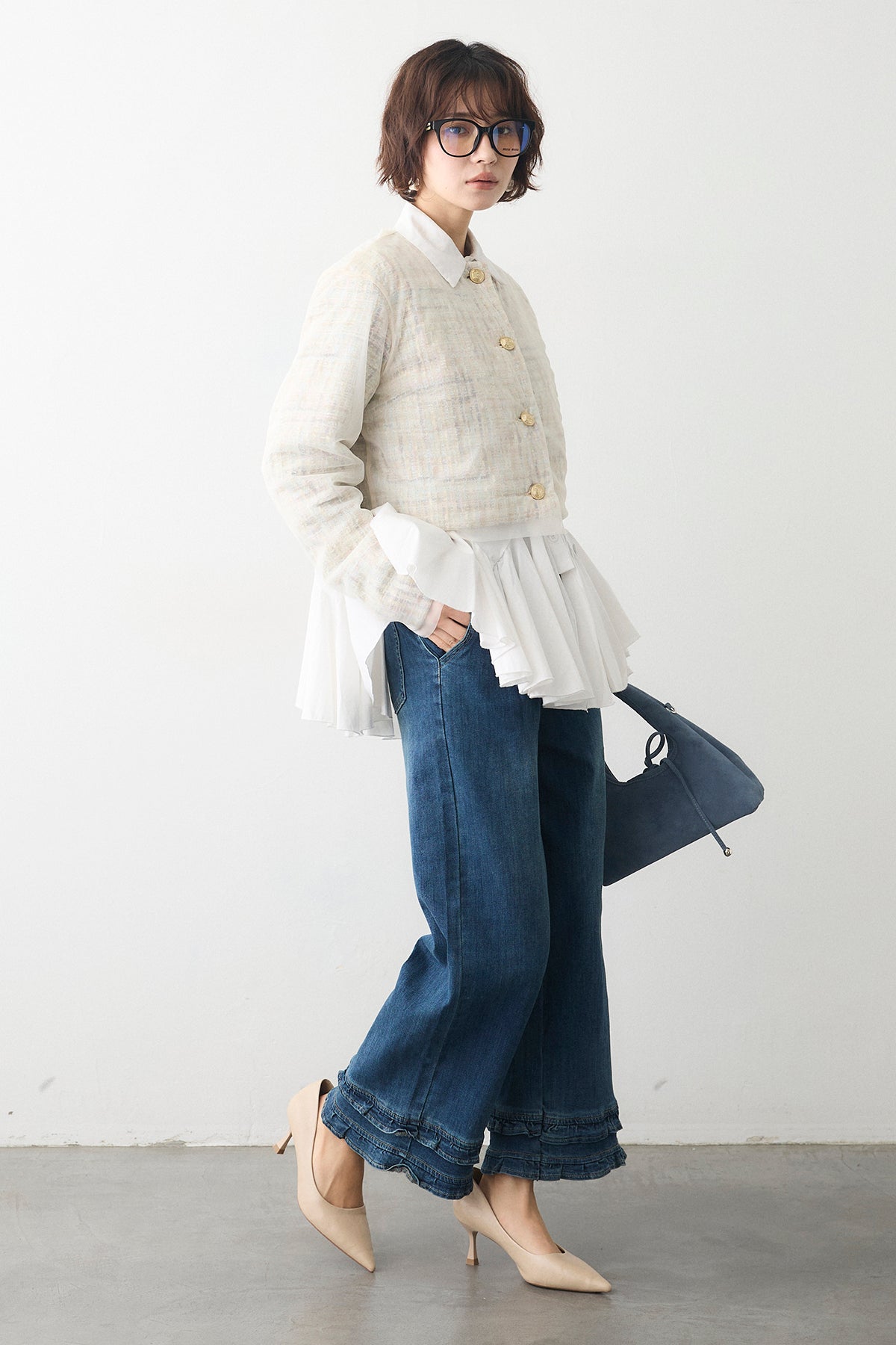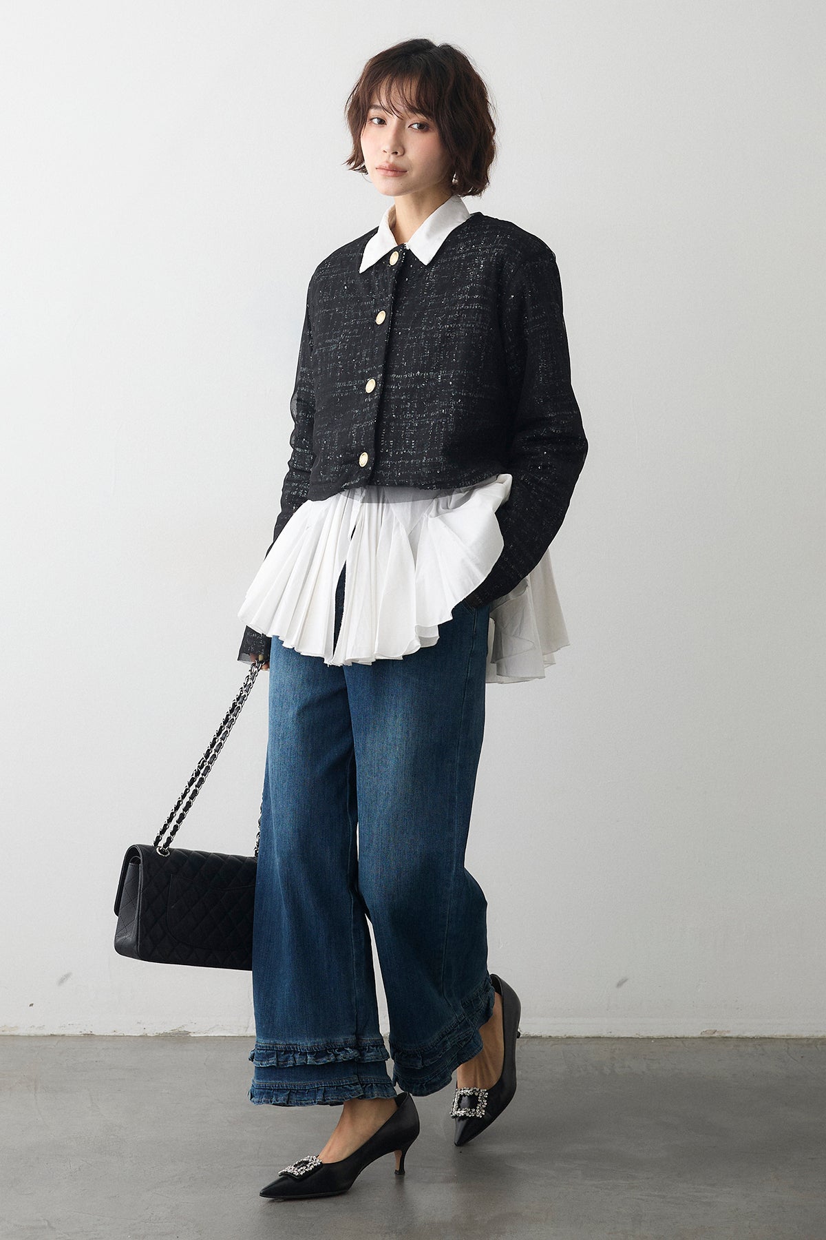 [予約/SET]パネルフレアヘムシャツ+ツイード×チュールレイヤードクロップドジャケット+フリルヘムデニムパンツ(3set)