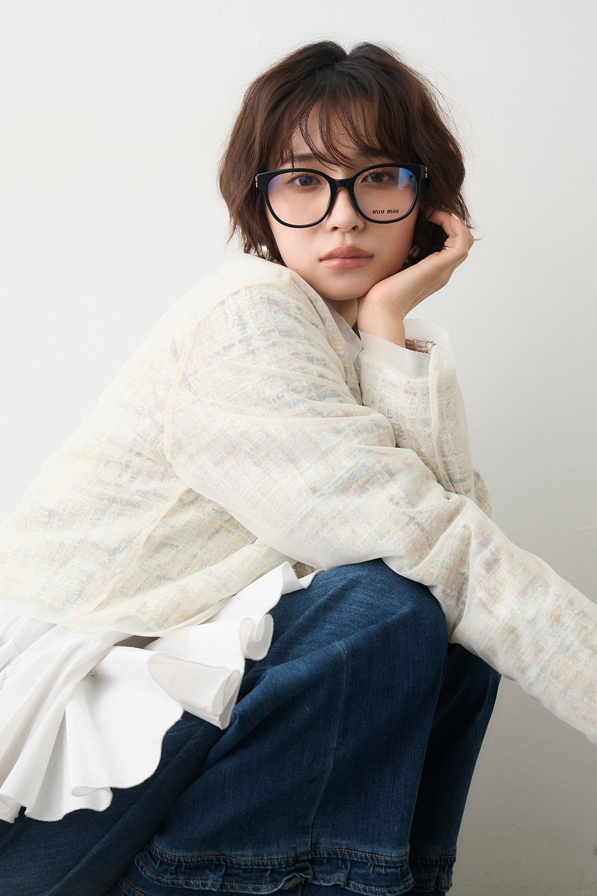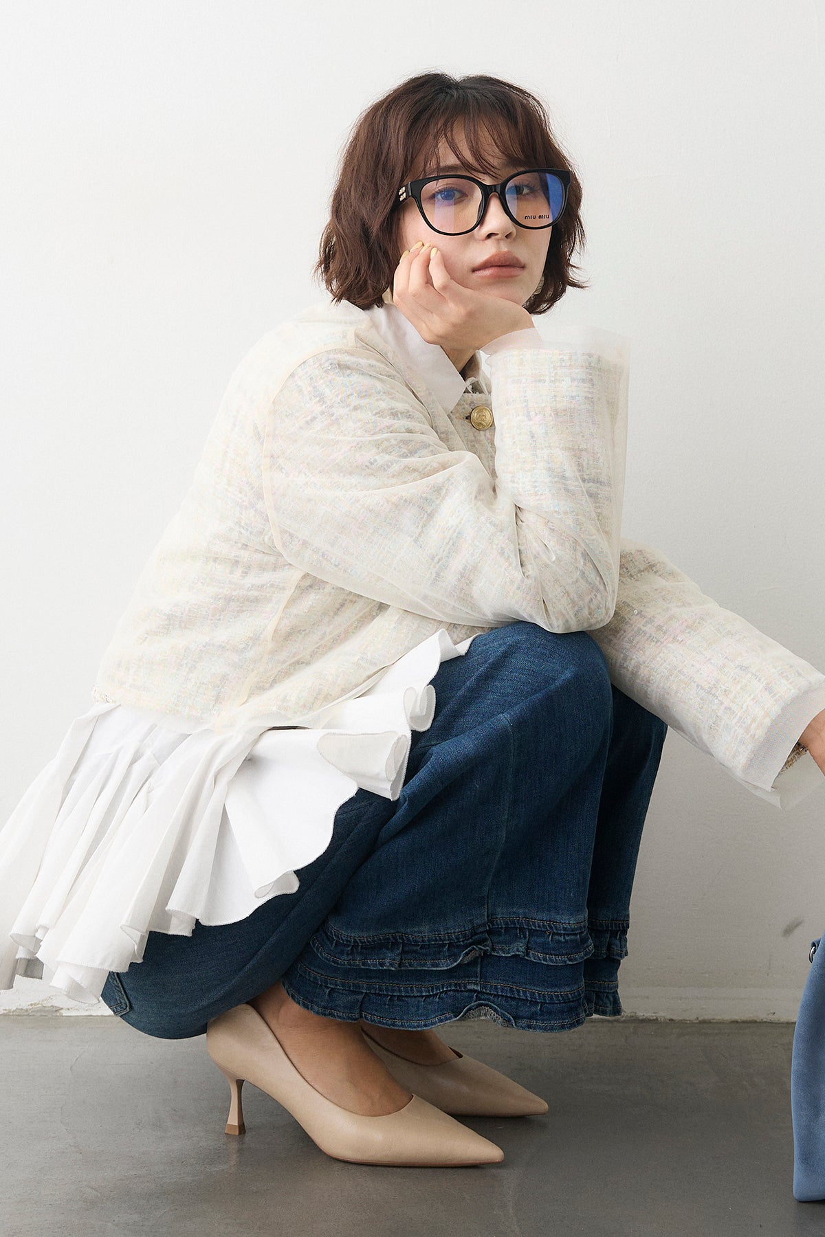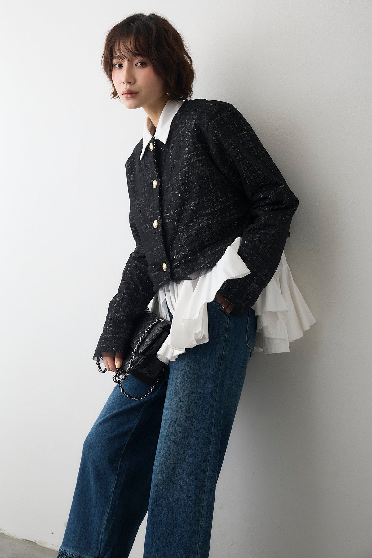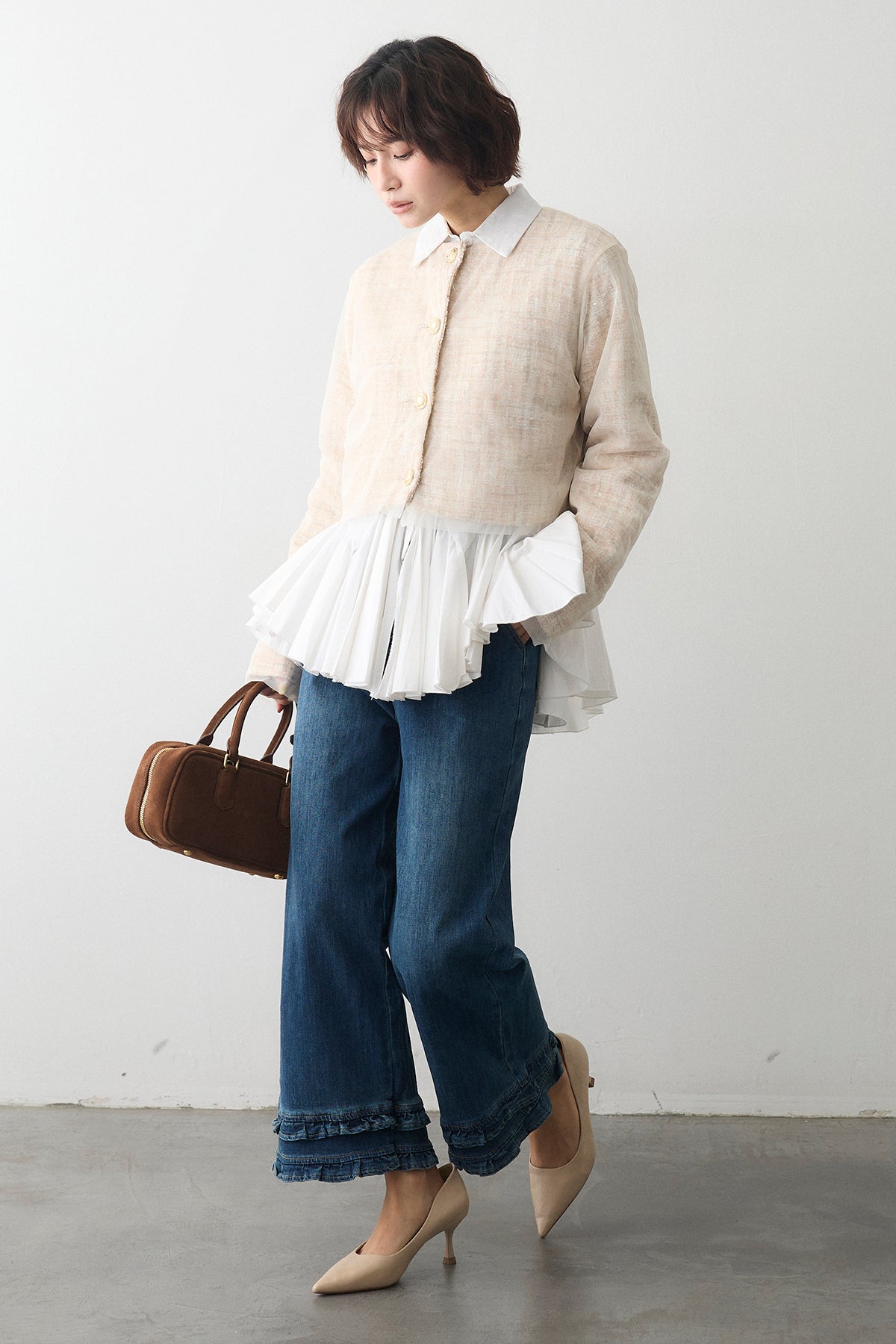 [予約/SET]パネルフレアヘムシャツ+ツイード×チュールレイヤードクロップドジャケット+フリルヘムデニムパンツ(3set)