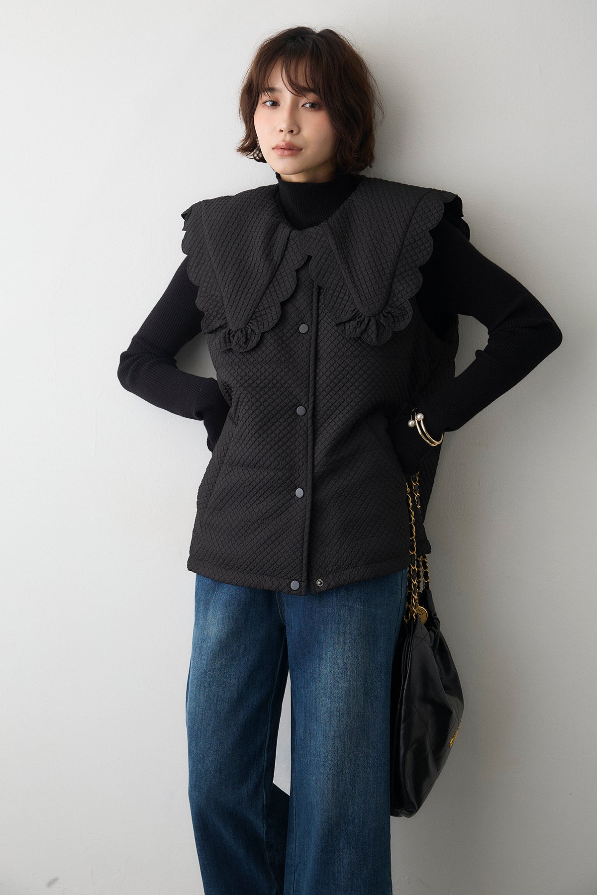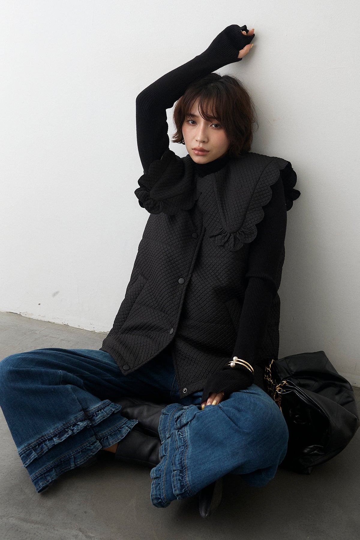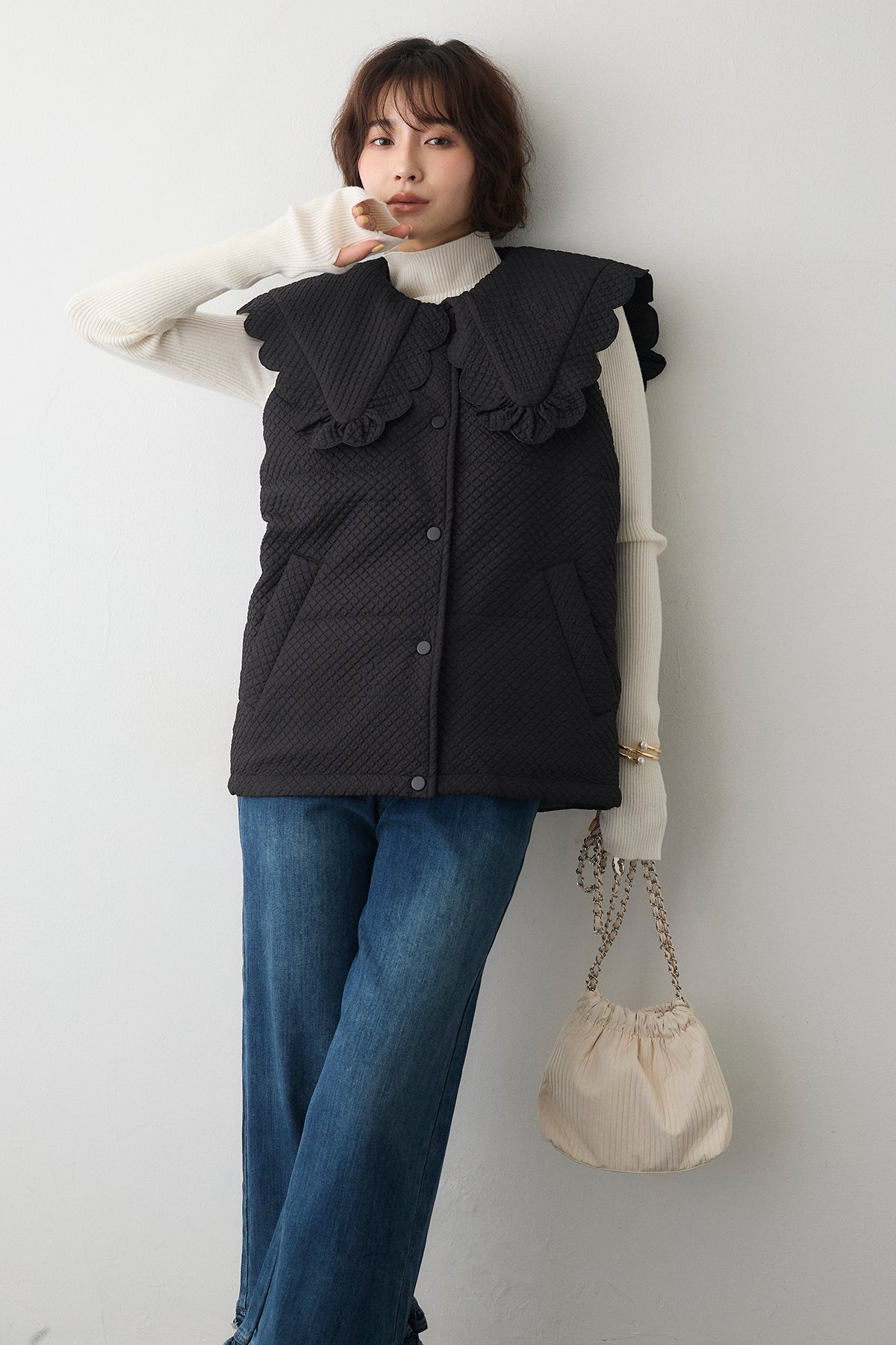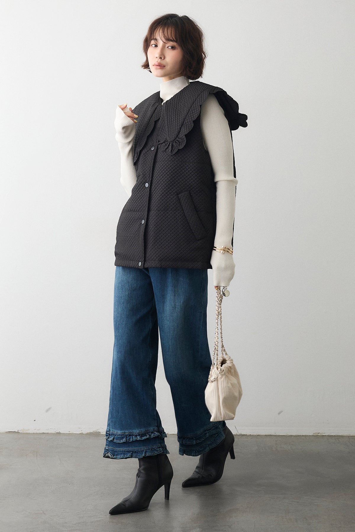 [予約/SET]スカラップBIGカラーベスト+フリルヘムデニムパンツ(2set)