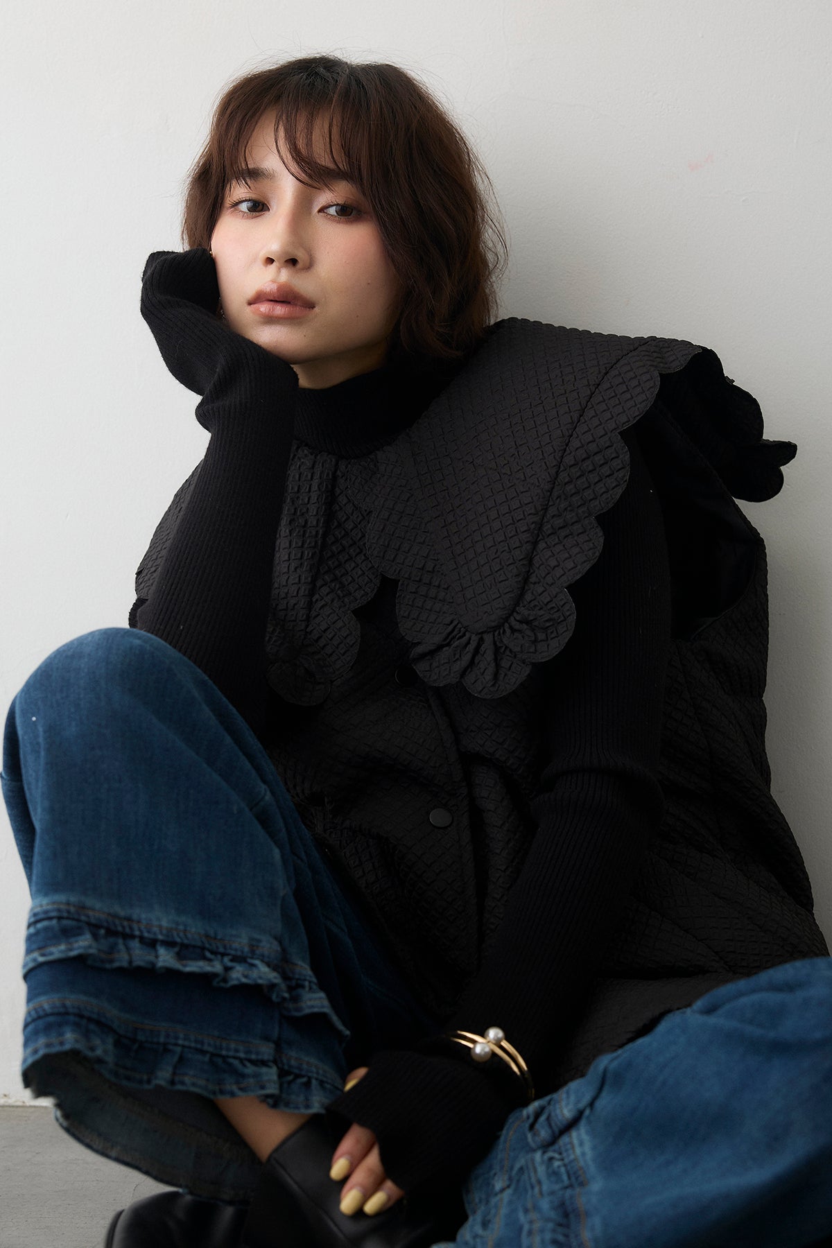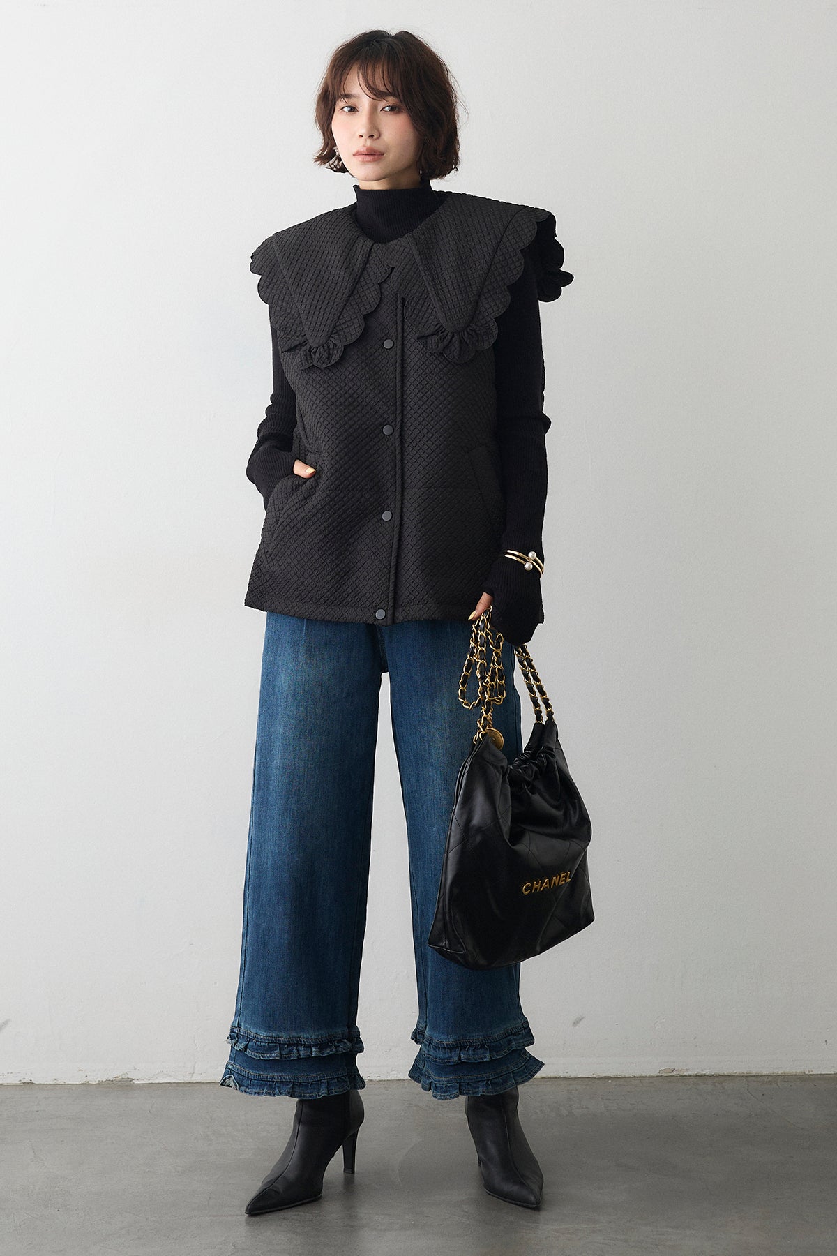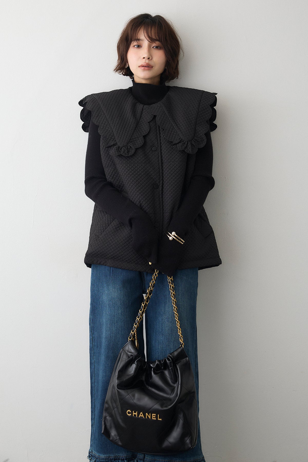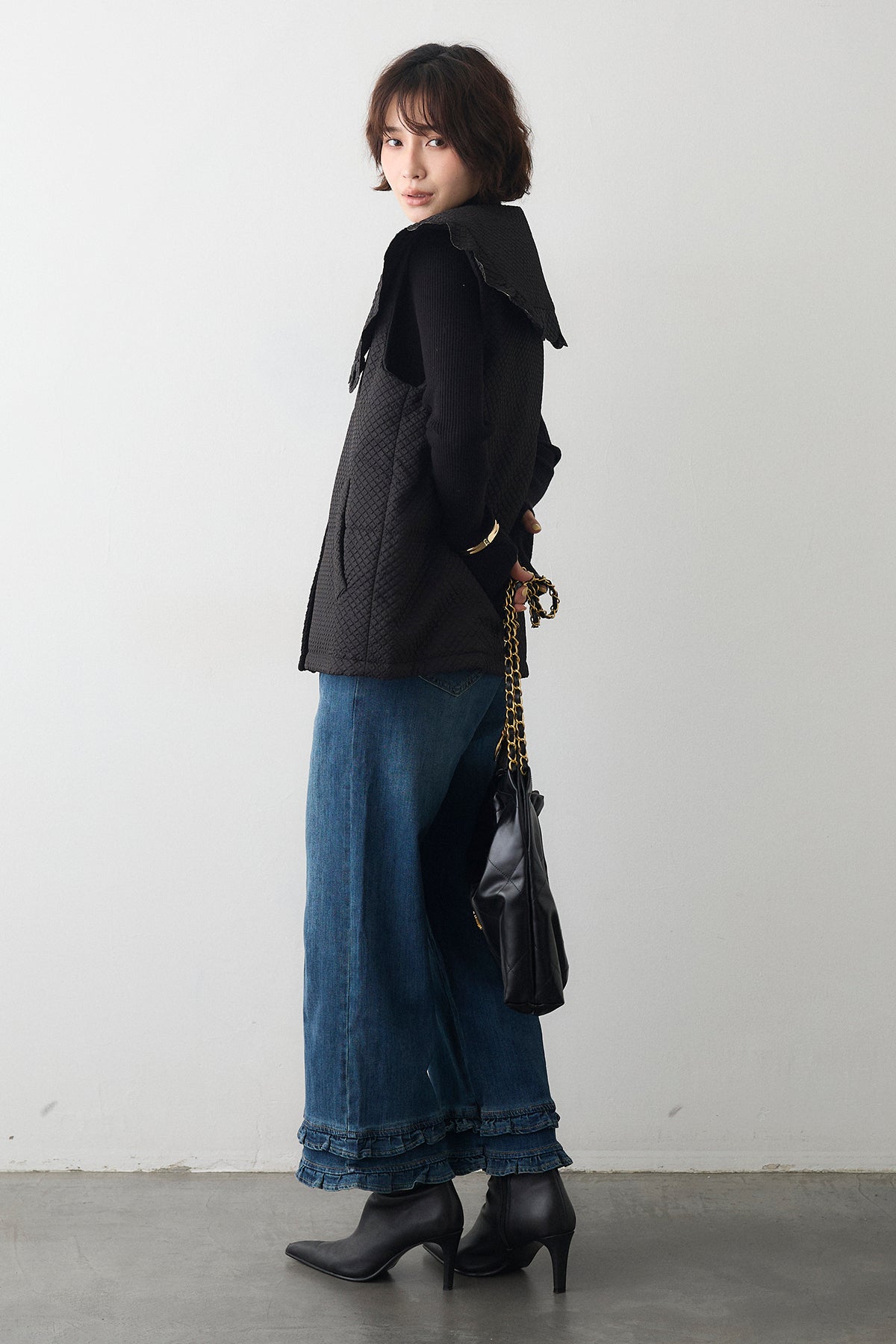 [予約/SET]スカラップBIGカラーベスト+フリルヘムデニムパンツ(2set)