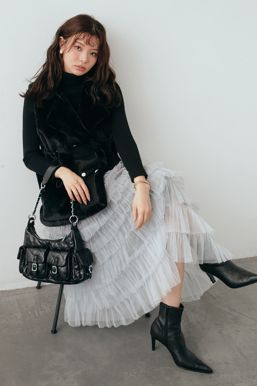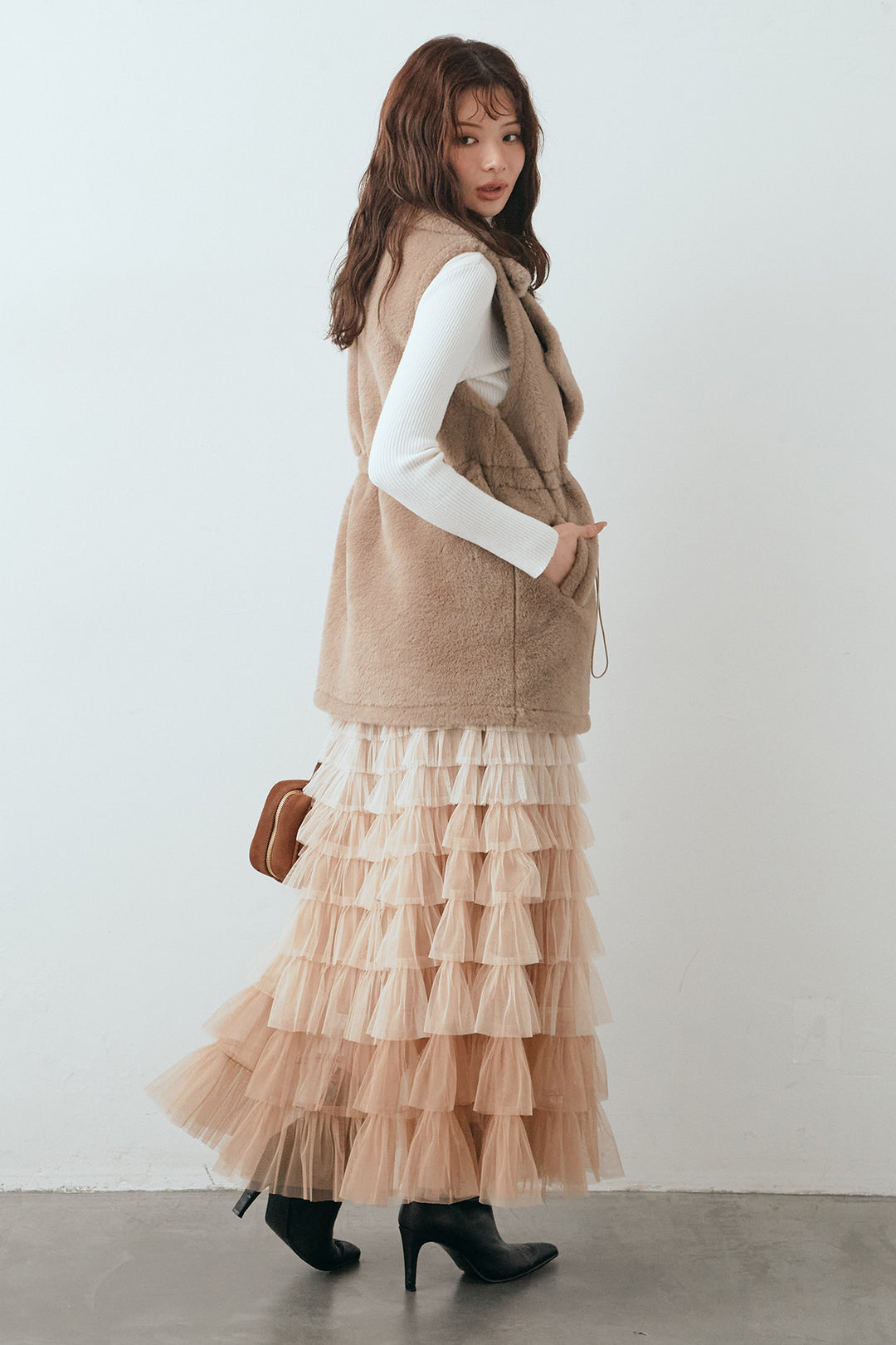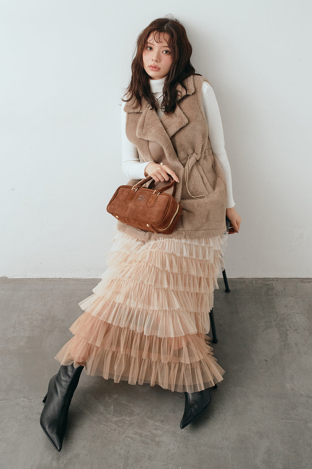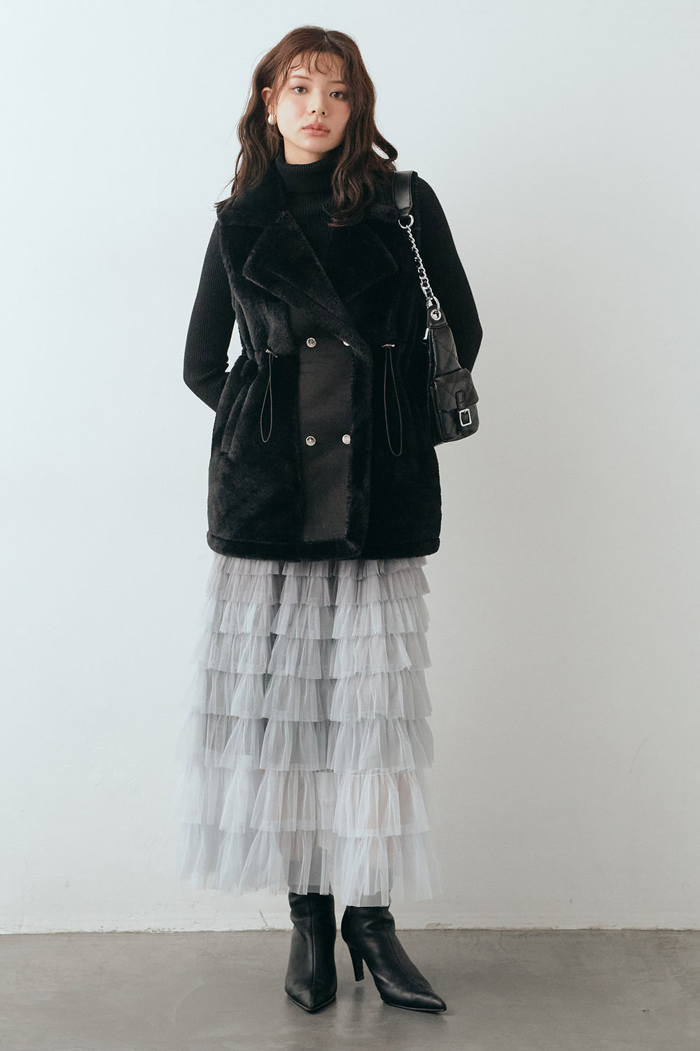 [予約/SET]ベーシックリブタートルニット+テディボアウエストドロストベスト+グラデーションチュールティアードスカート(3set)