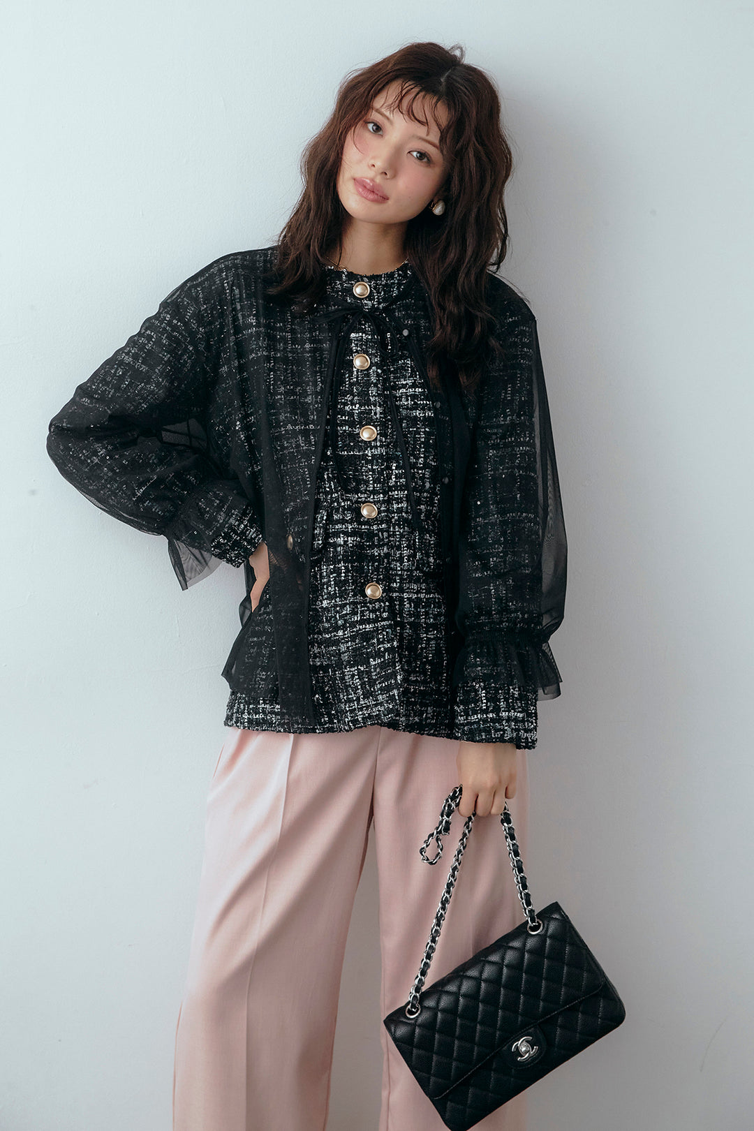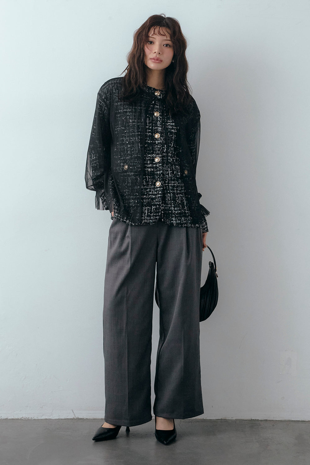 [予約/SET]2wayチュールレイヤードツイードジャケット+スプリングカラータックストレートパンツ(2set)