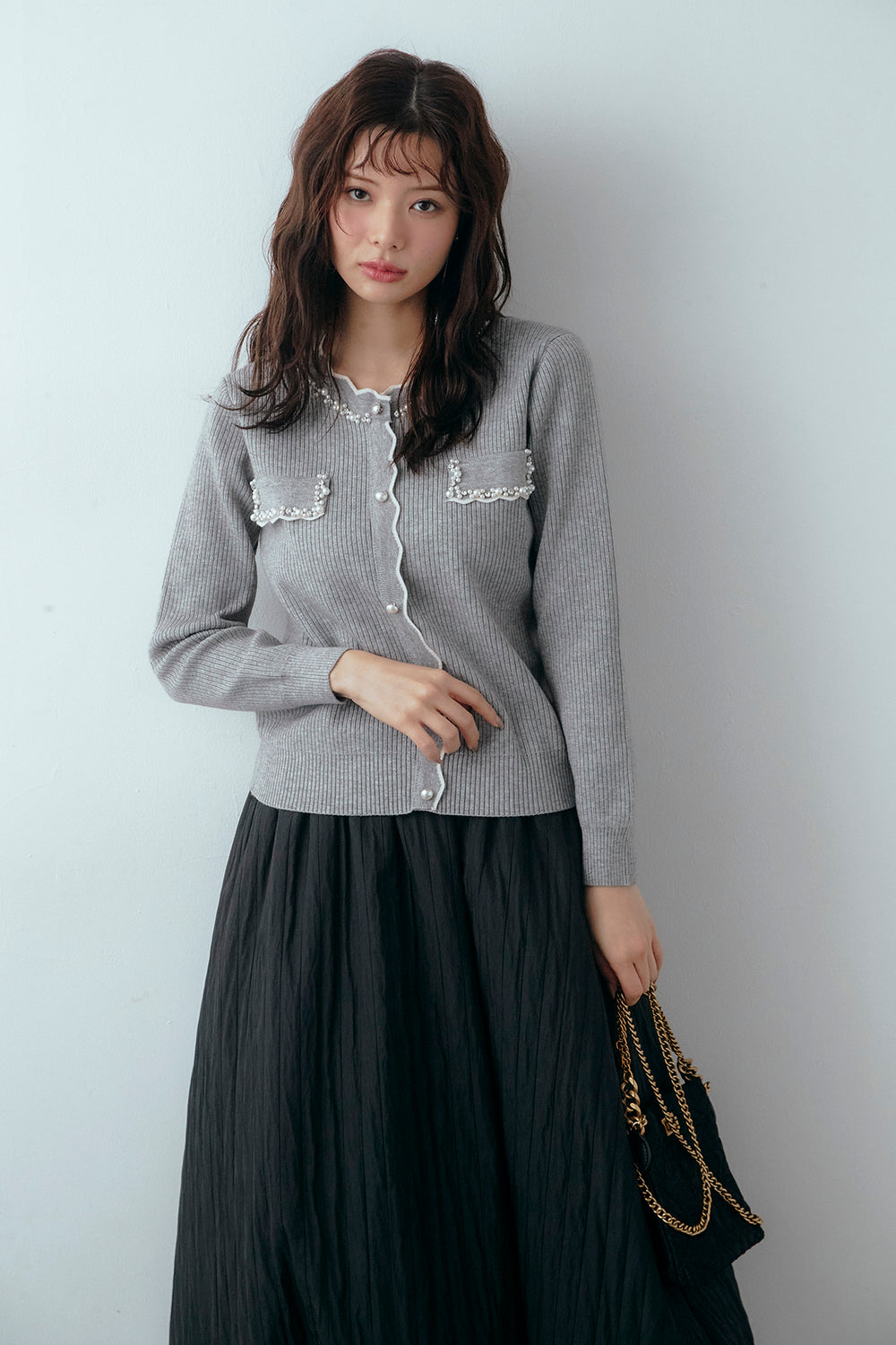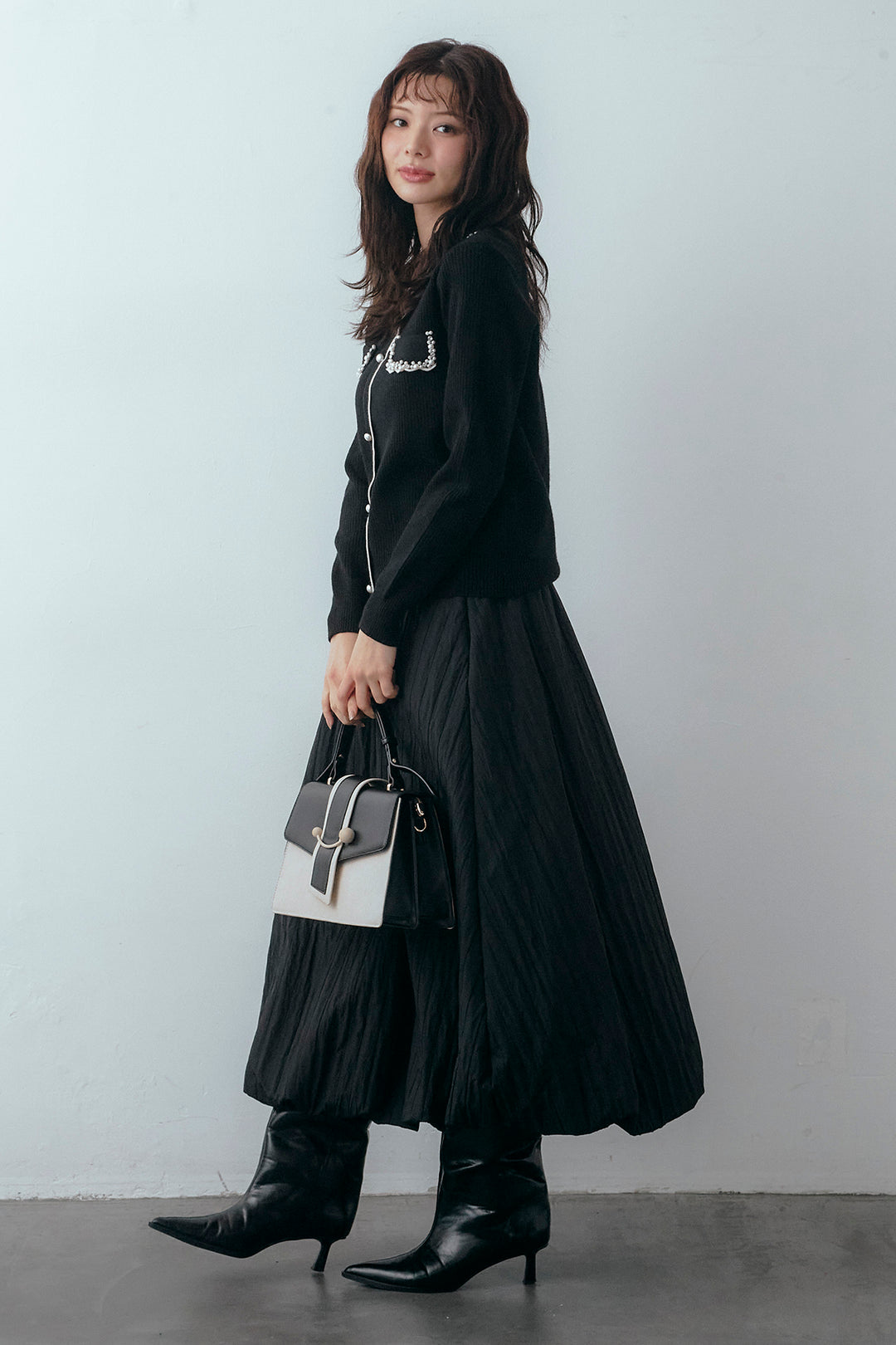 [予約/SET]ビジューパールデザインニットカーデ+ソフトキルトバルーンスカート(2set)