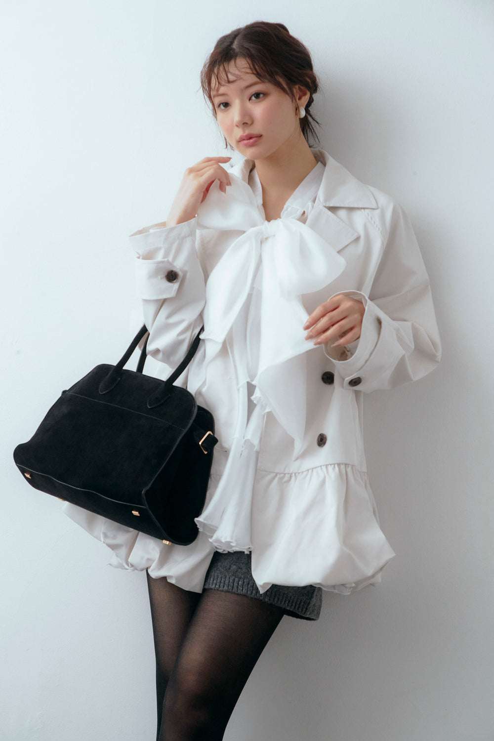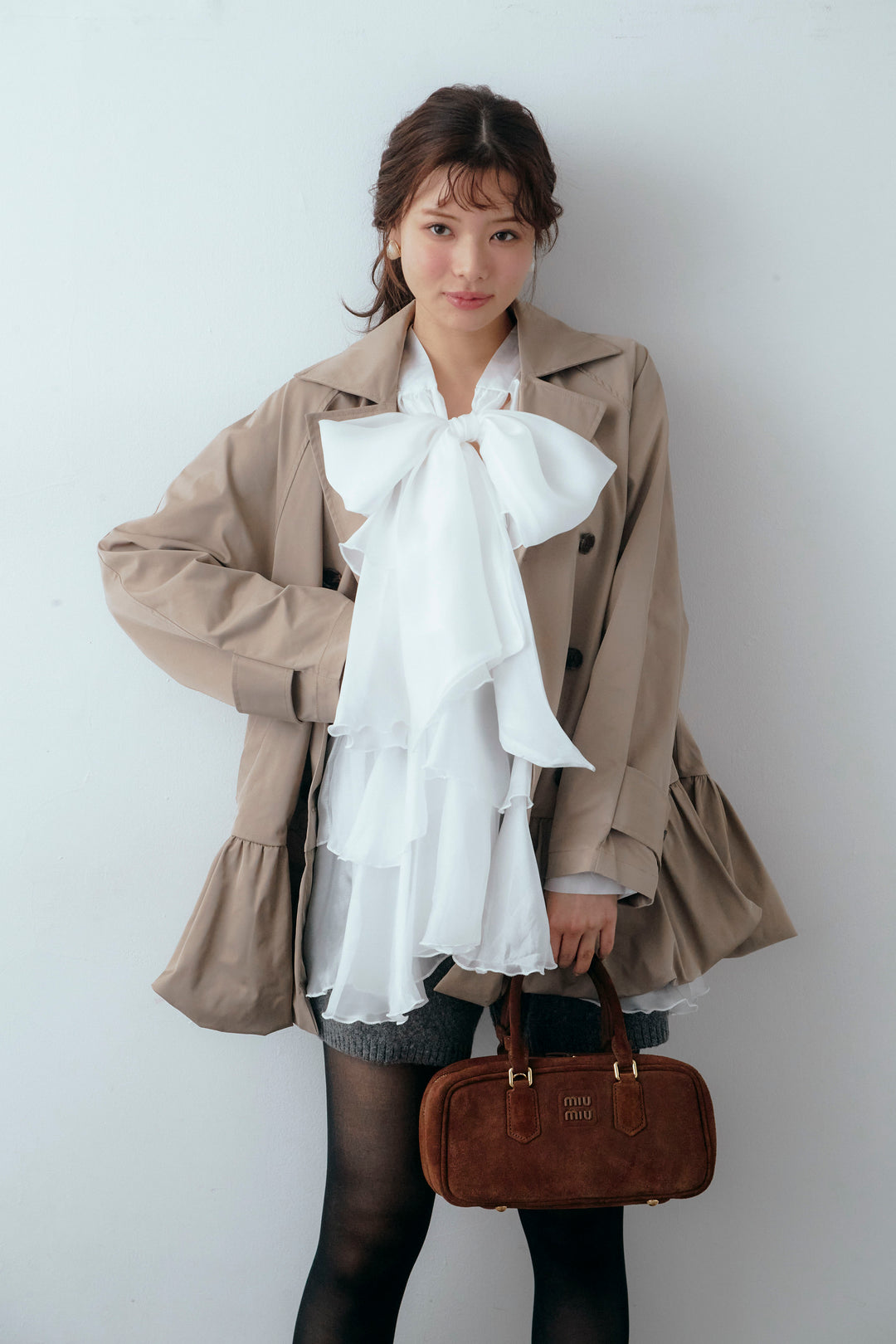 [予約/SET]フロントBIGリボンティアードエアリーチュニック+バルーンヘムミディ丈トレンチコート+メランジニットショートパンツ(3set)