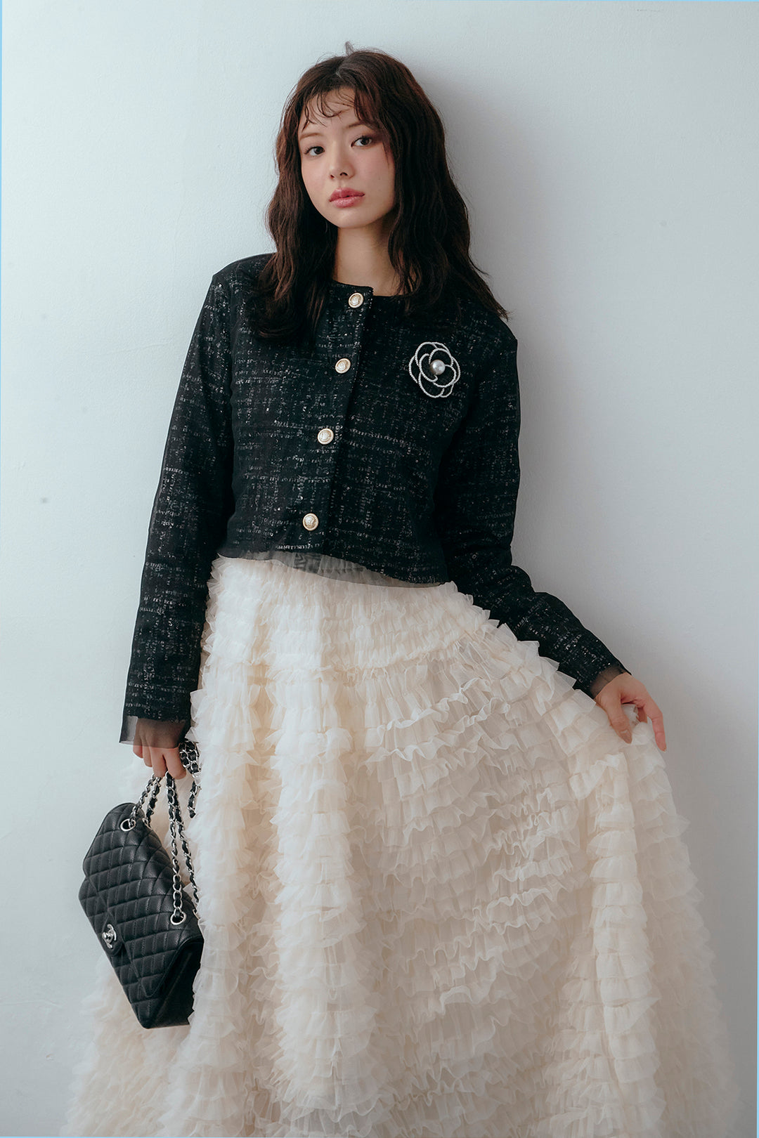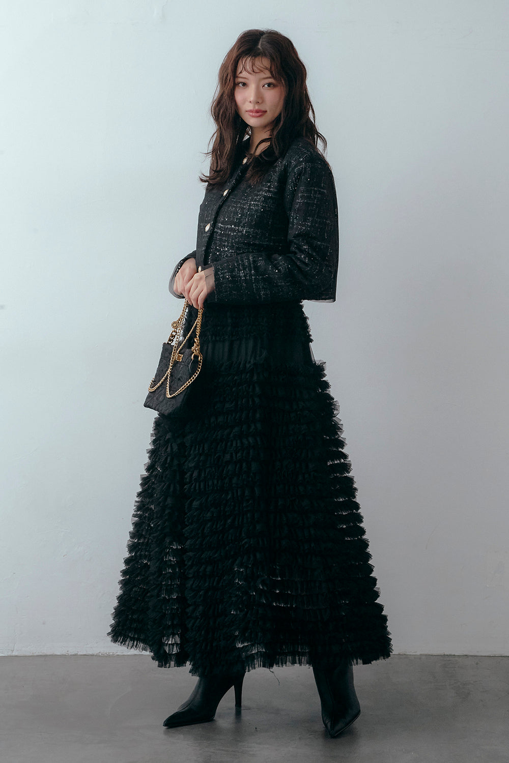 [予約/SET]ツイード×チュールレイヤードクロップドジャケット+ホイップチュールティアードスカート(2set)