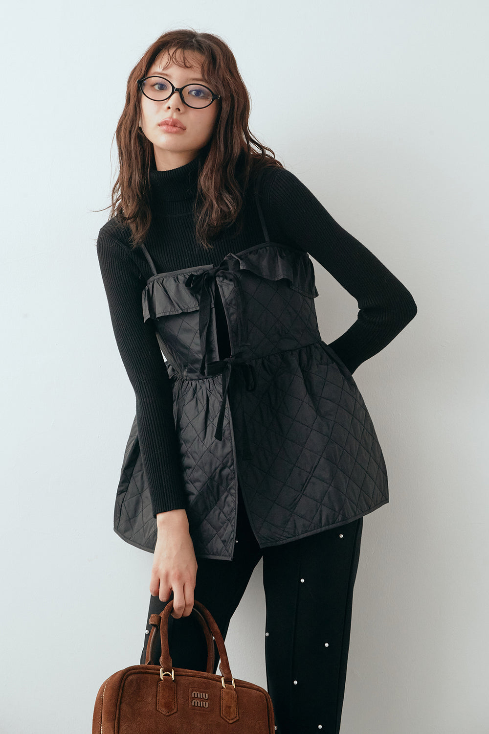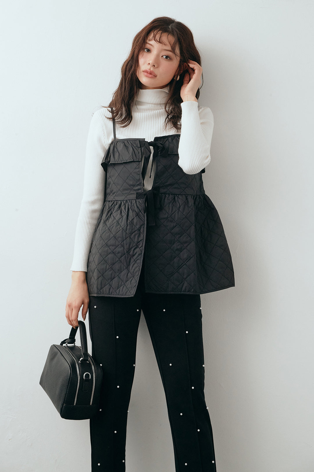 [予約/SET]ベーシックリブタートルニット+ダイヤキルトキャミビスチェ+センターシームランダムパールパンツ(3set)