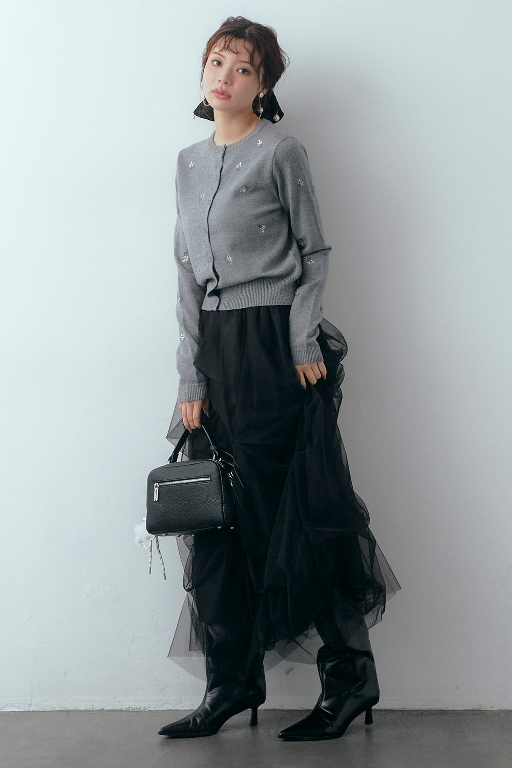 [予約/SET]ニュアンスフラワー刺繍クロップドニットカーデ+マルチパターンタックチュールスカート(2set)