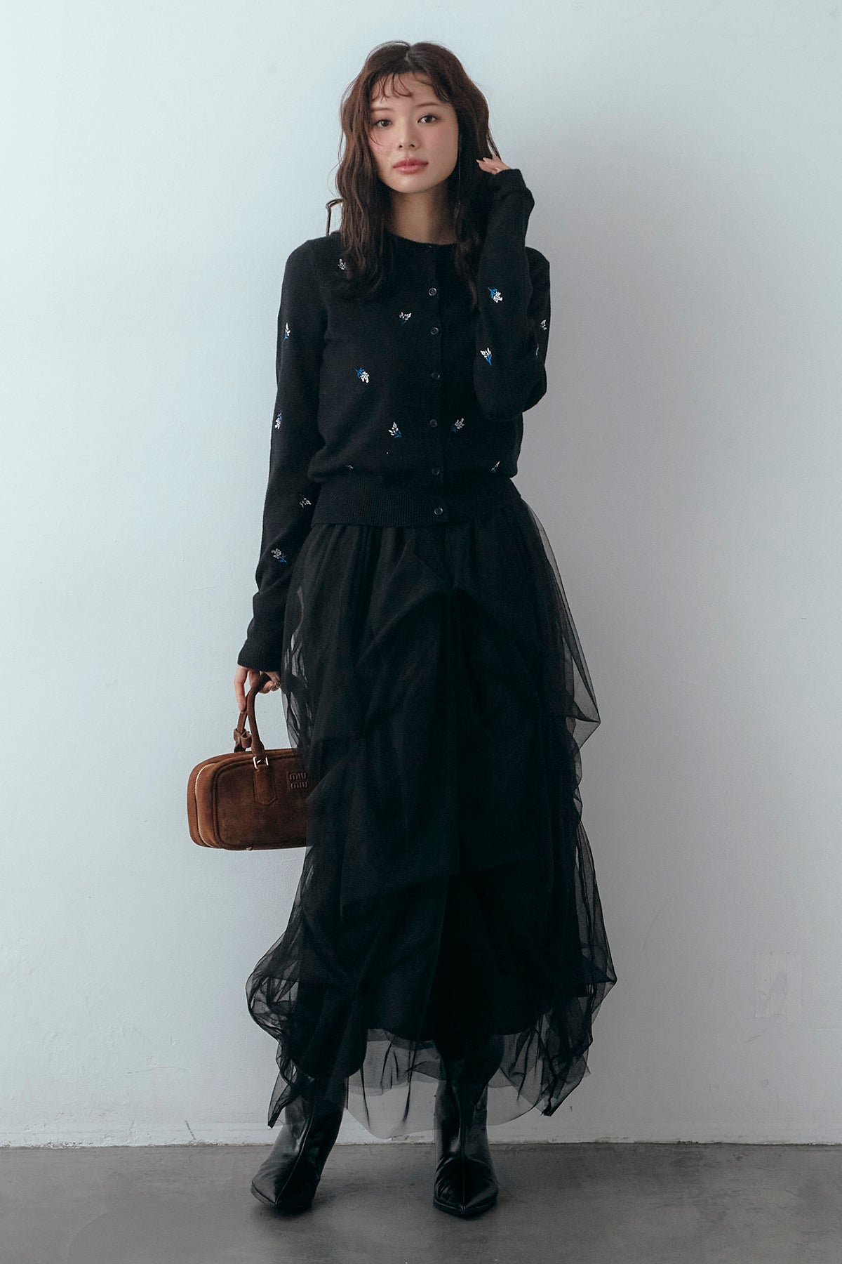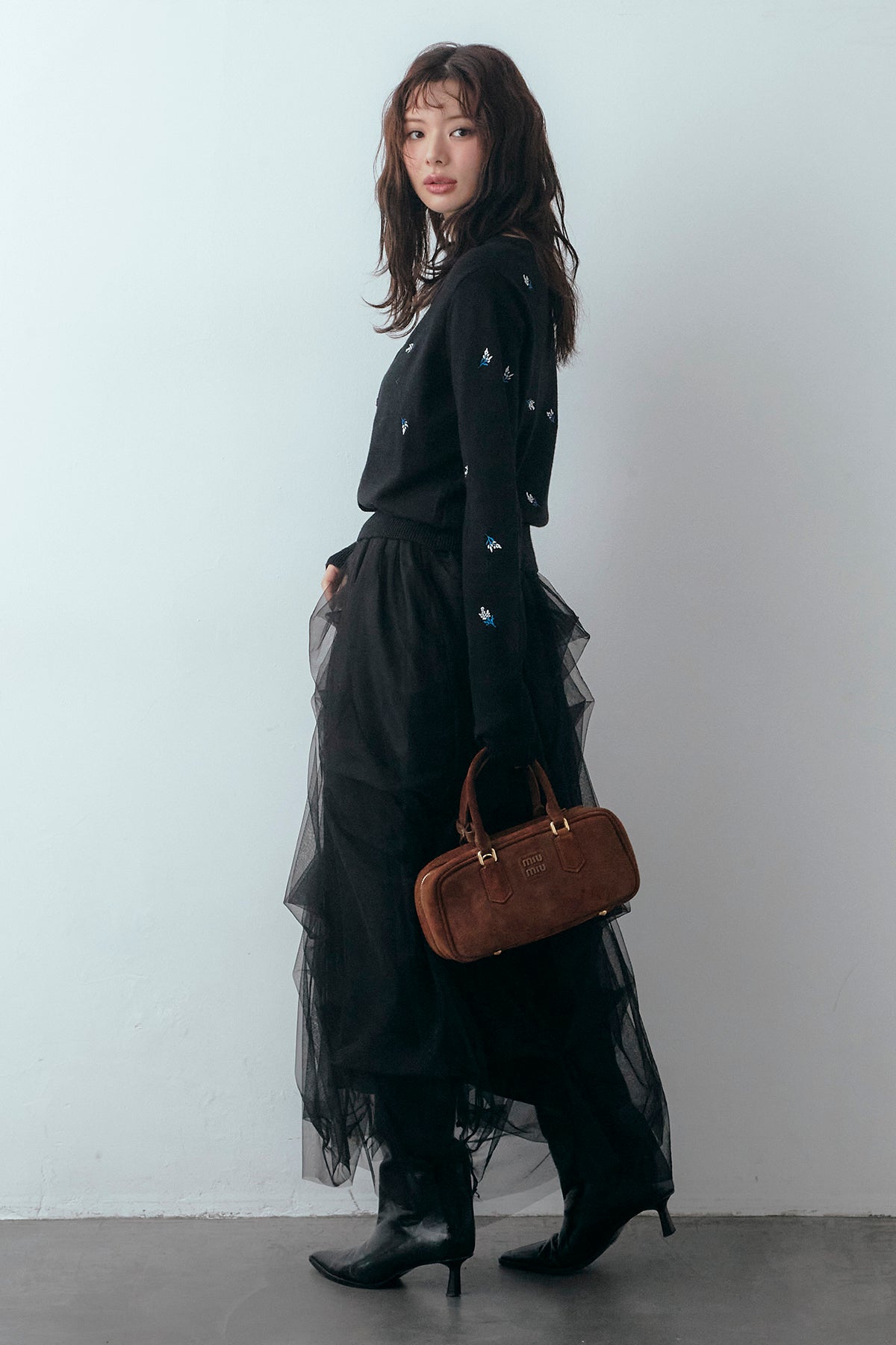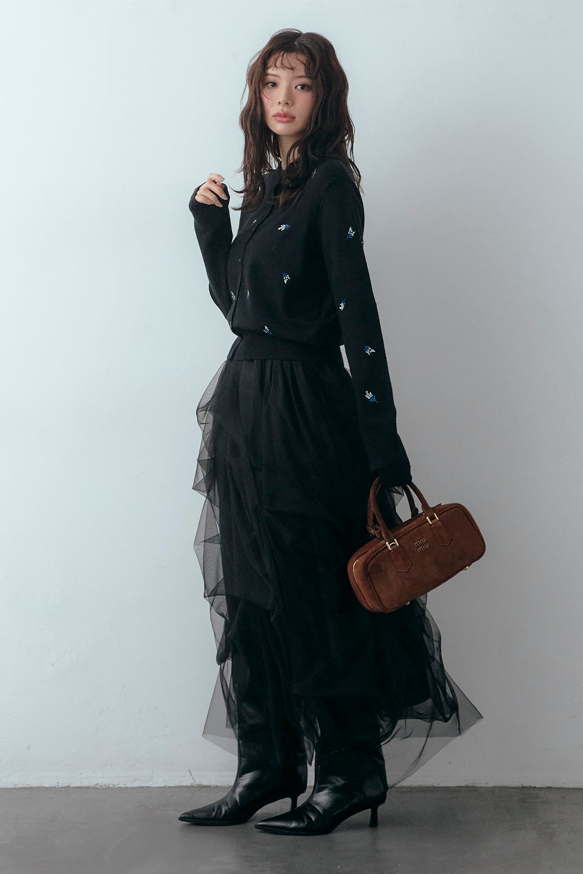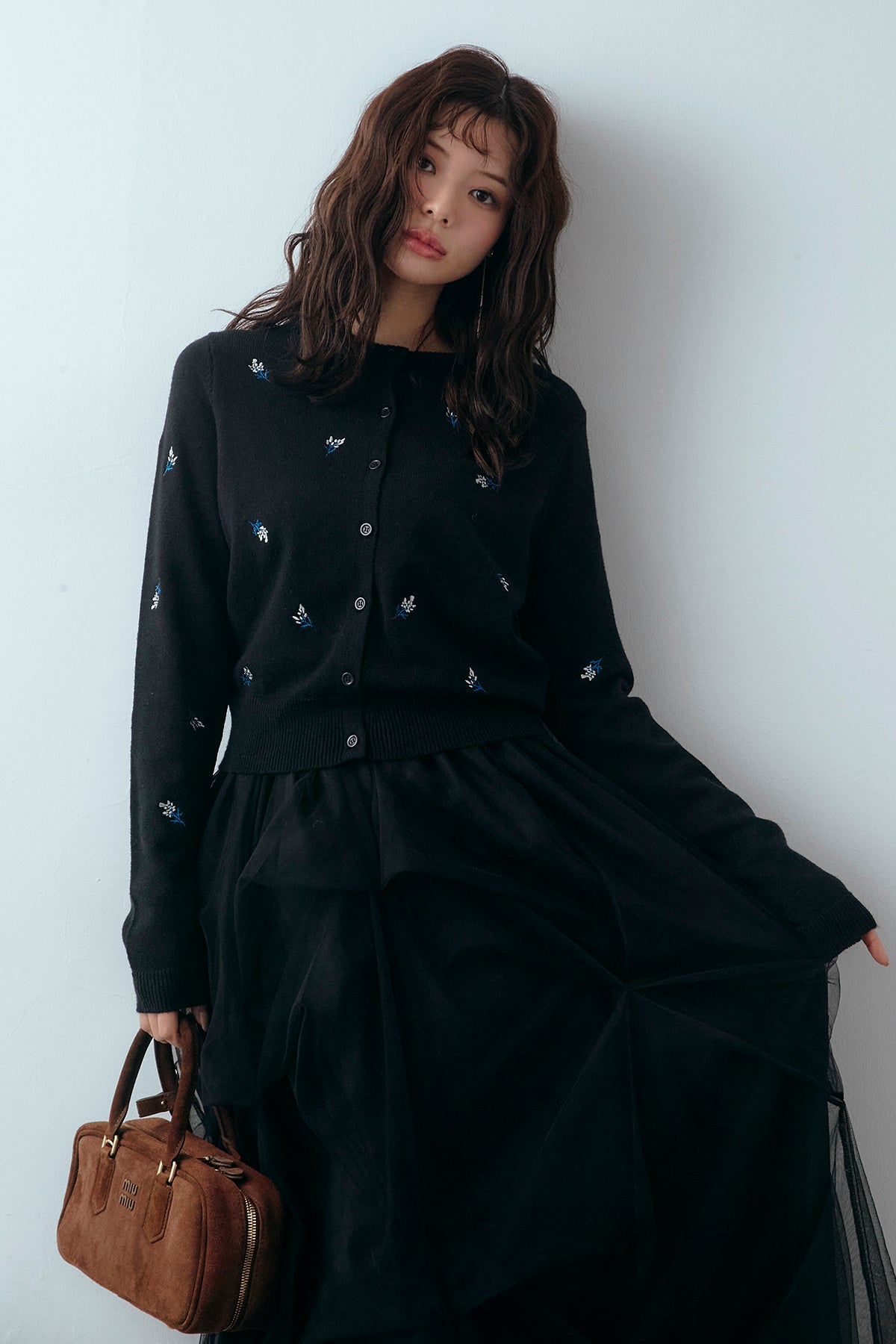 [予約/SET]ニュアンスフラワー刺繍クロップドニットカーデ+マルチパターンタックチュールスカート(2set)