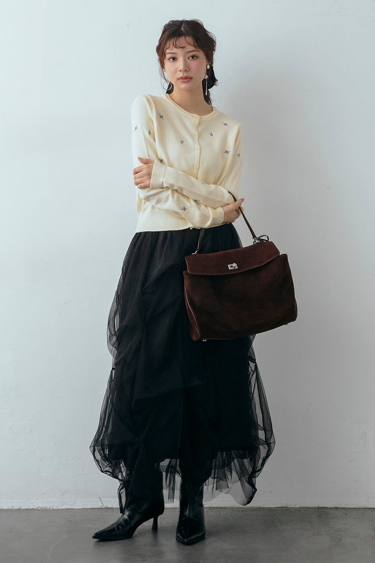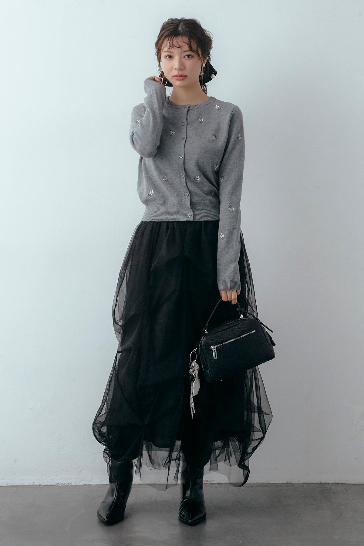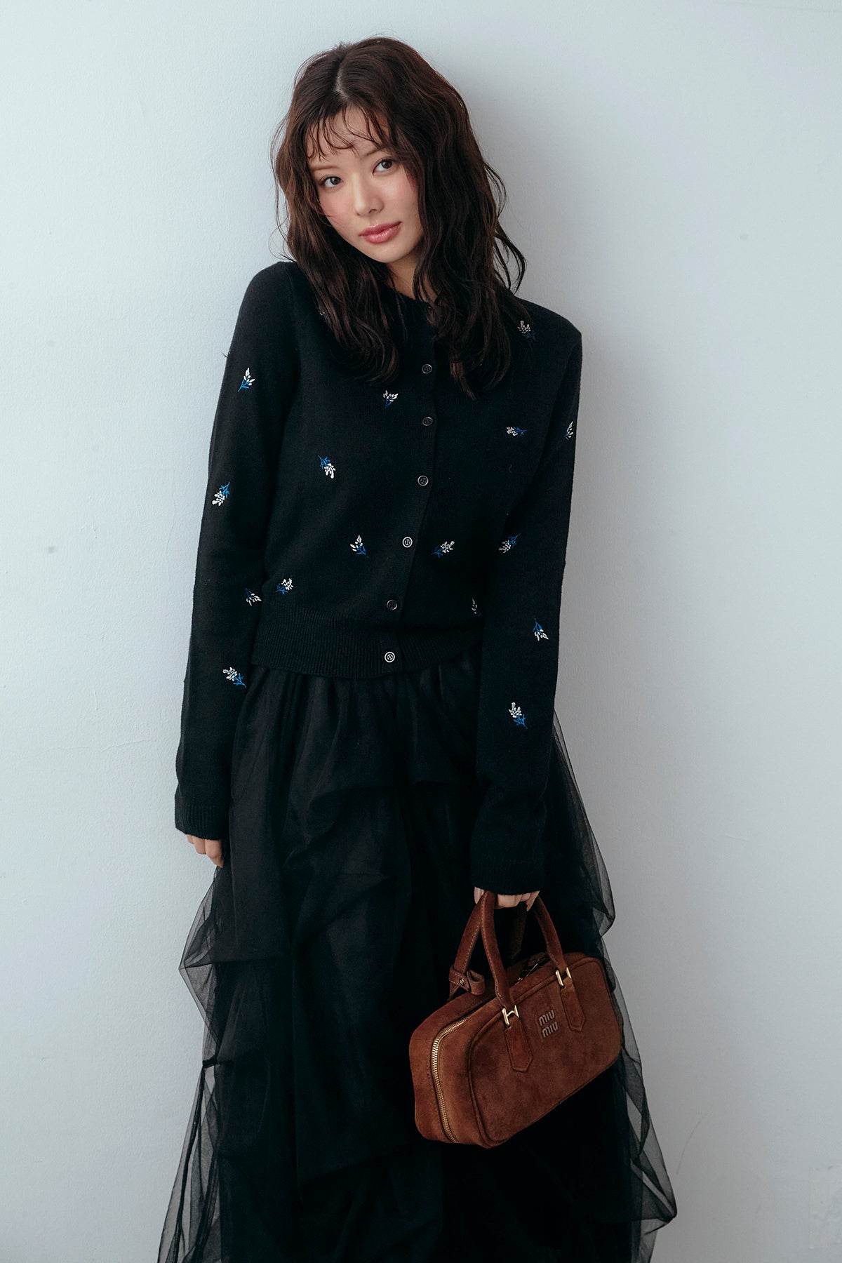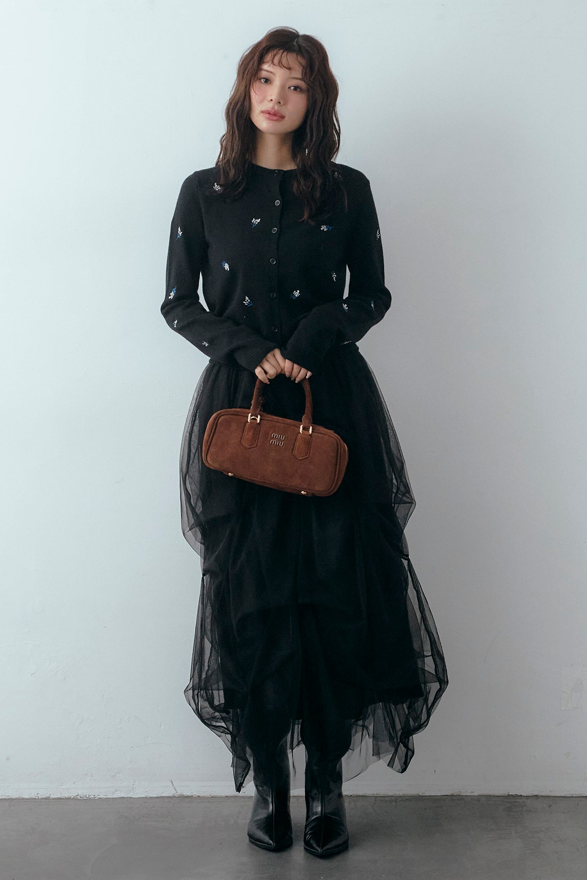 [予約/SET]ニュアンスフラワー刺繍クロップドニットカーデ+マルチパターンタックチュールスカート(2set)