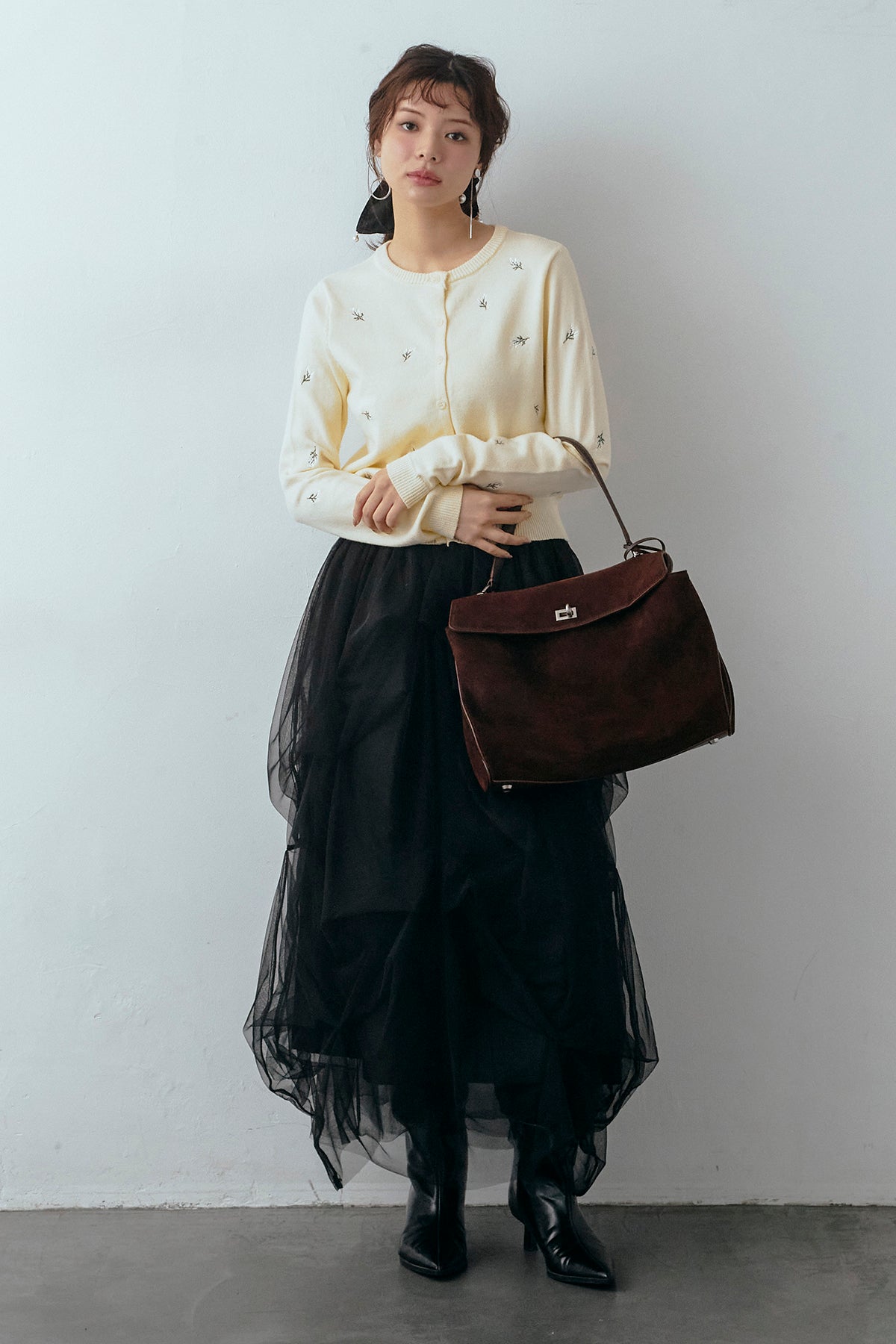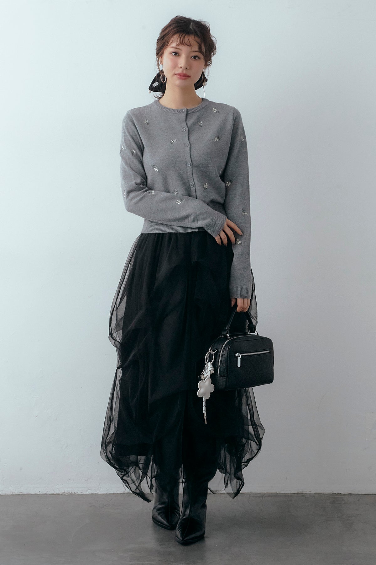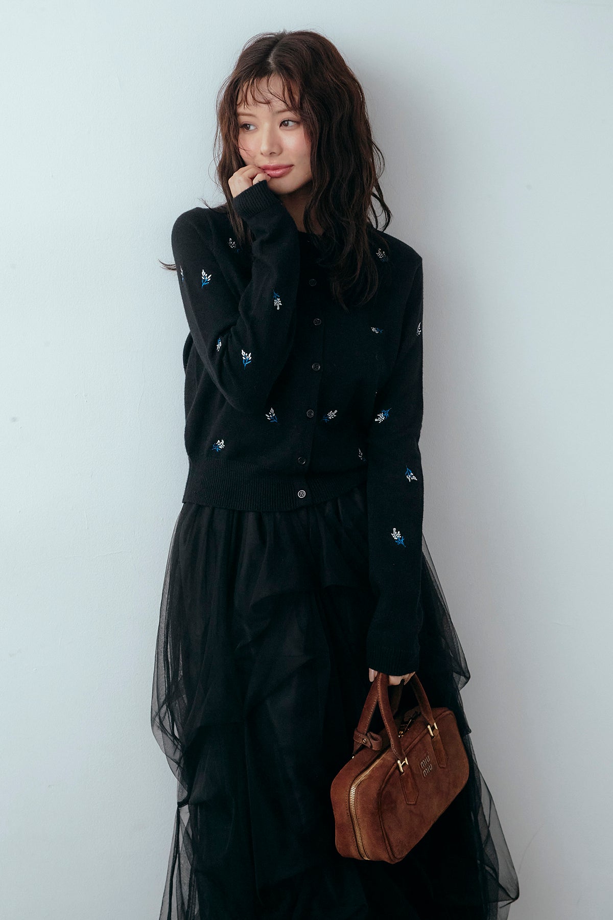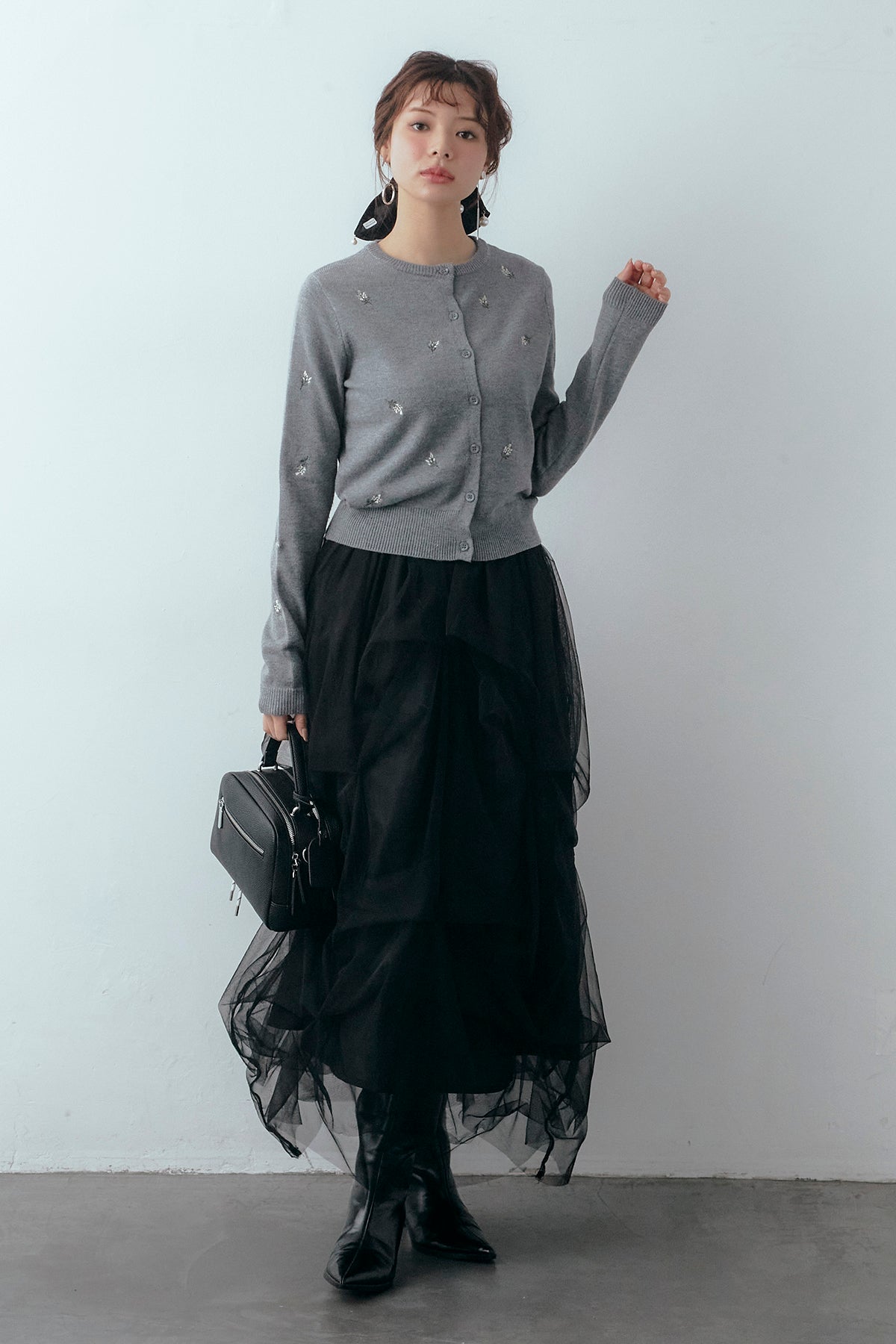 [予約/SET]ニュアンスフラワー刺繍クロップドニットカーデ+マルチパターンタックチュールスカート(2set)