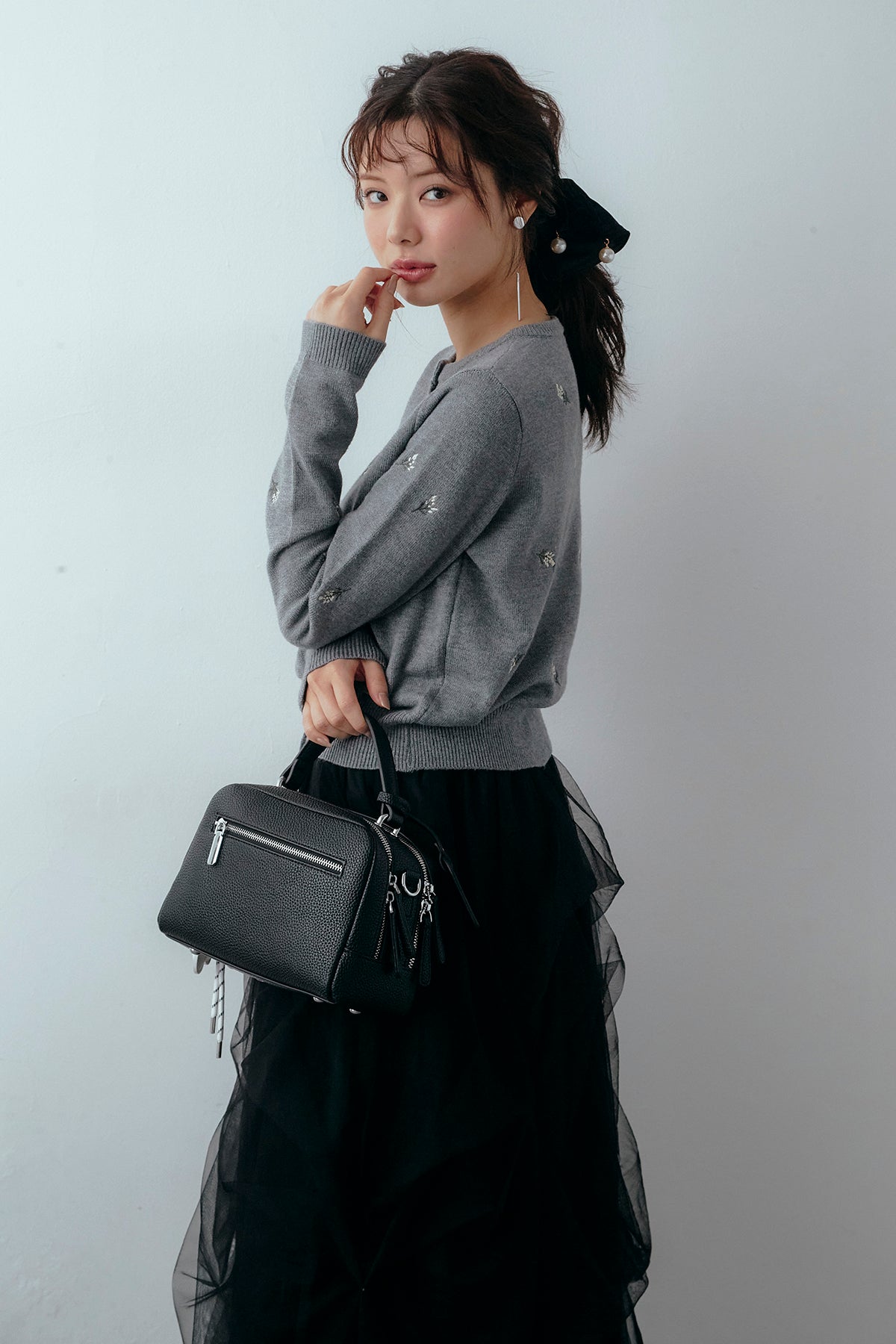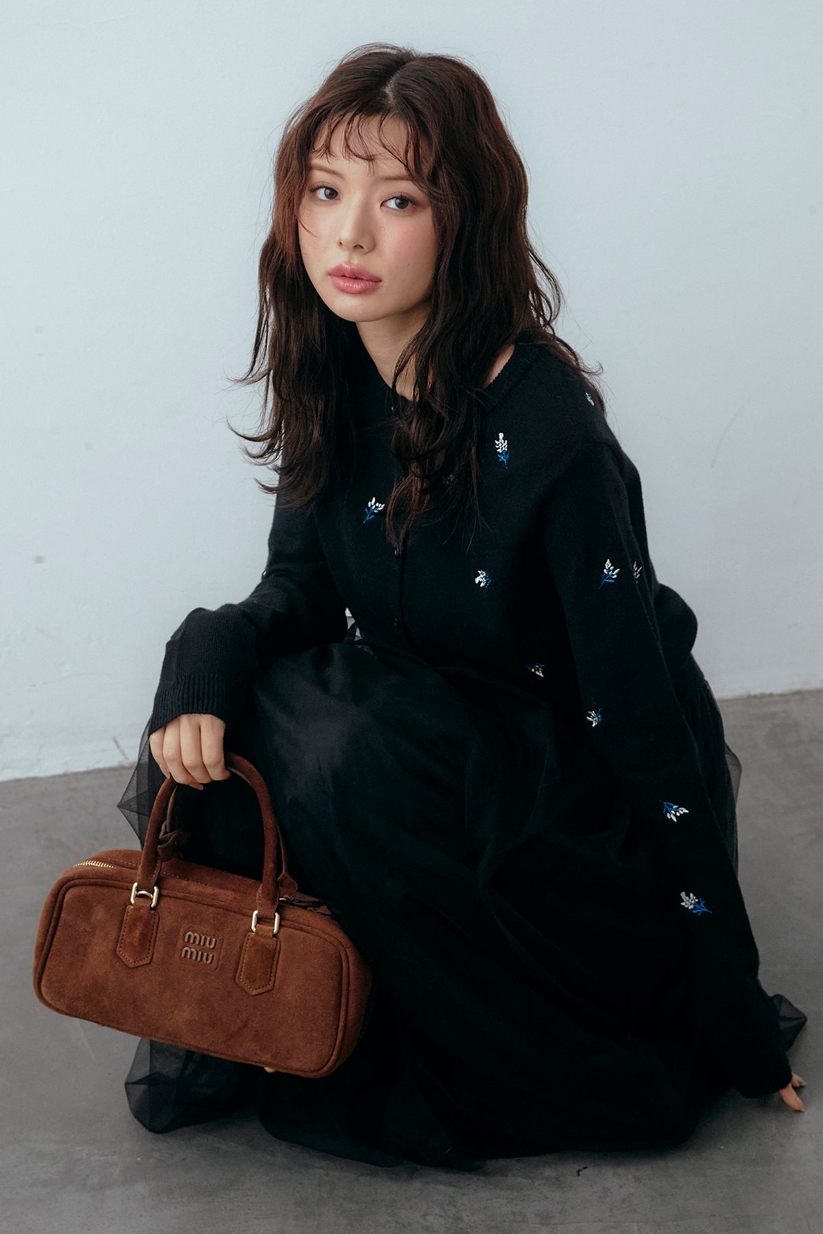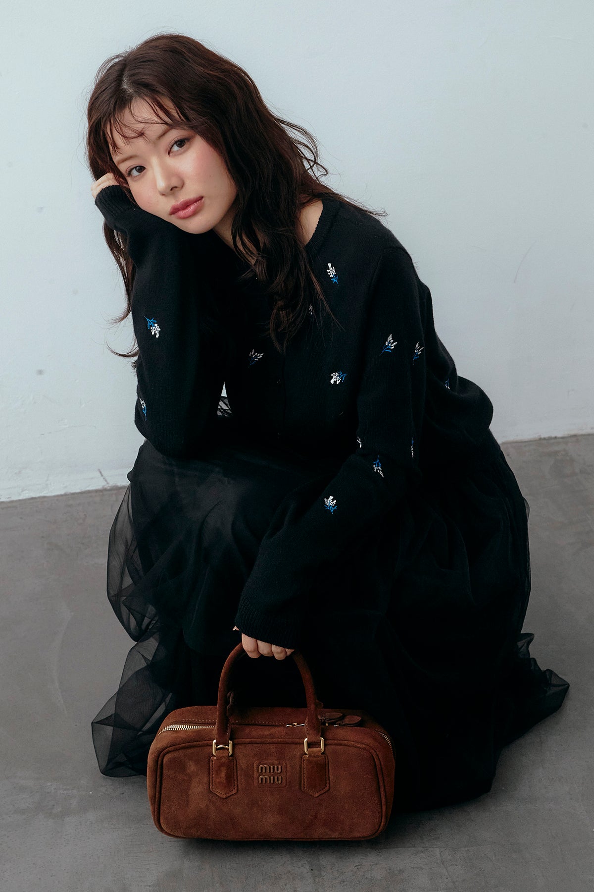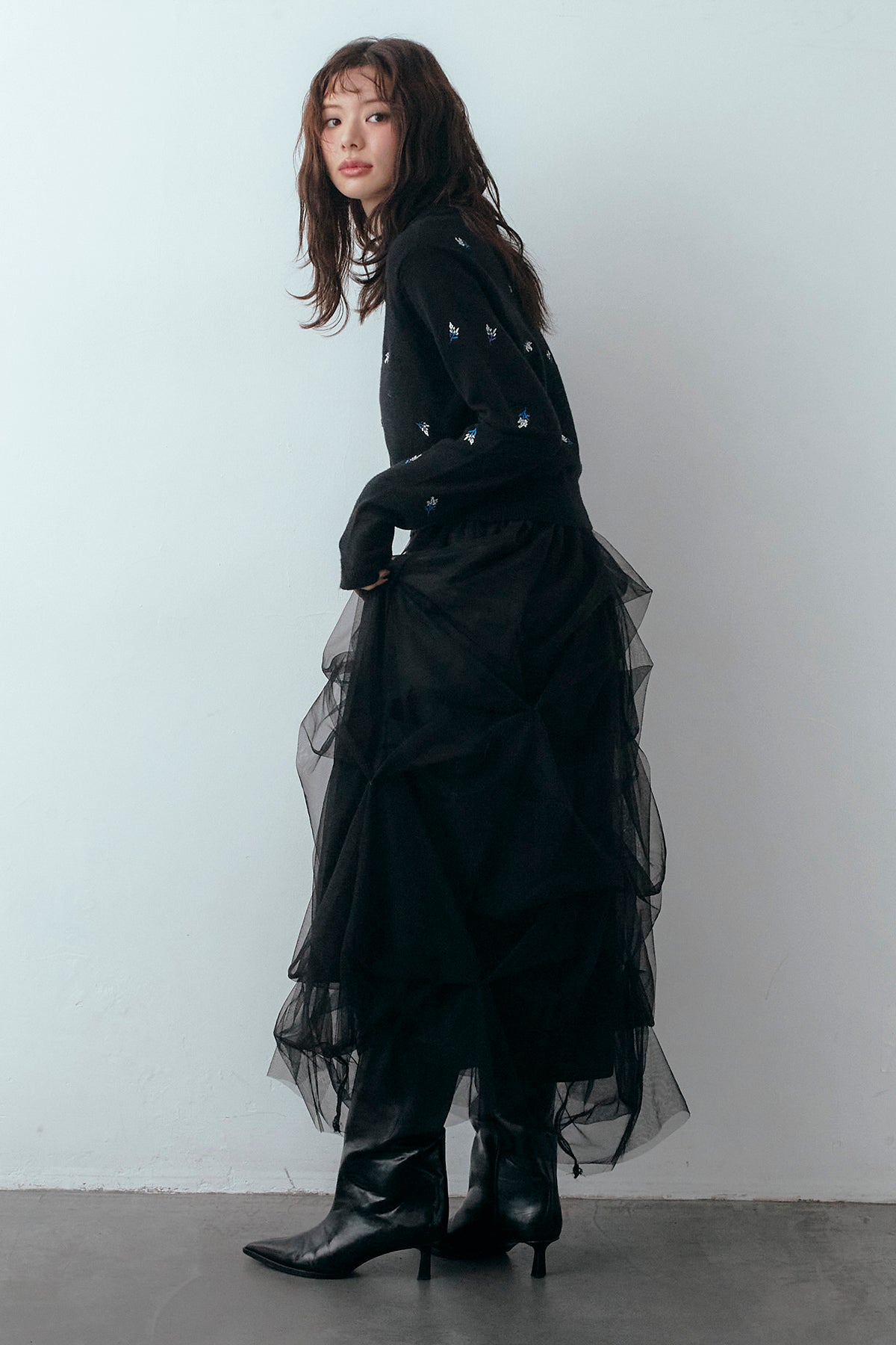 [予約/SET]ニュアンスフラワー刺繍クロップドニットカーデ+マルチパターンタックチュールスカート(2set)