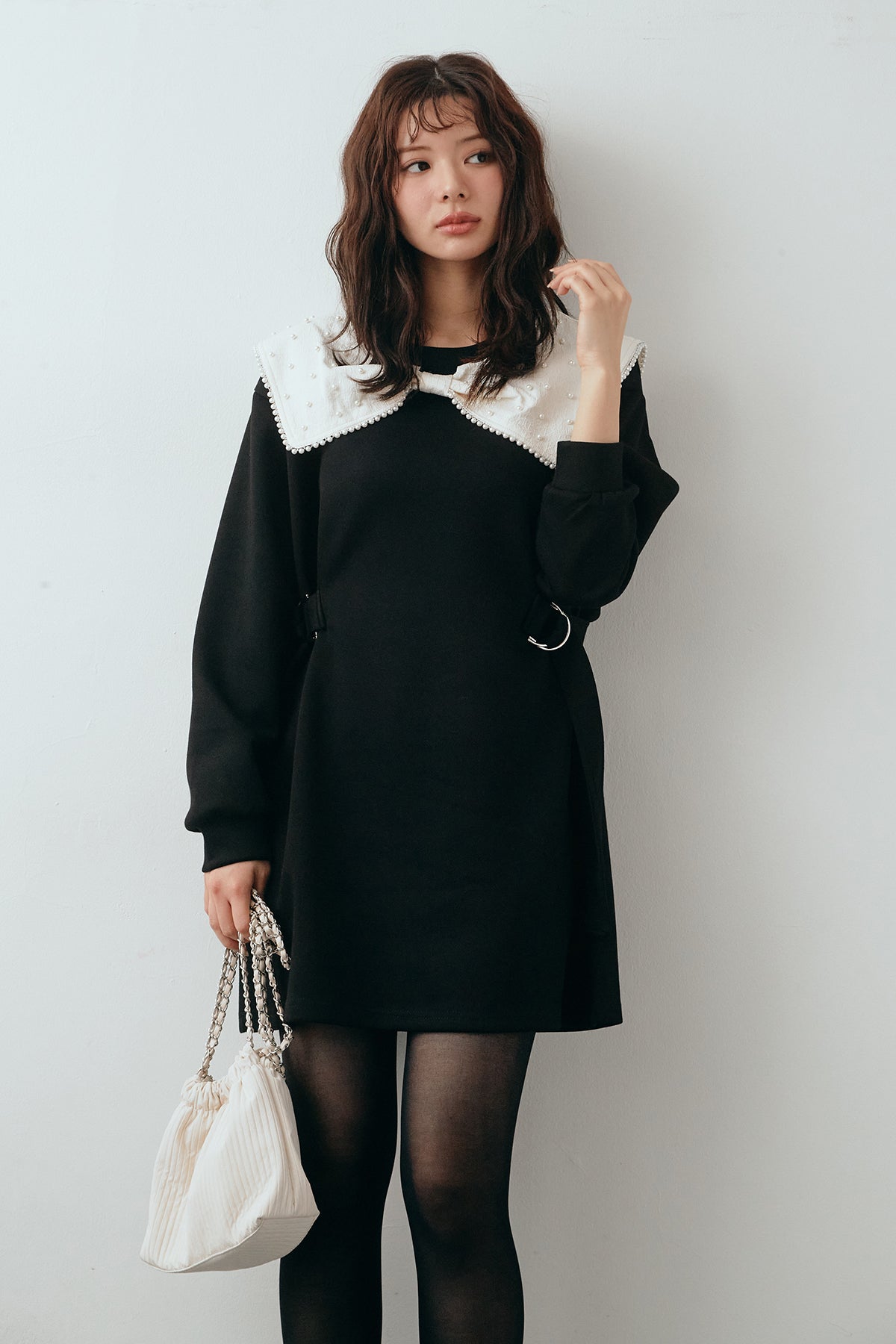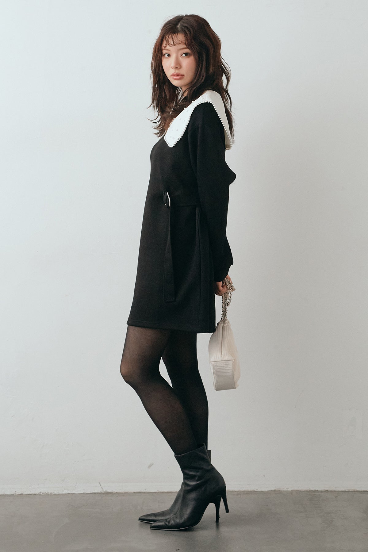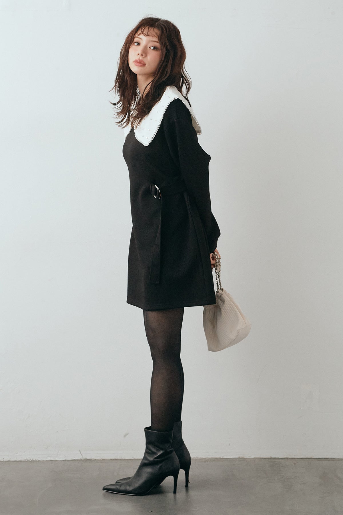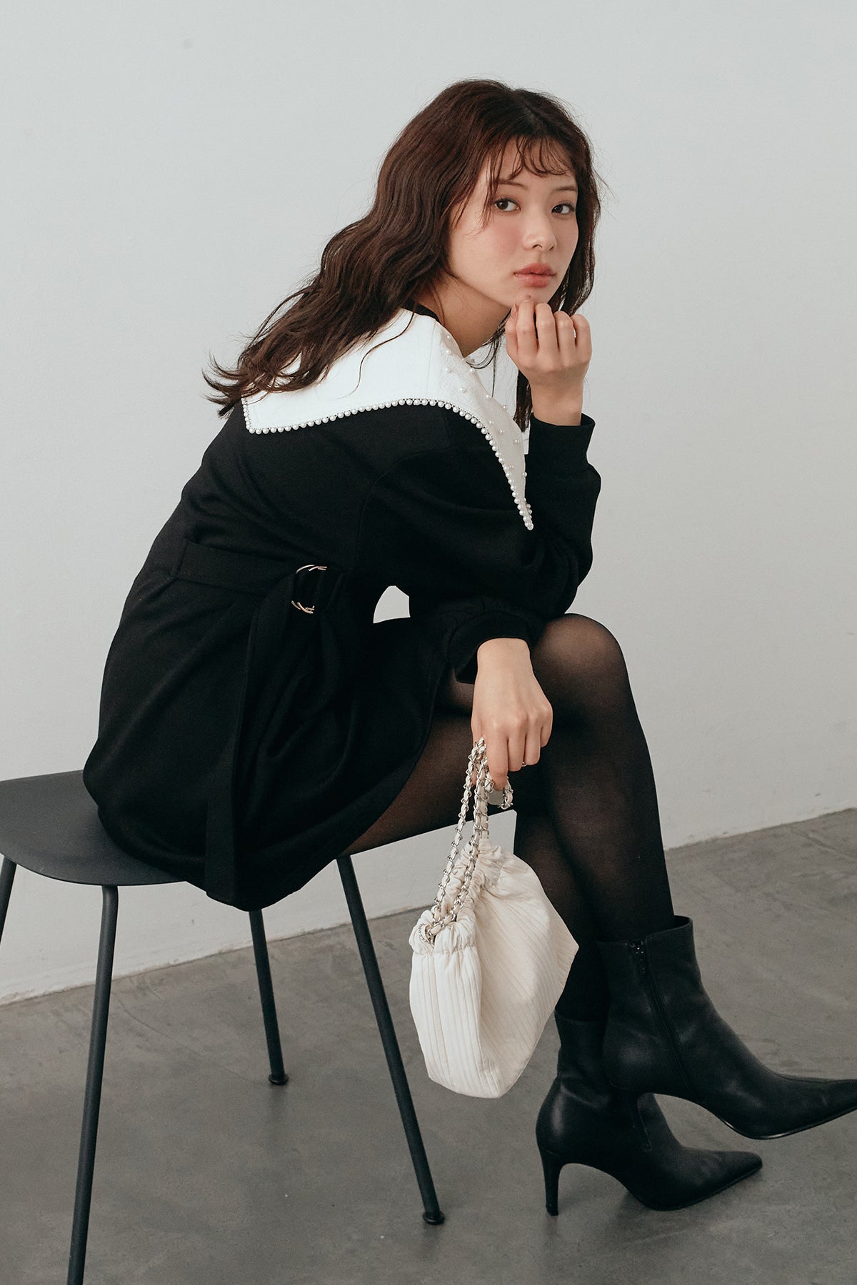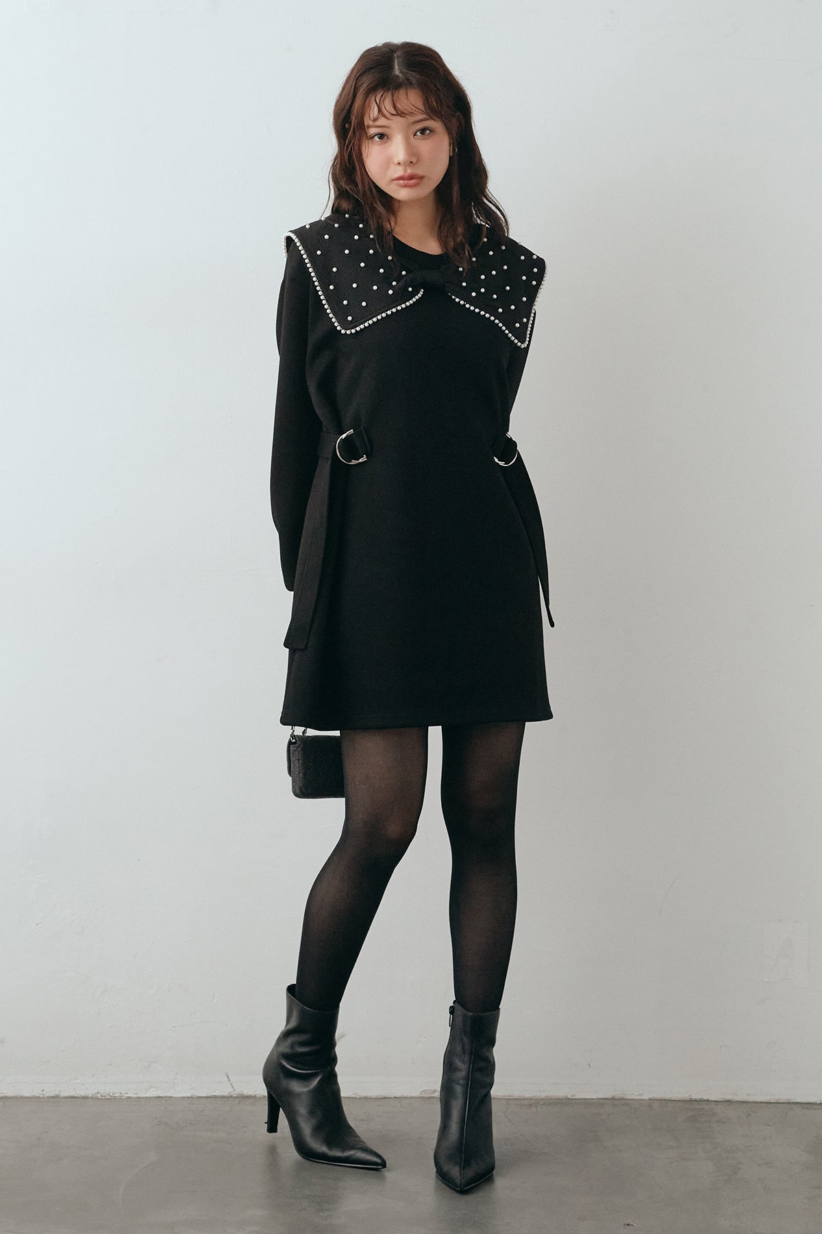 リボンとパールをあしらった襟元が印象的なミニ丈ワンピース。 視線を上に集めるデザインで、全体のバランスをすっきりと見せます。 ウエストベルトが程よくメリハリを生み、シルエットに立体感をプラス。 1枚でスタイリングが決まり、小物合わせで表情を変えられるアイテムです。
