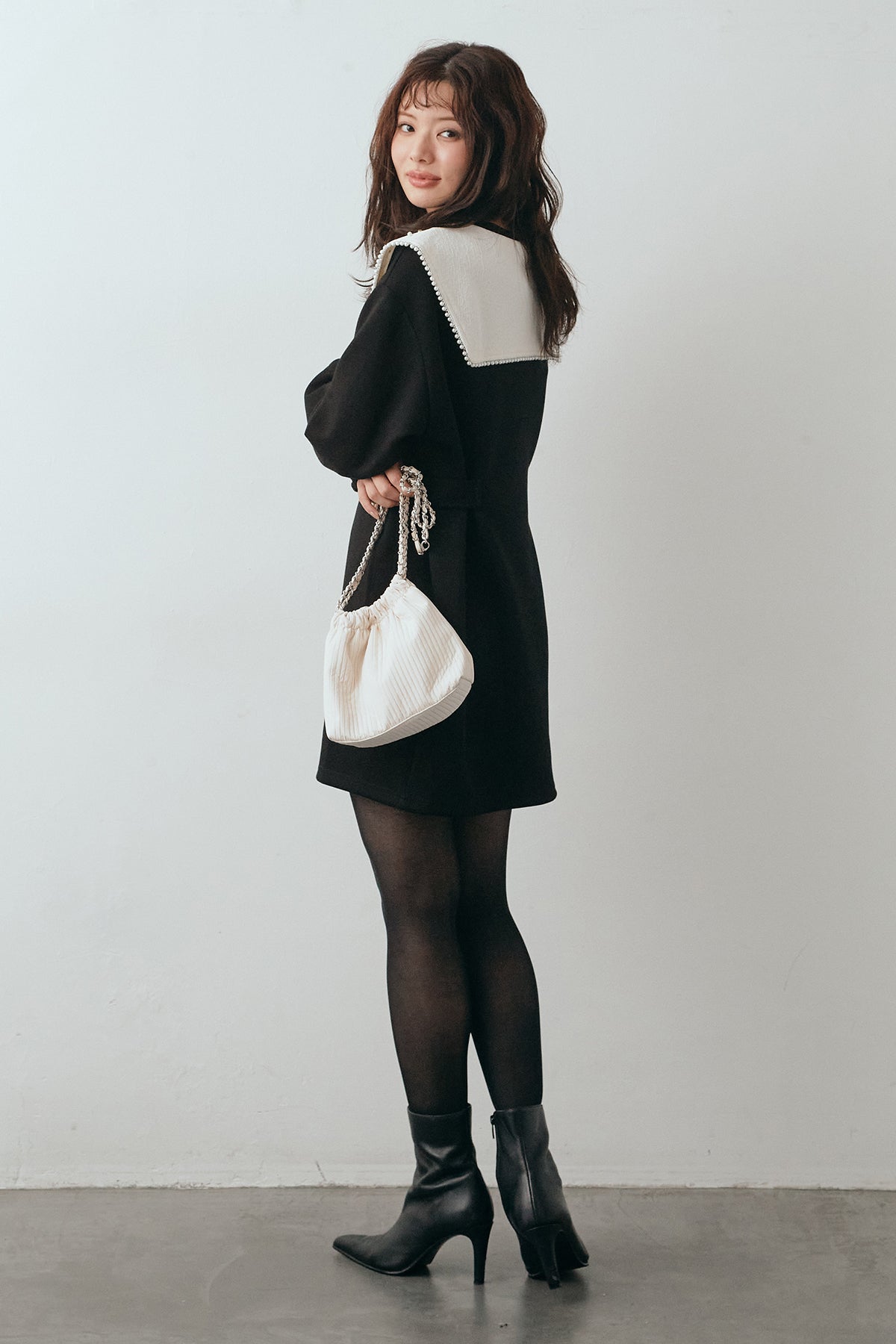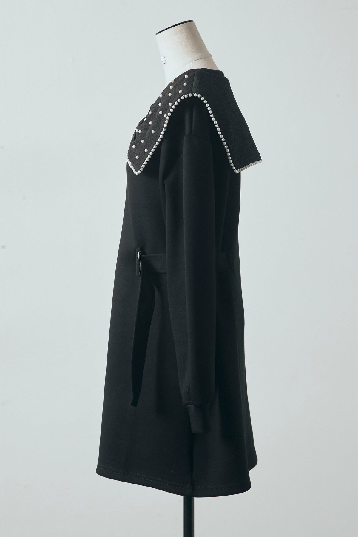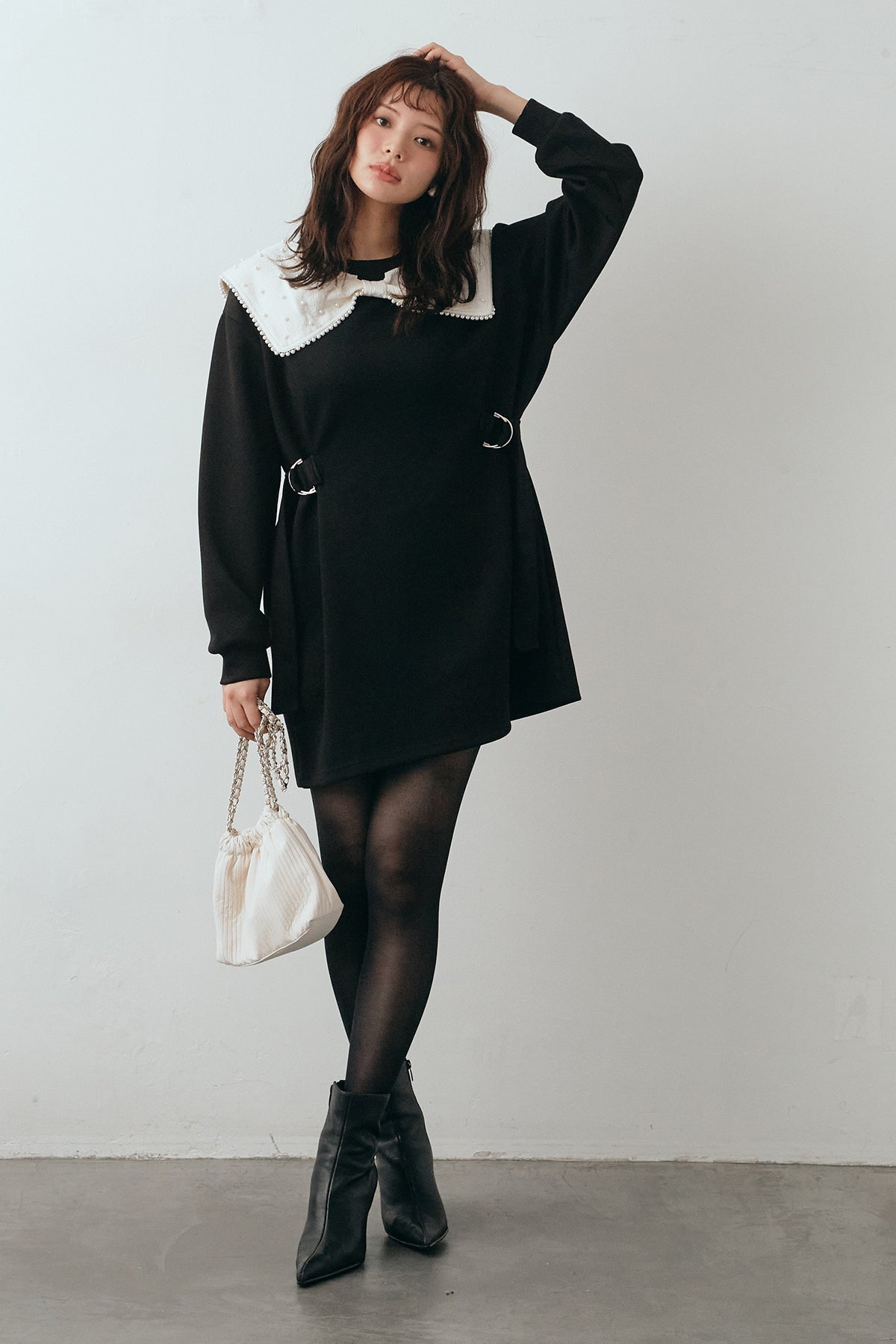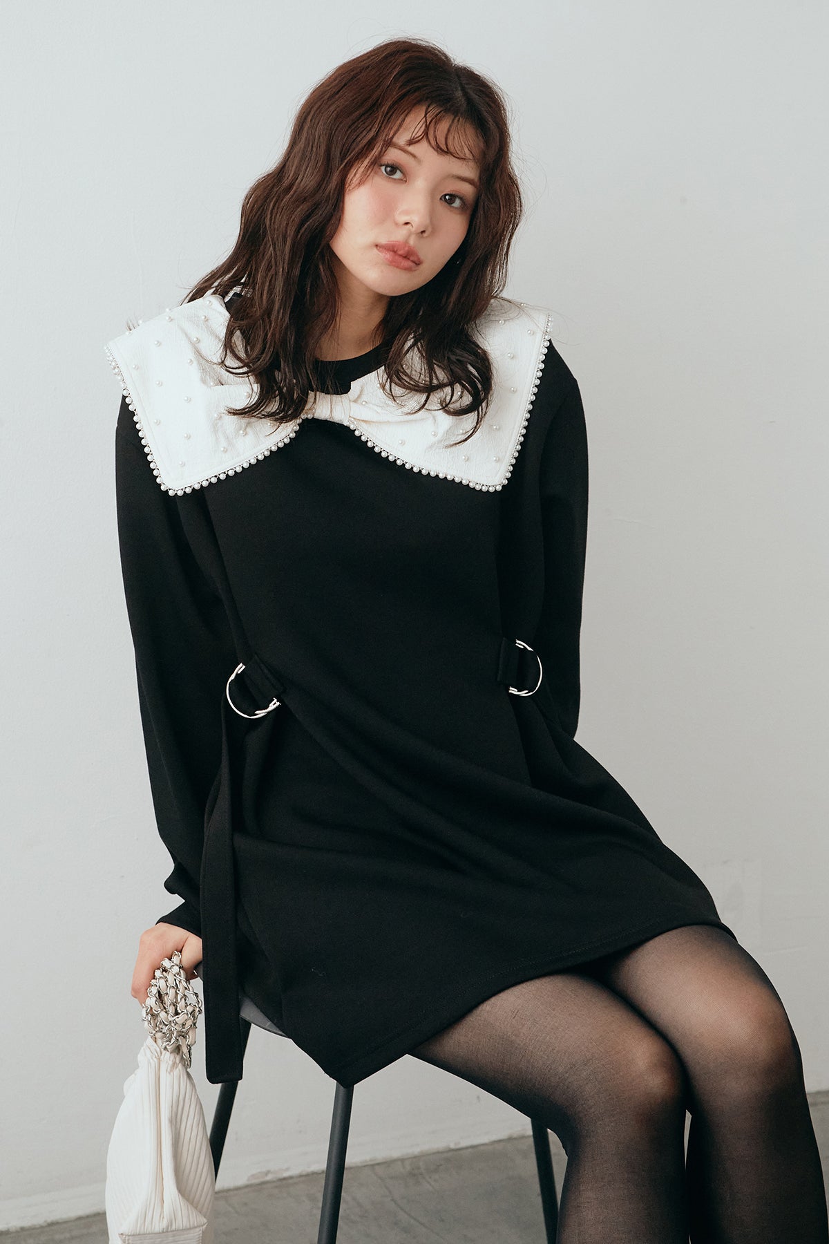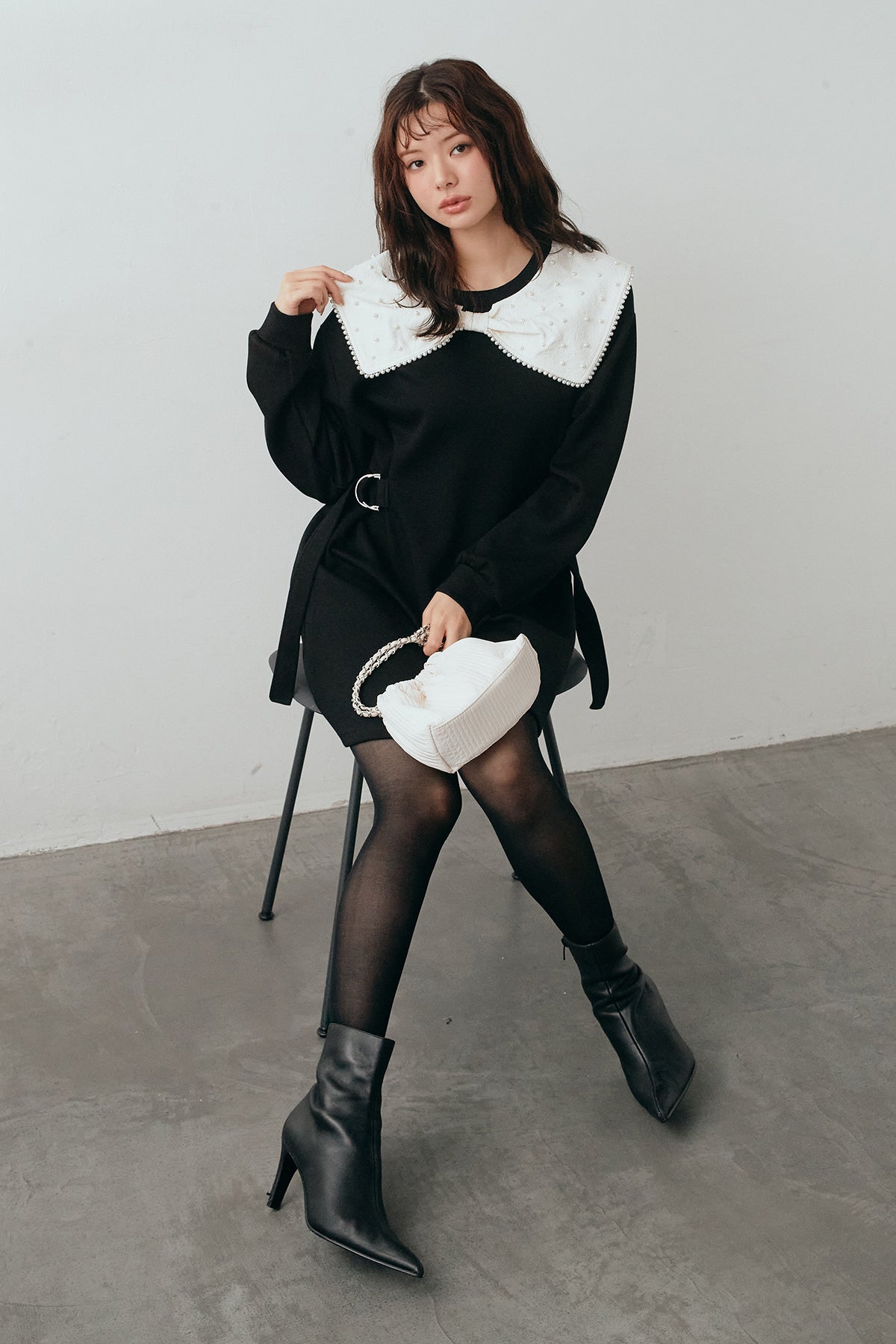 リボンとパールをあしらった襟元が印象的なミニ丈ワンピース。 視線を上に集めるデザインで、全体のバランスをすっきりと見せます。 ウエストベルトが程よくメリハリを生み、シルエットに立体感をプラス。 1枚でスタイリングが決まり、小物合わせで表情を変えられるアイテムです。