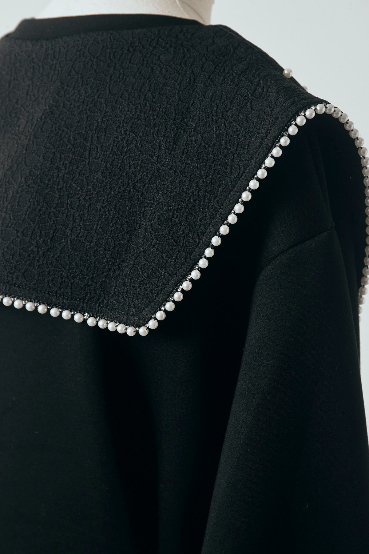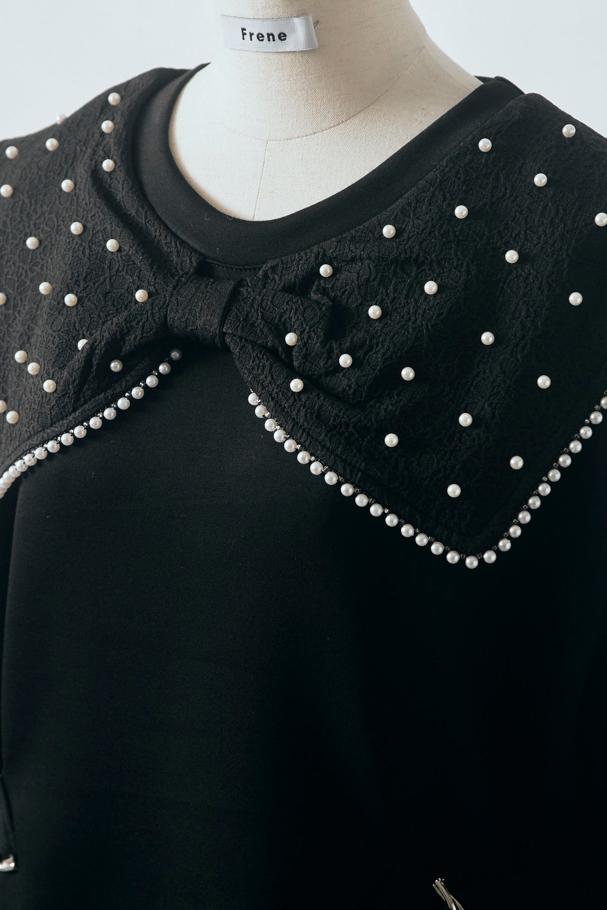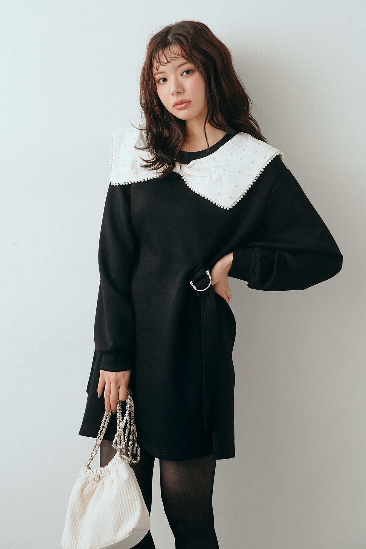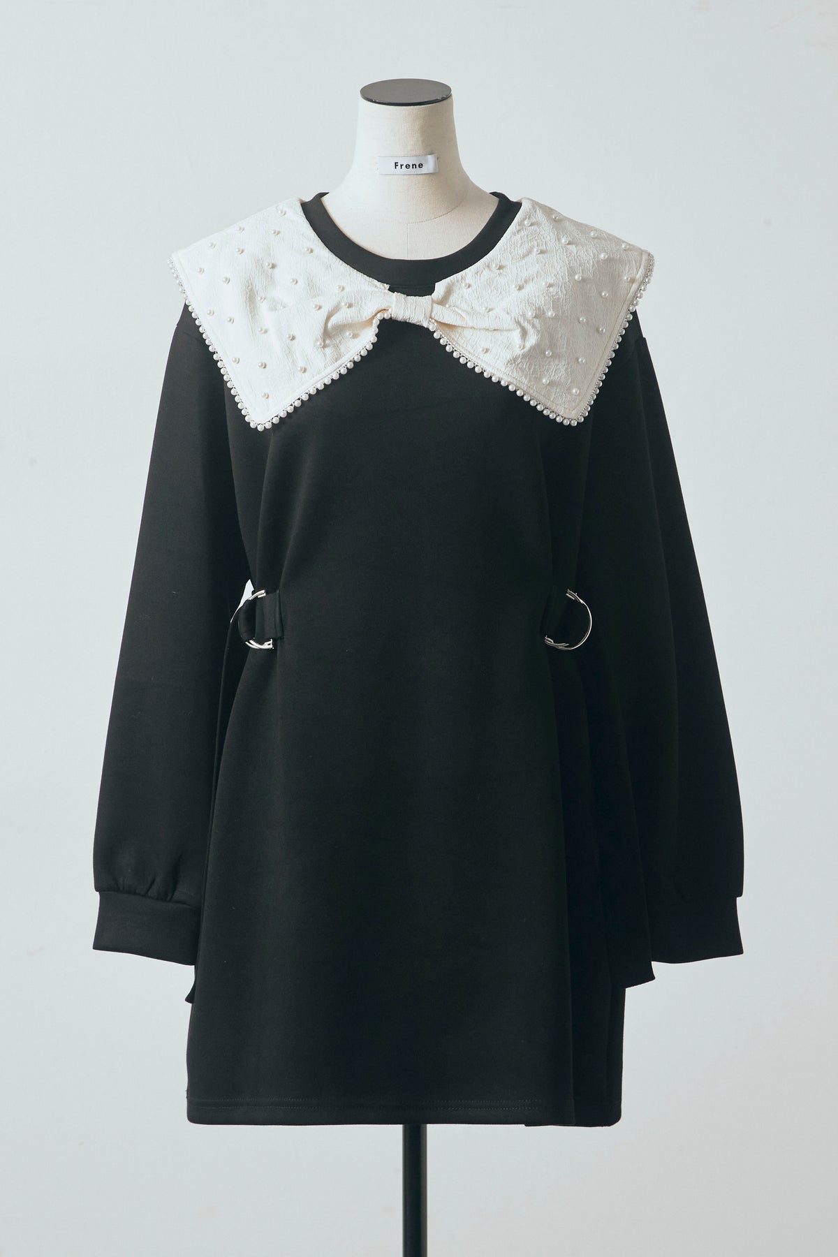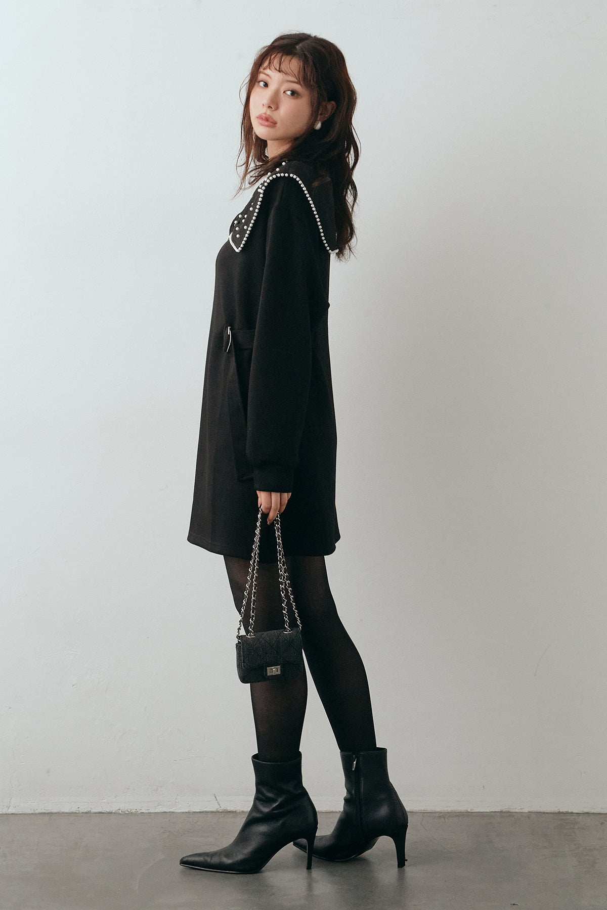リボンとパールをあしらった襟元が印象的なミニ丈ワンピース。 視線を上に集めるデザインで、全体のバランスをすっきりと見せます。 ウエストベルトが程よくメリハリを生み、シルエットに立体感をプラス。 1枚でスタイリングが決まり、小物合わせで表情を変えられるアイテムです。