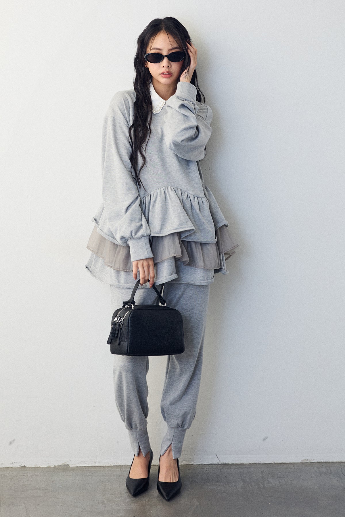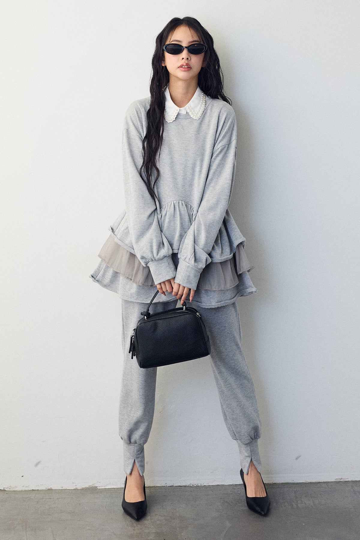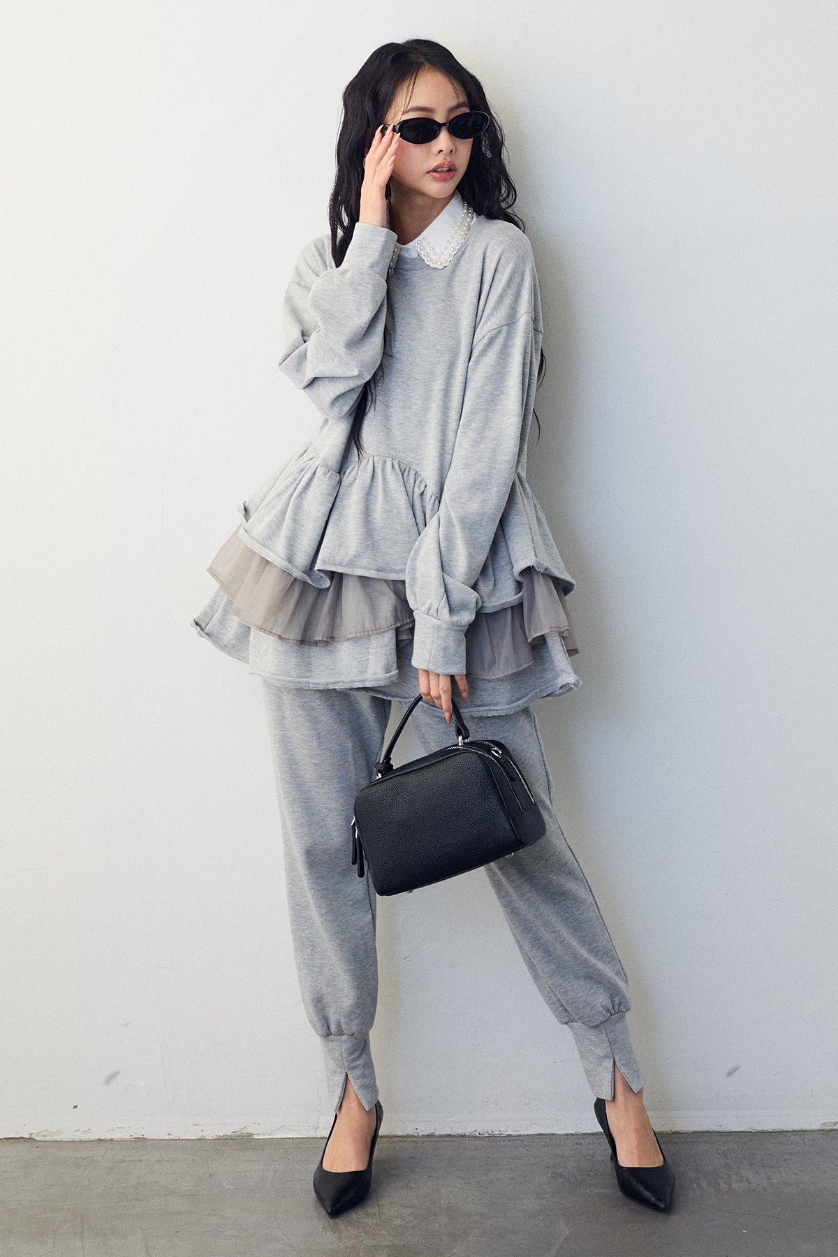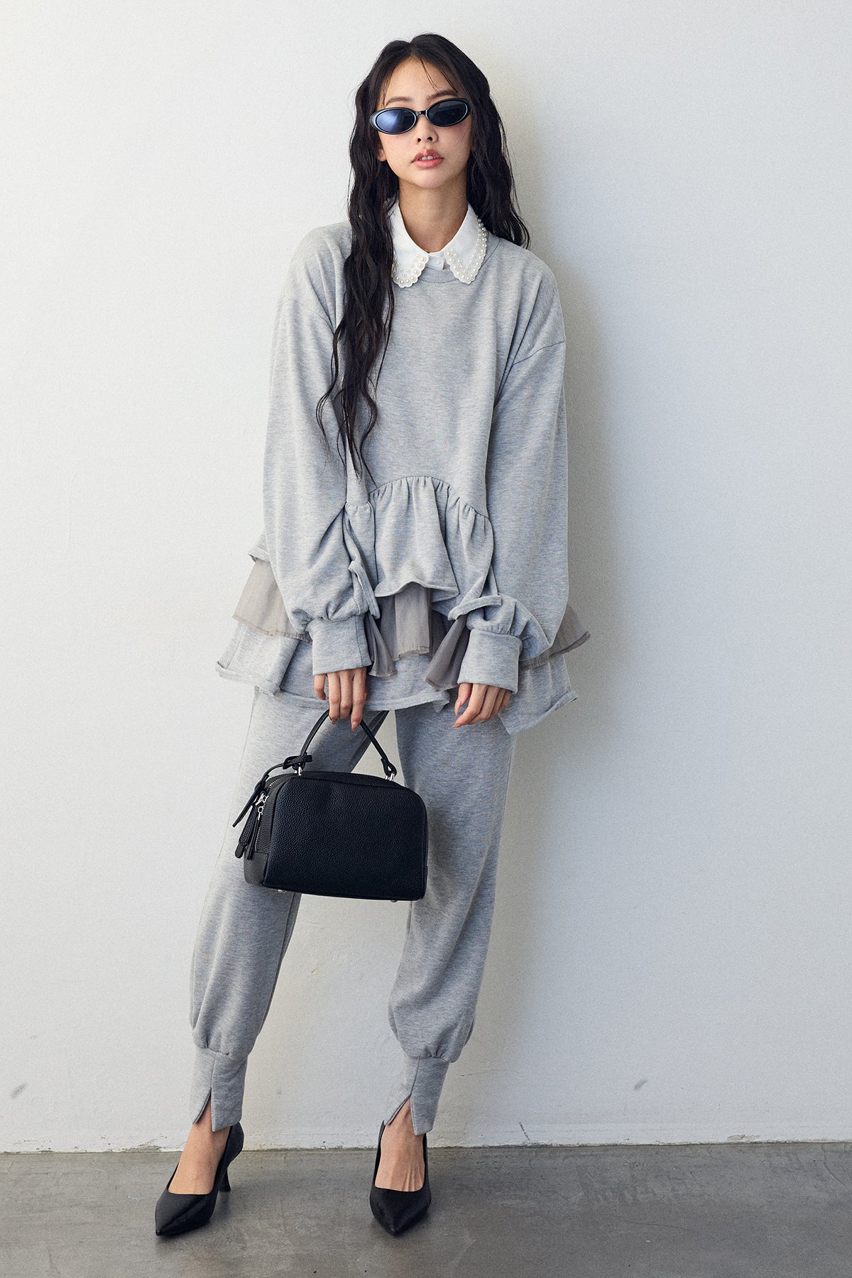 [予約/SET]2連パール付け襟+異素材ミックスフリルティアードスウェットPO+ライトスウェット美ラインジョガーパンツ(3set)