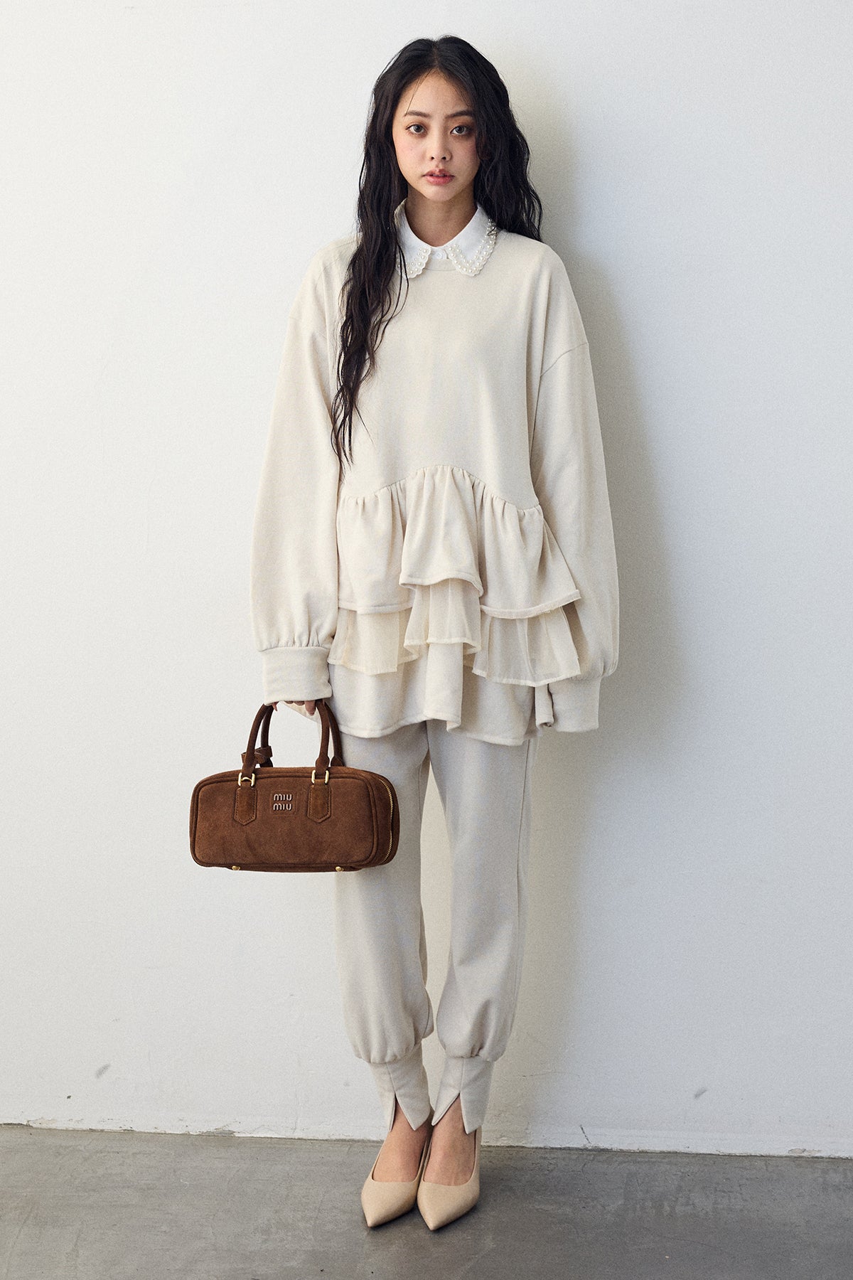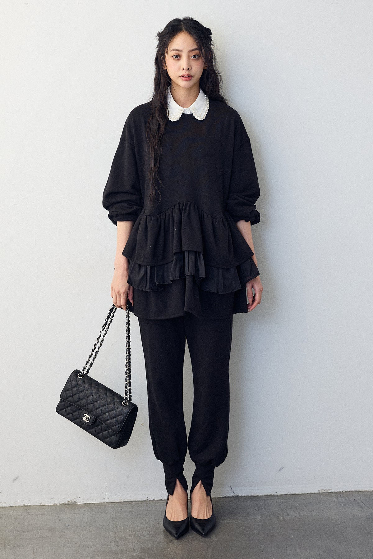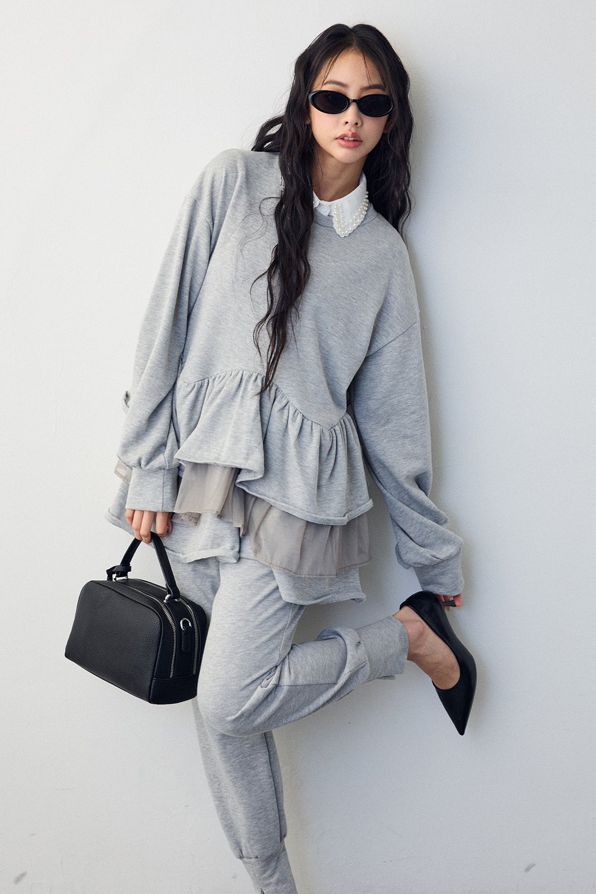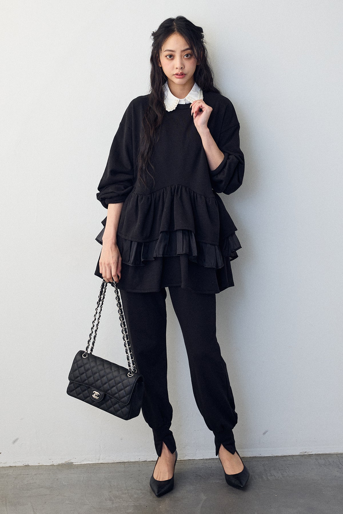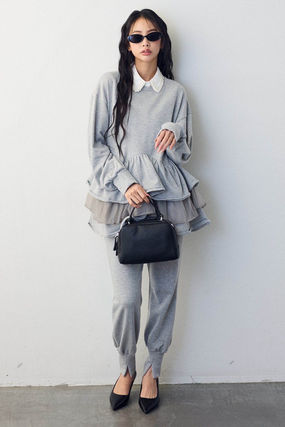 [予約/SET]2連パール付け襟+異素材ミックスフリルティアードスウェットPO+ライトスウェット美ラインジョガーパンツ(3set)
