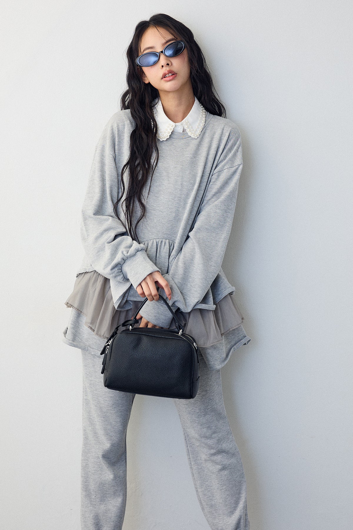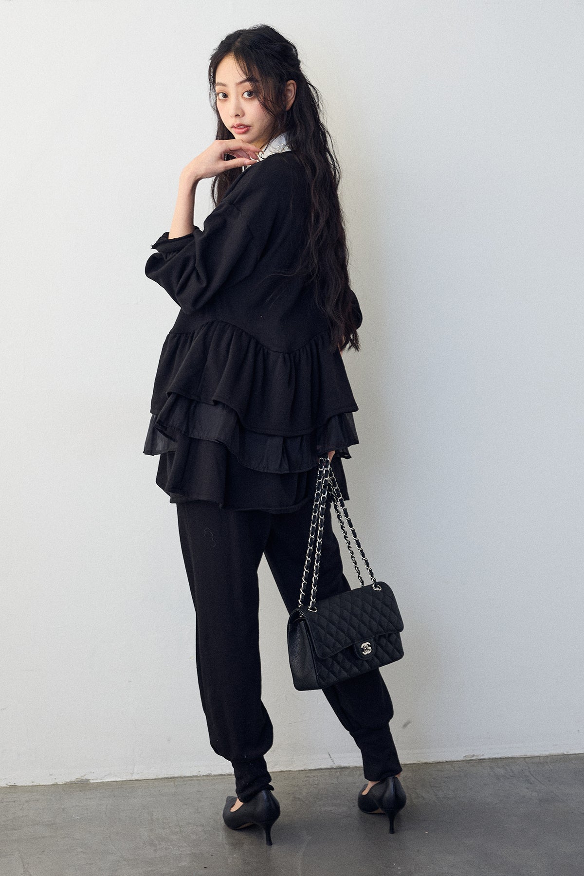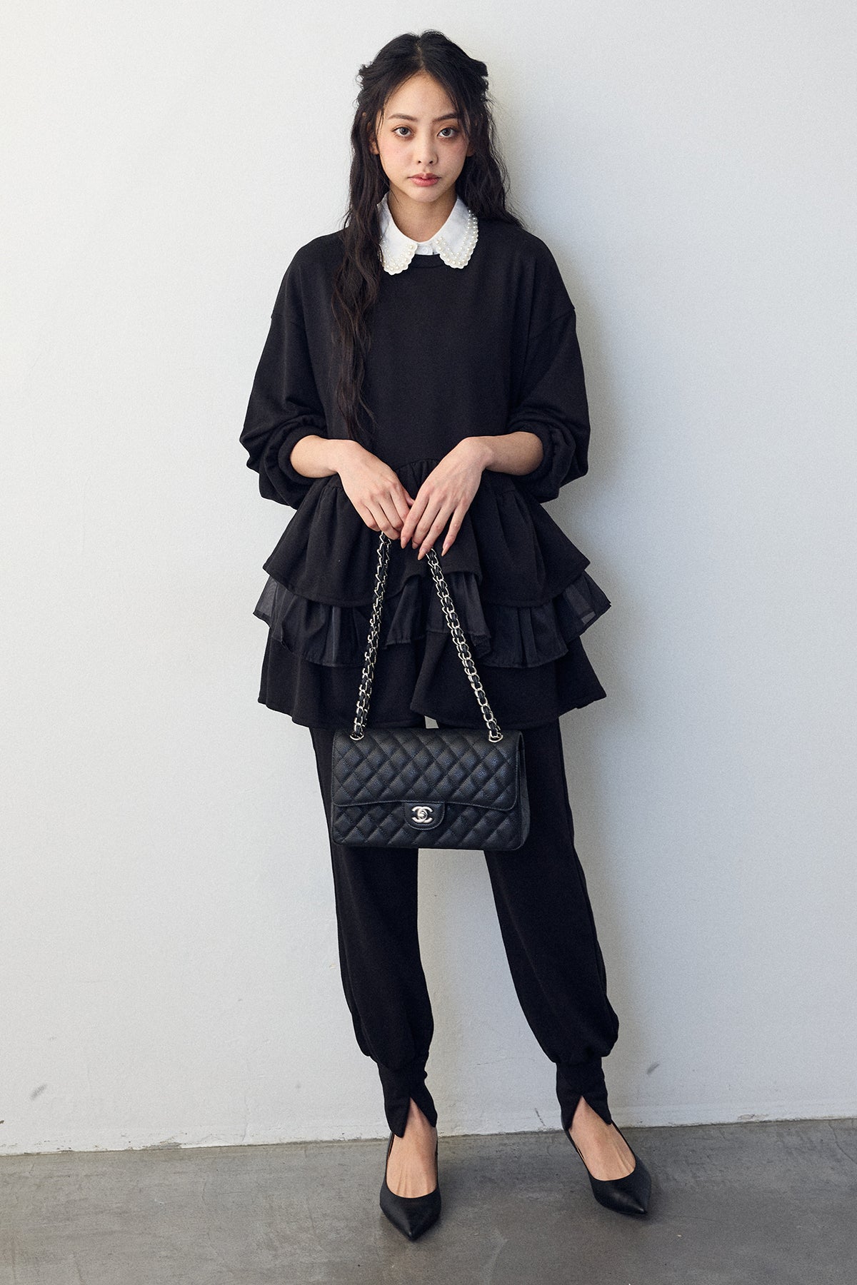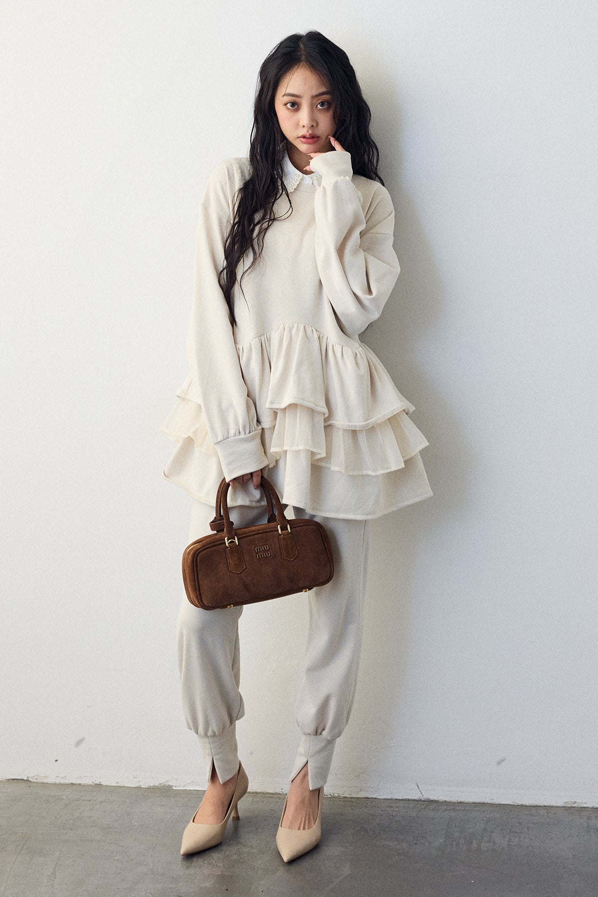 [予約/SET]2連パール付け襟+異素材ミックスフリルティアードスウェットPO+ライトスウェット美ラインジョガーパンツ(3set)