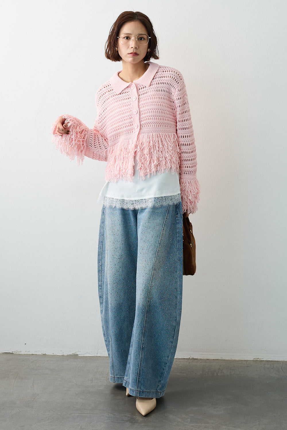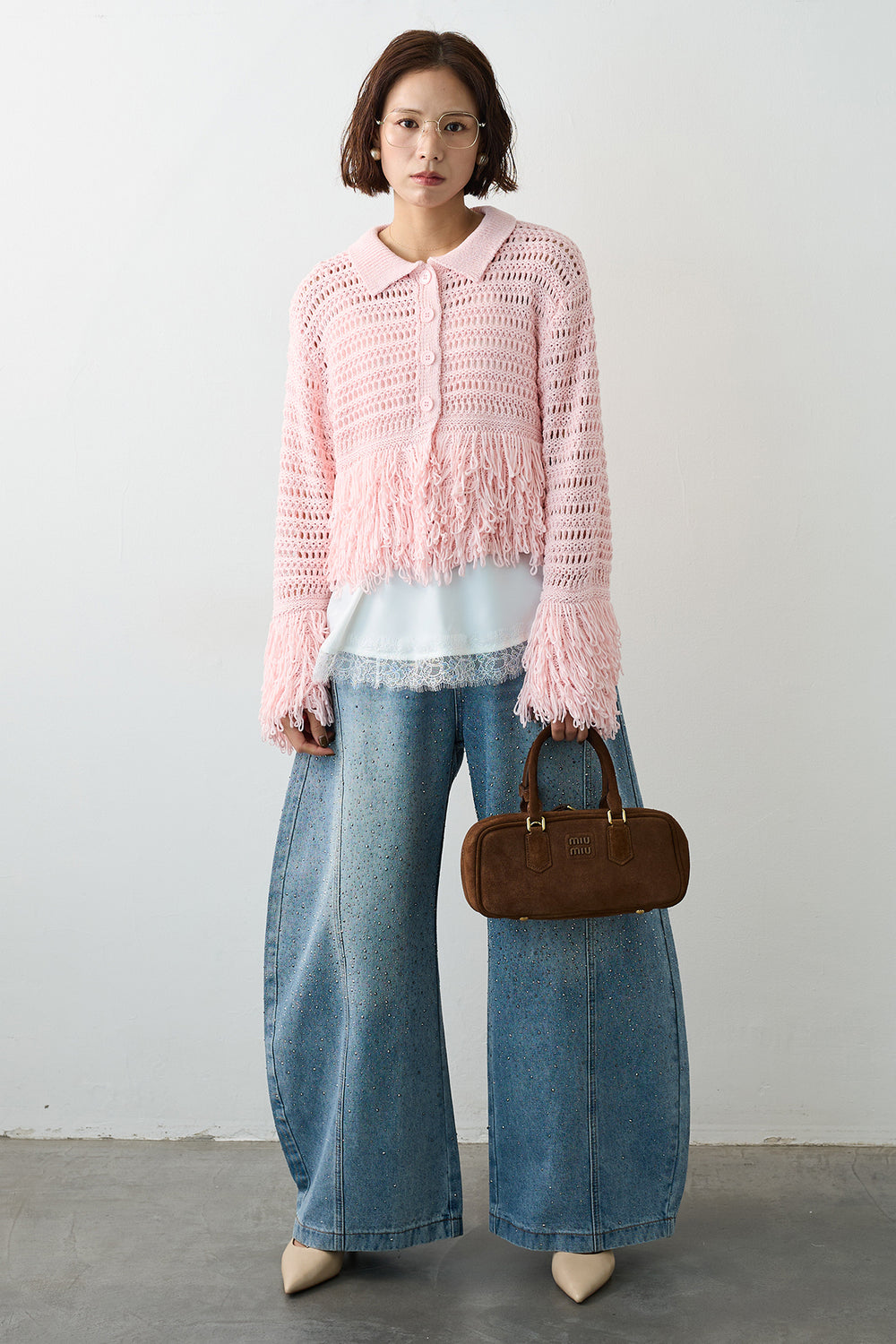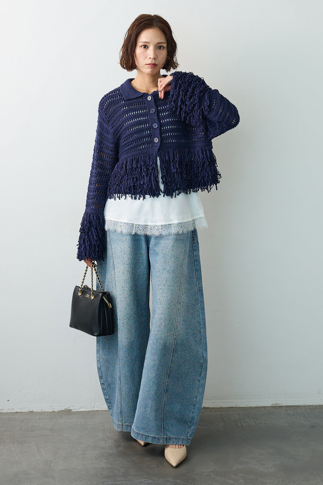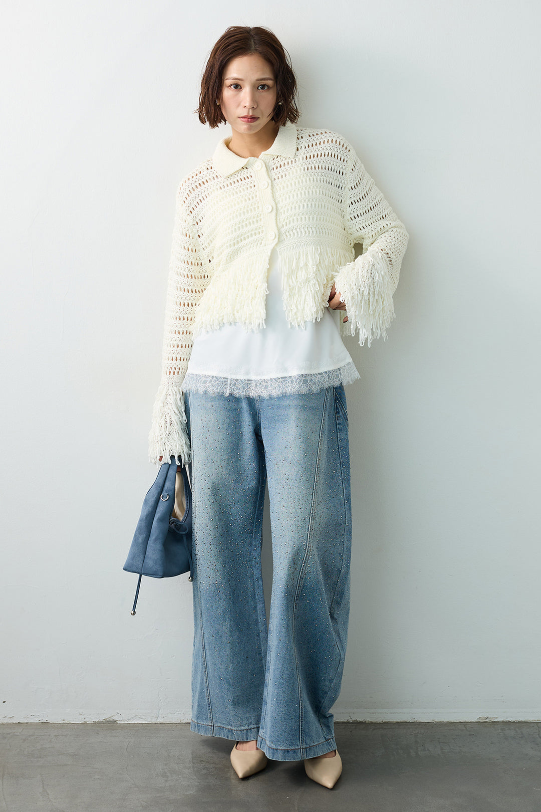 [予約/SET]メッシュフリンジクロップドニット+スパークルラインストーンカーブデニム(2set)