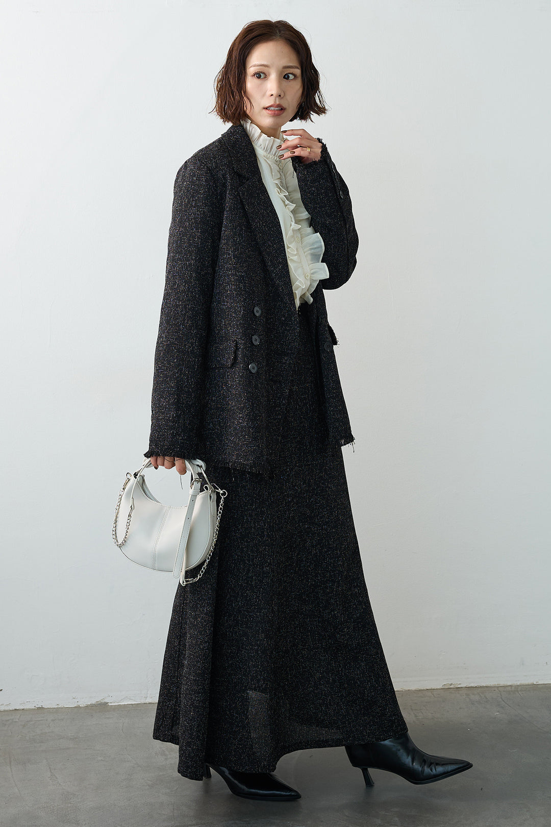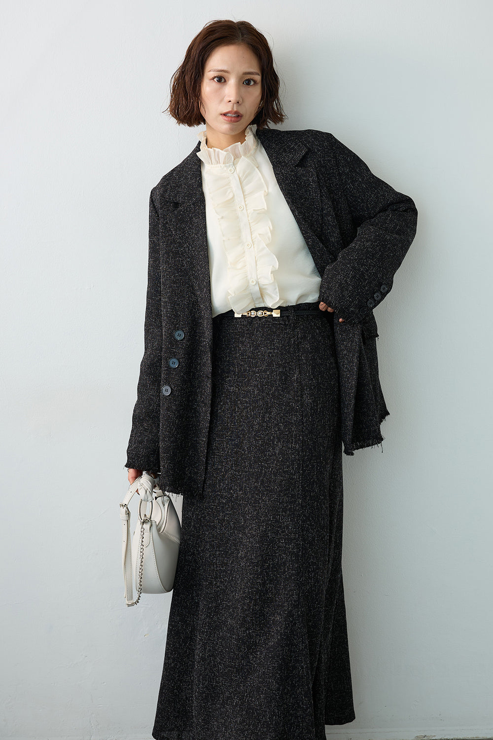 [予約/SET]エアリーフリルブラウス+スラブネップツイードフリンジテーラージャケット+スラブネップツイードフレアスカート(3set)