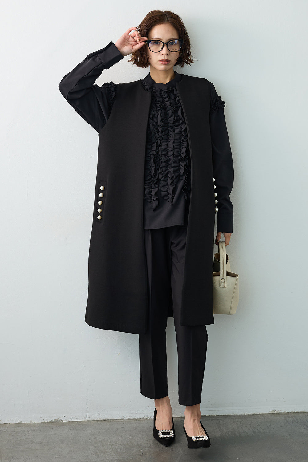 [予約/SET]Iラインフリルホイップブラウス+ポケットパール付きボンディングロングベスト+タックテーパードパンツ(3set)