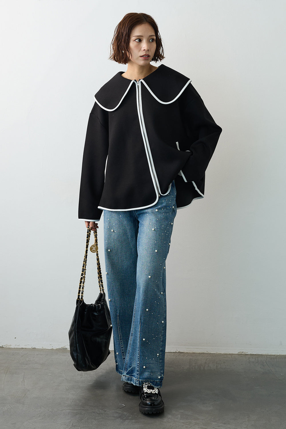 [予約/SET]バイカラーボンディング襟付きコート+パールラインストーンハイウエストデニム(2set)