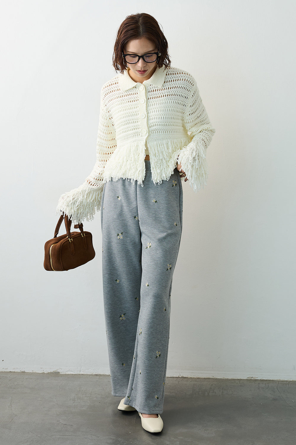 [予約/SET]メッシュフリンジクロップドニット+フラワー刺繍ストレートポンチパンツ(2set)
