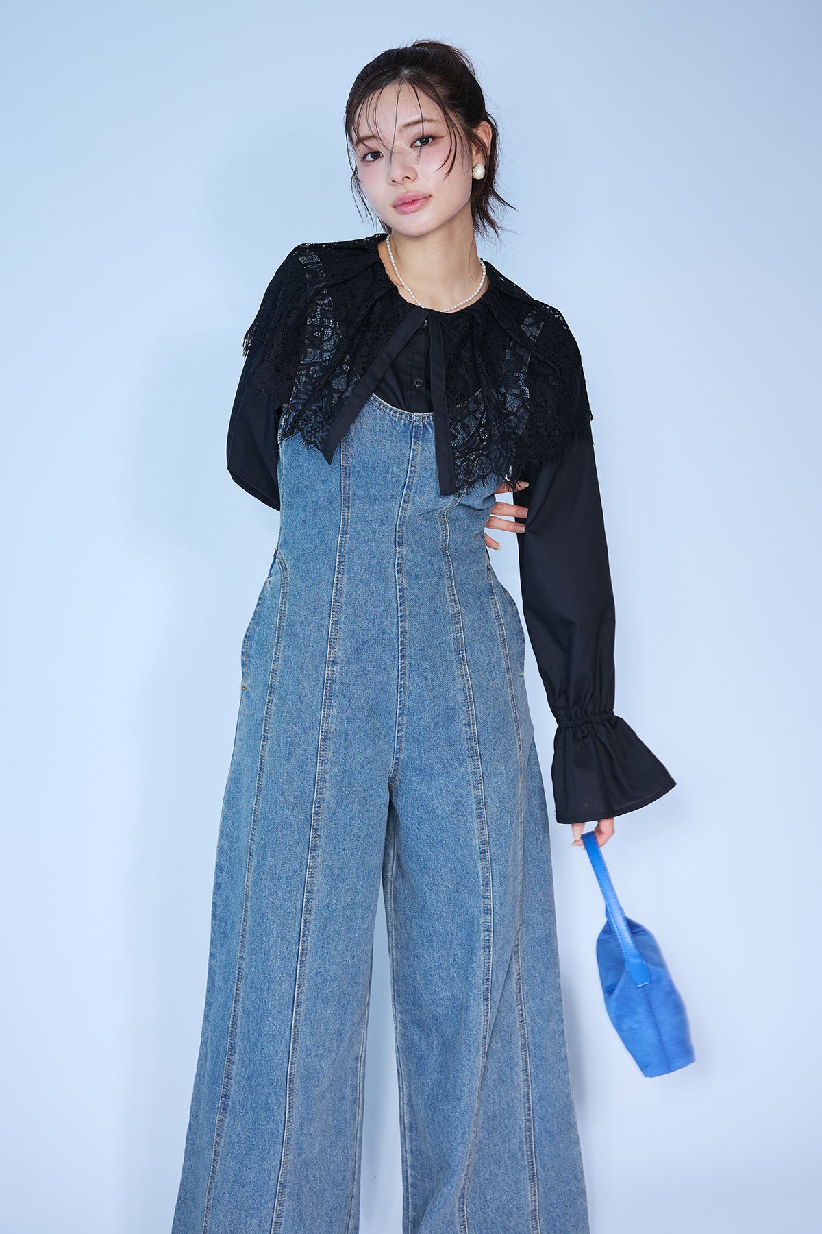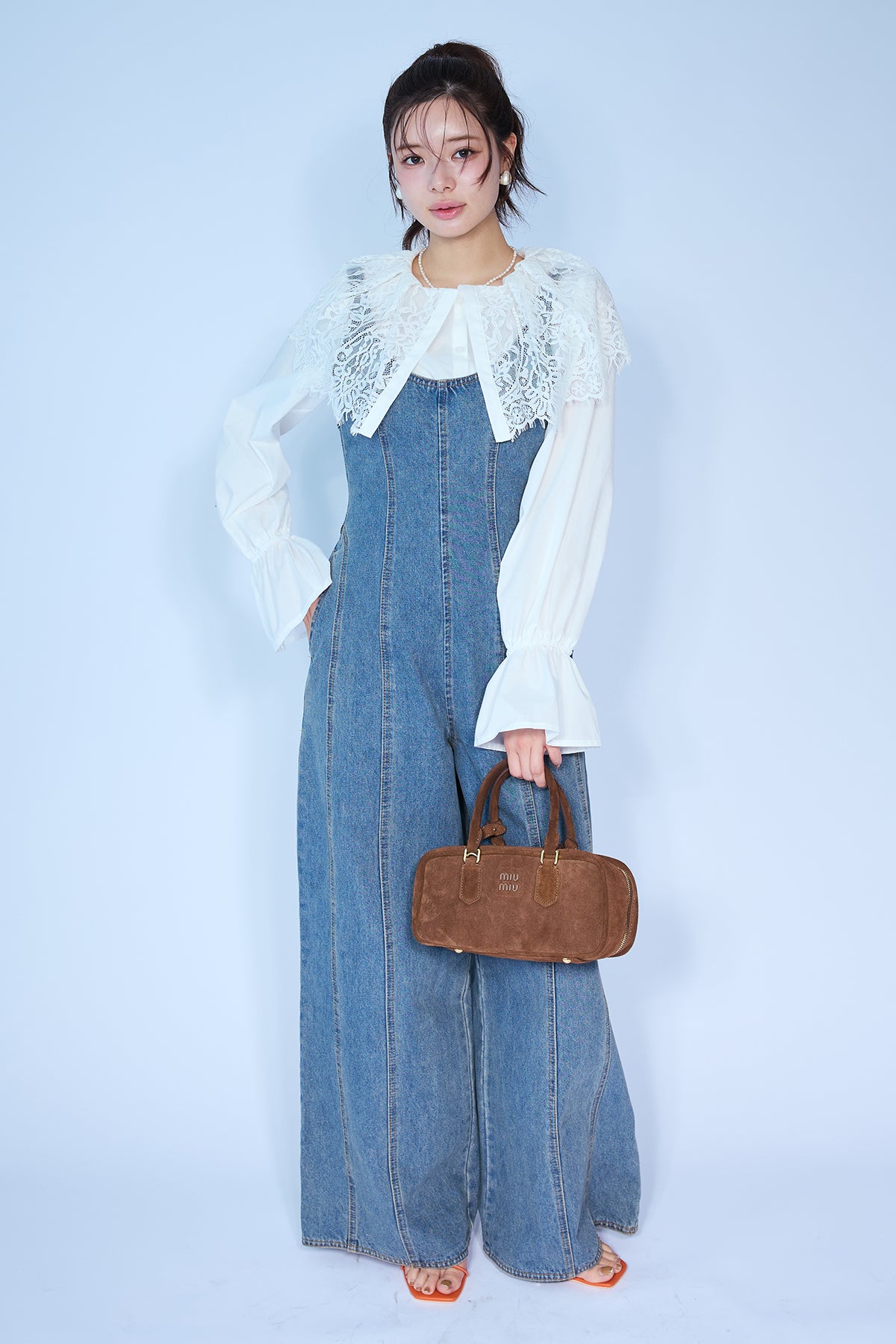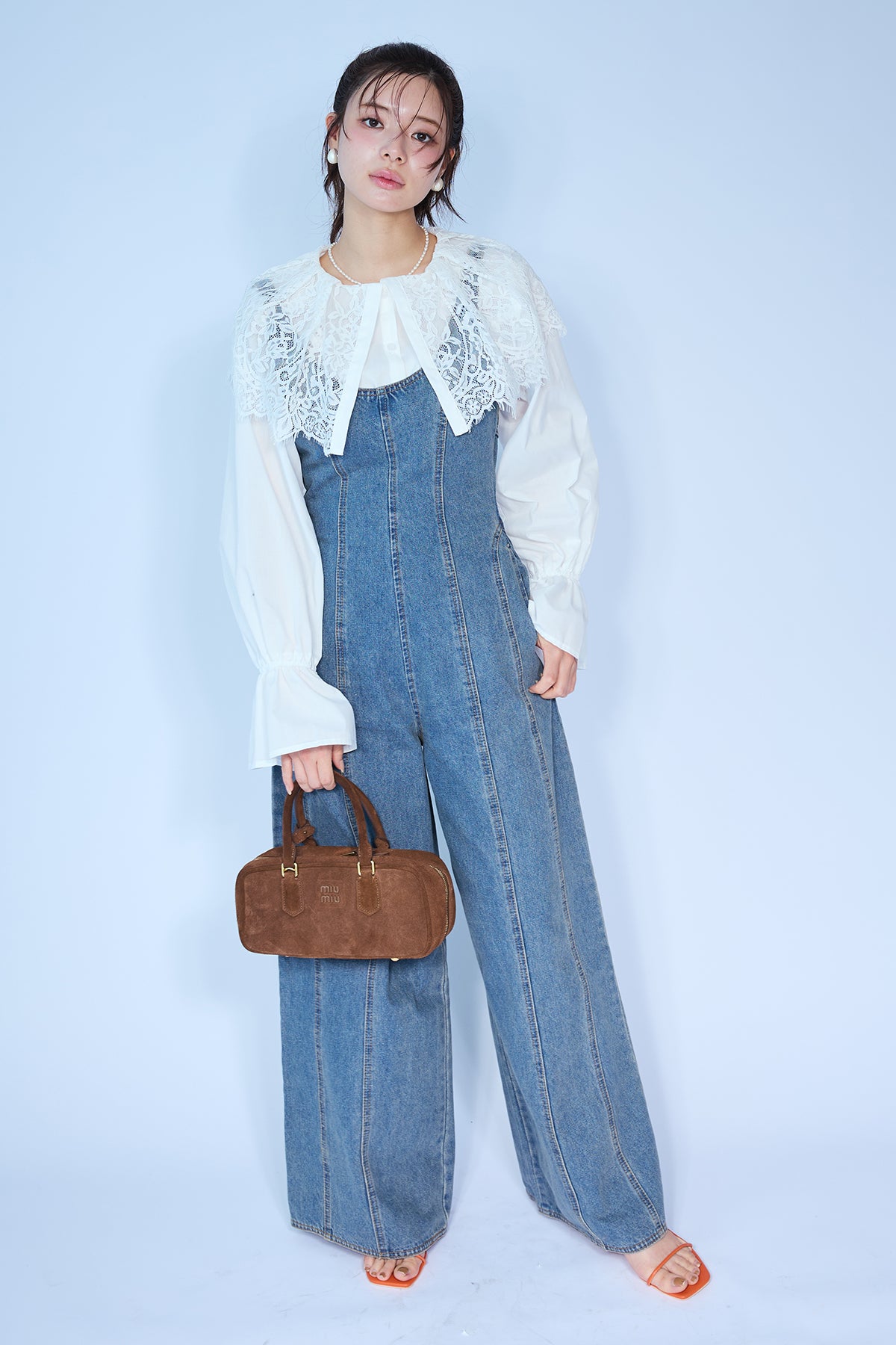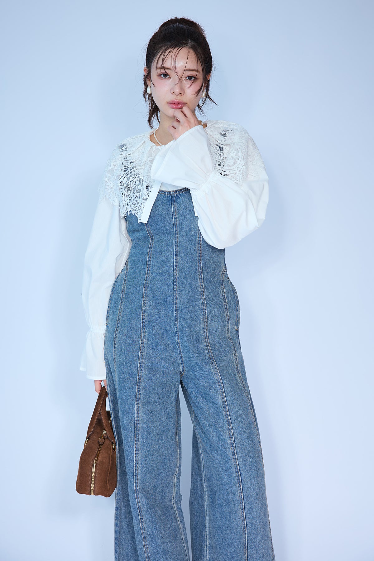 [予約/SET]繊細レースカラーキャンディースリーブブラウス+美ラインデニムサロペット(2set)