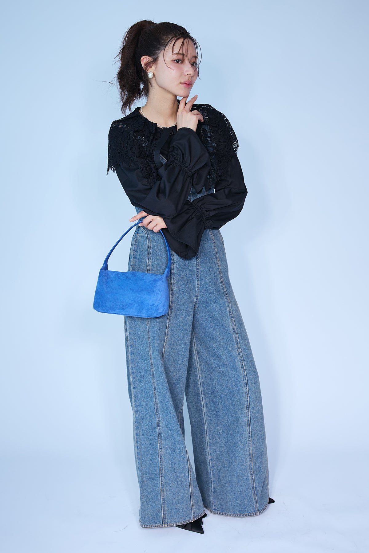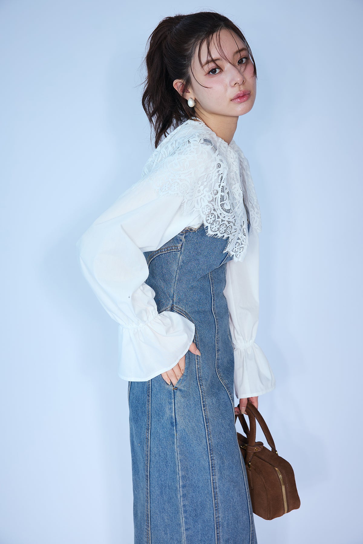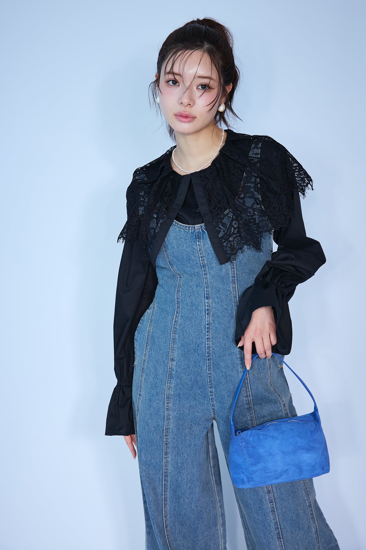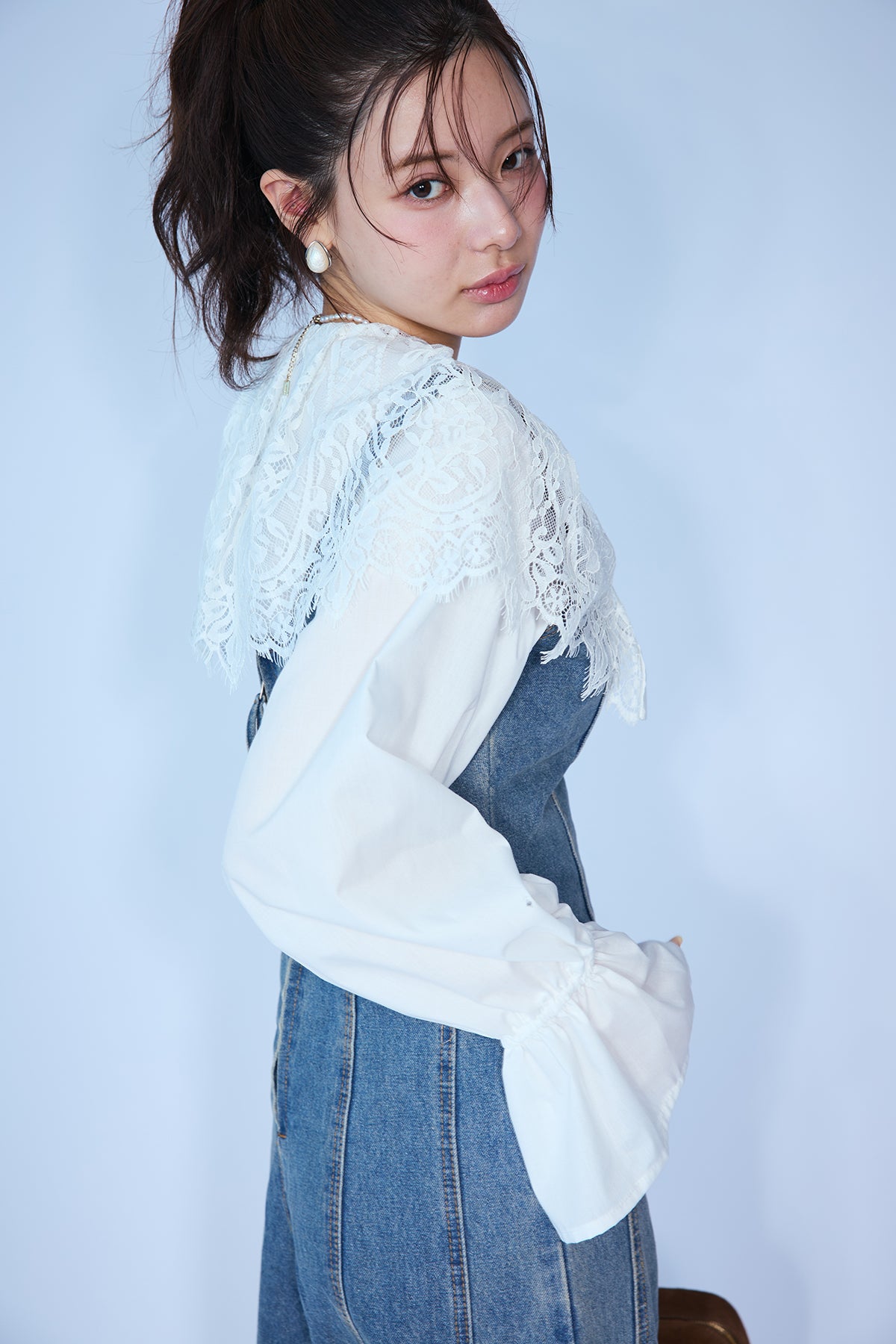 [予約/SET]繊細レースカラーキャンディースリーブブラウス+美ラインデニムサロペット(2set)