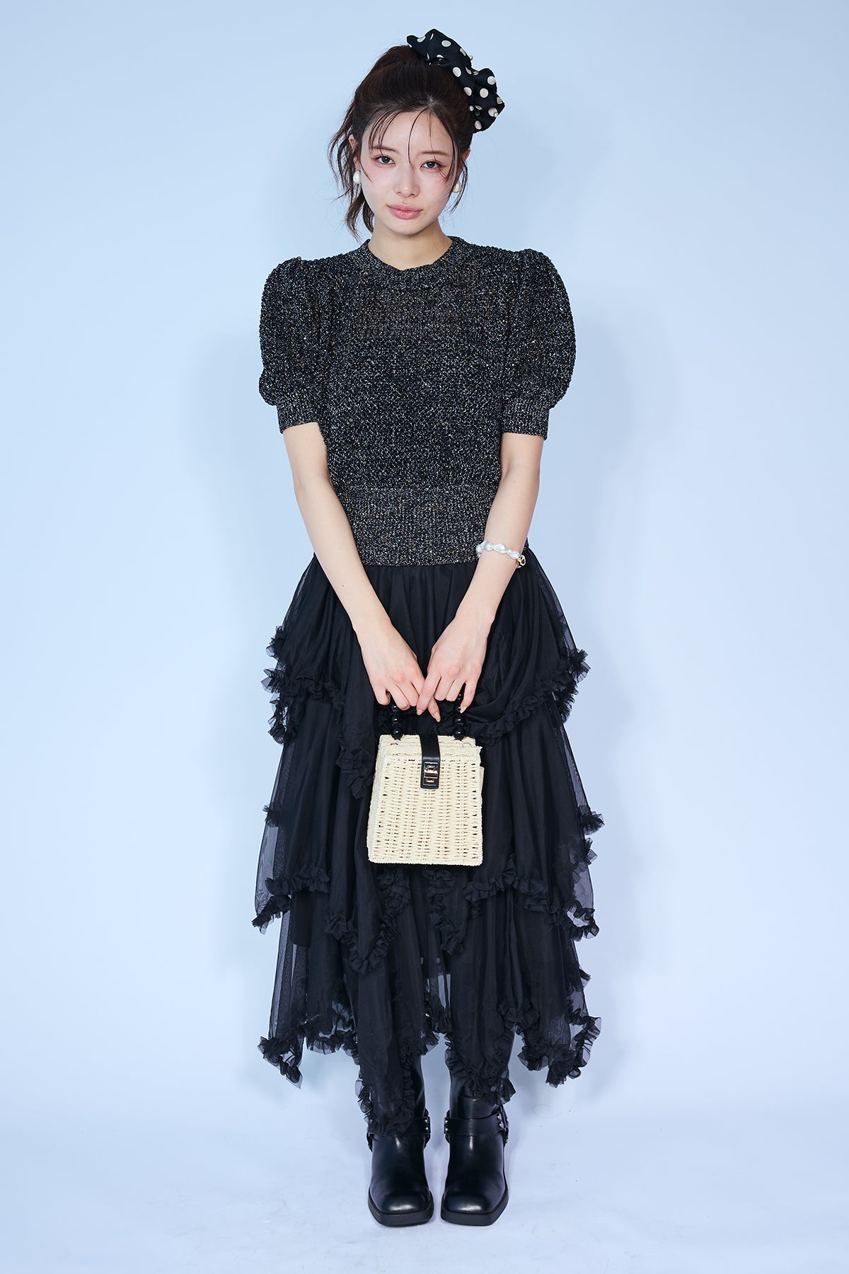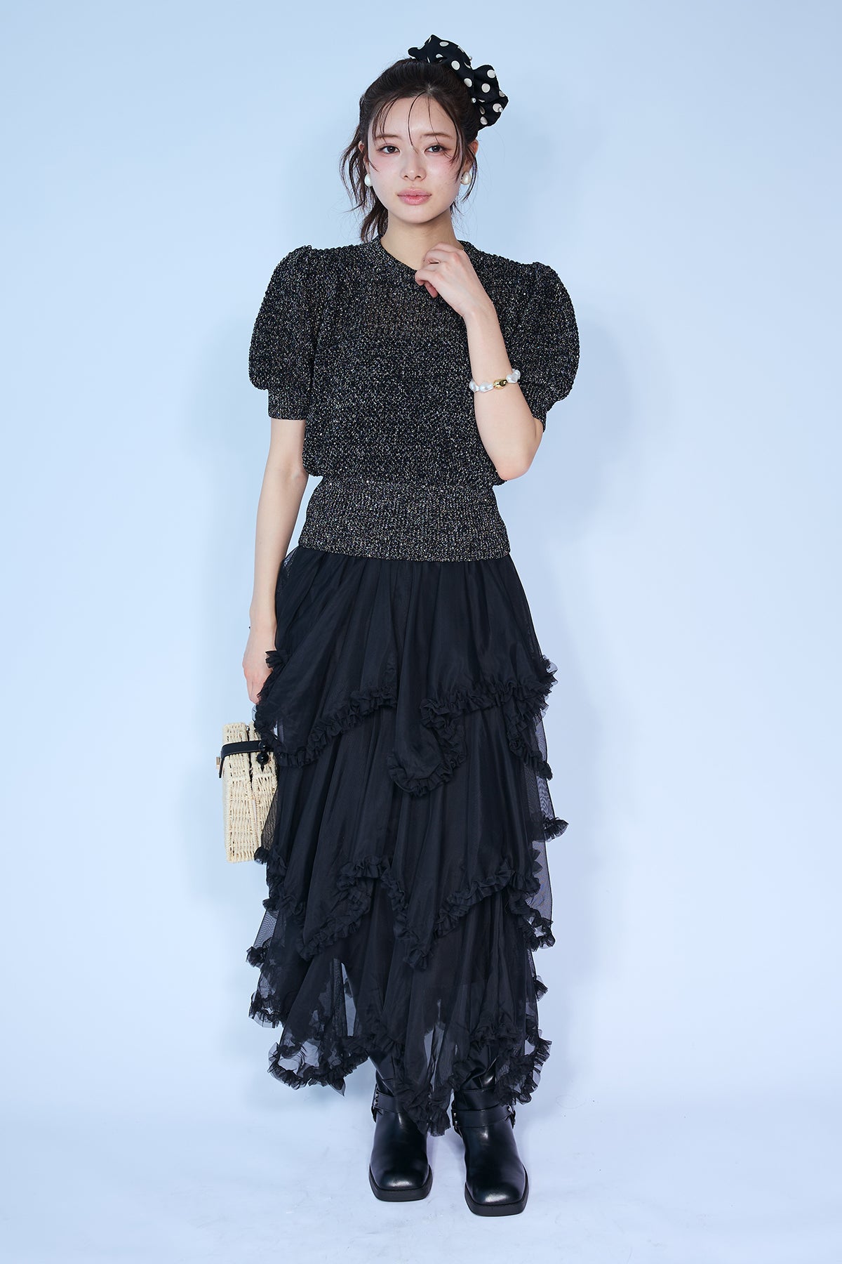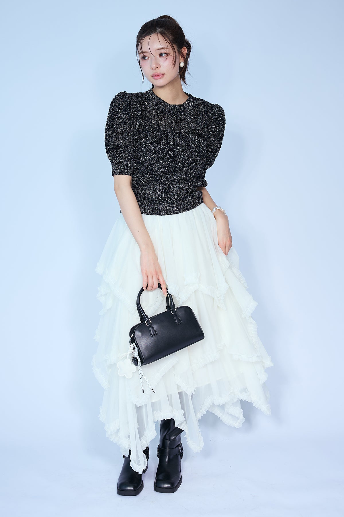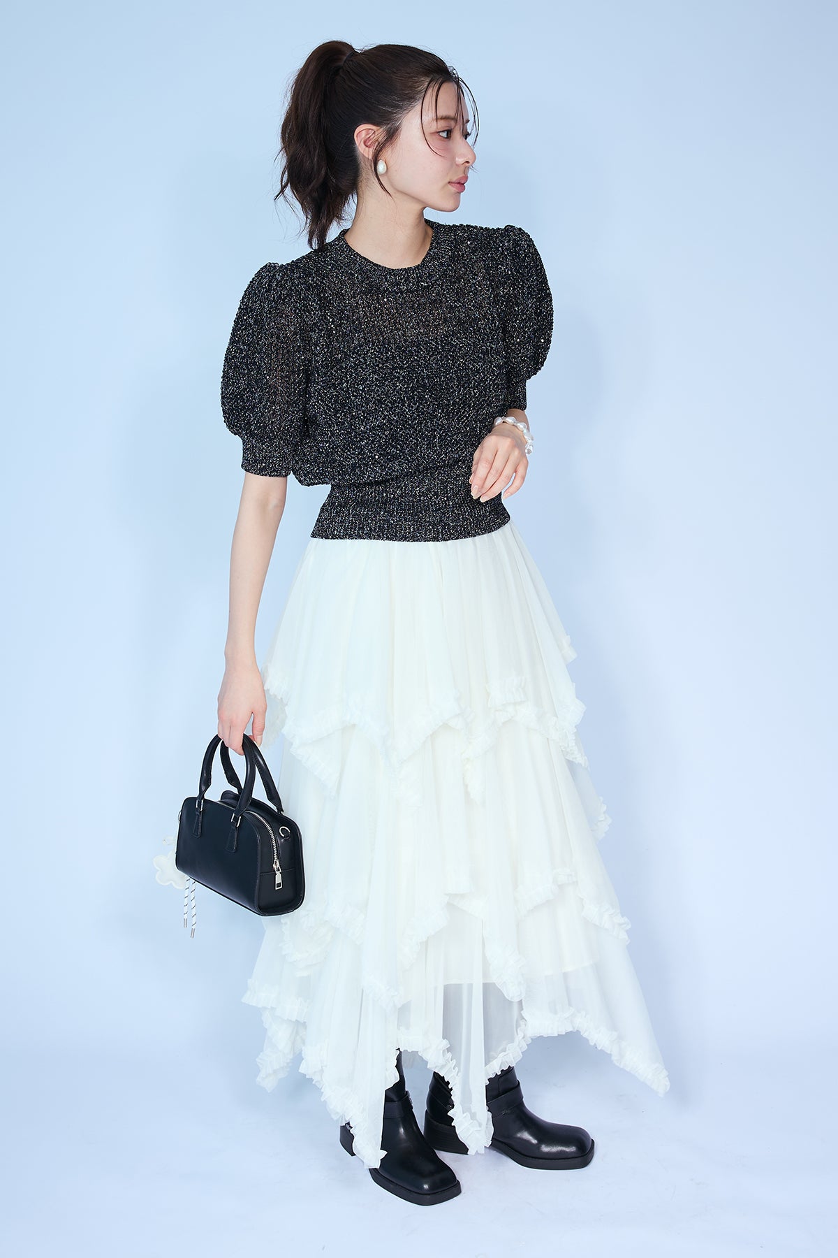 [予約/SET]ラメ混パフスリーブハーフスリーブニット+ムードチュールフリルスカート(2set)