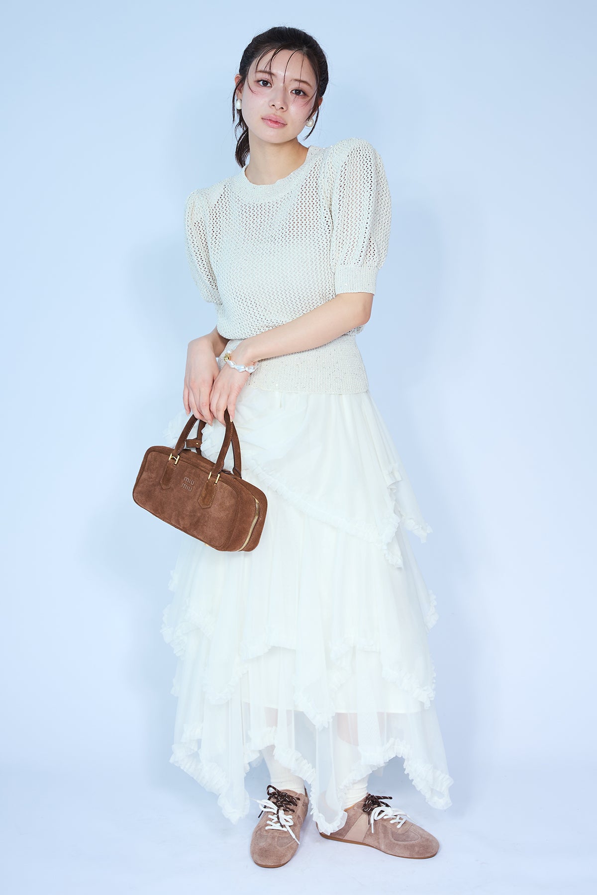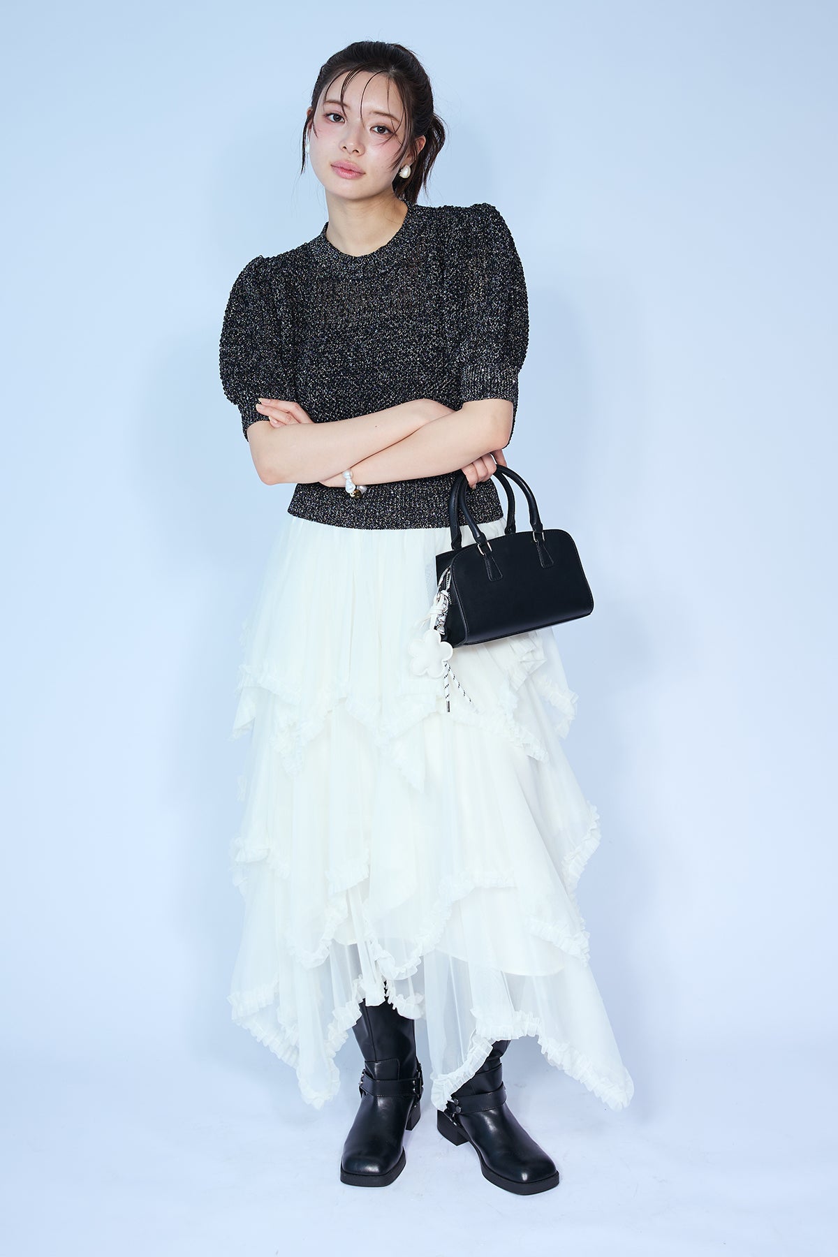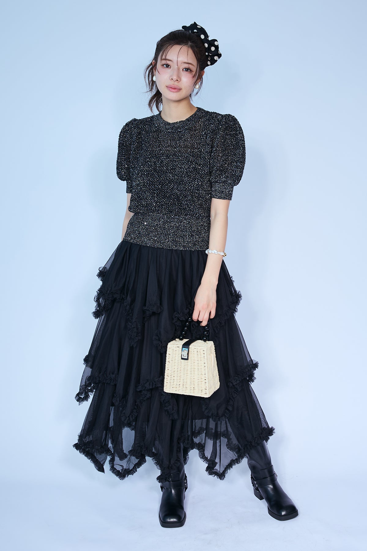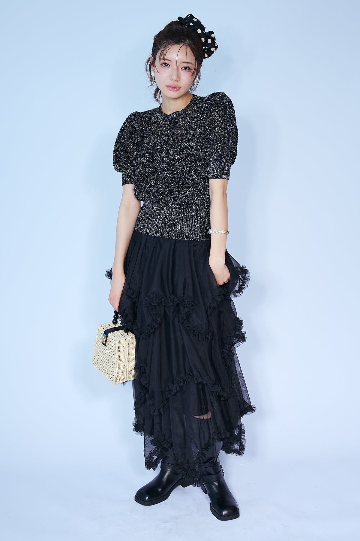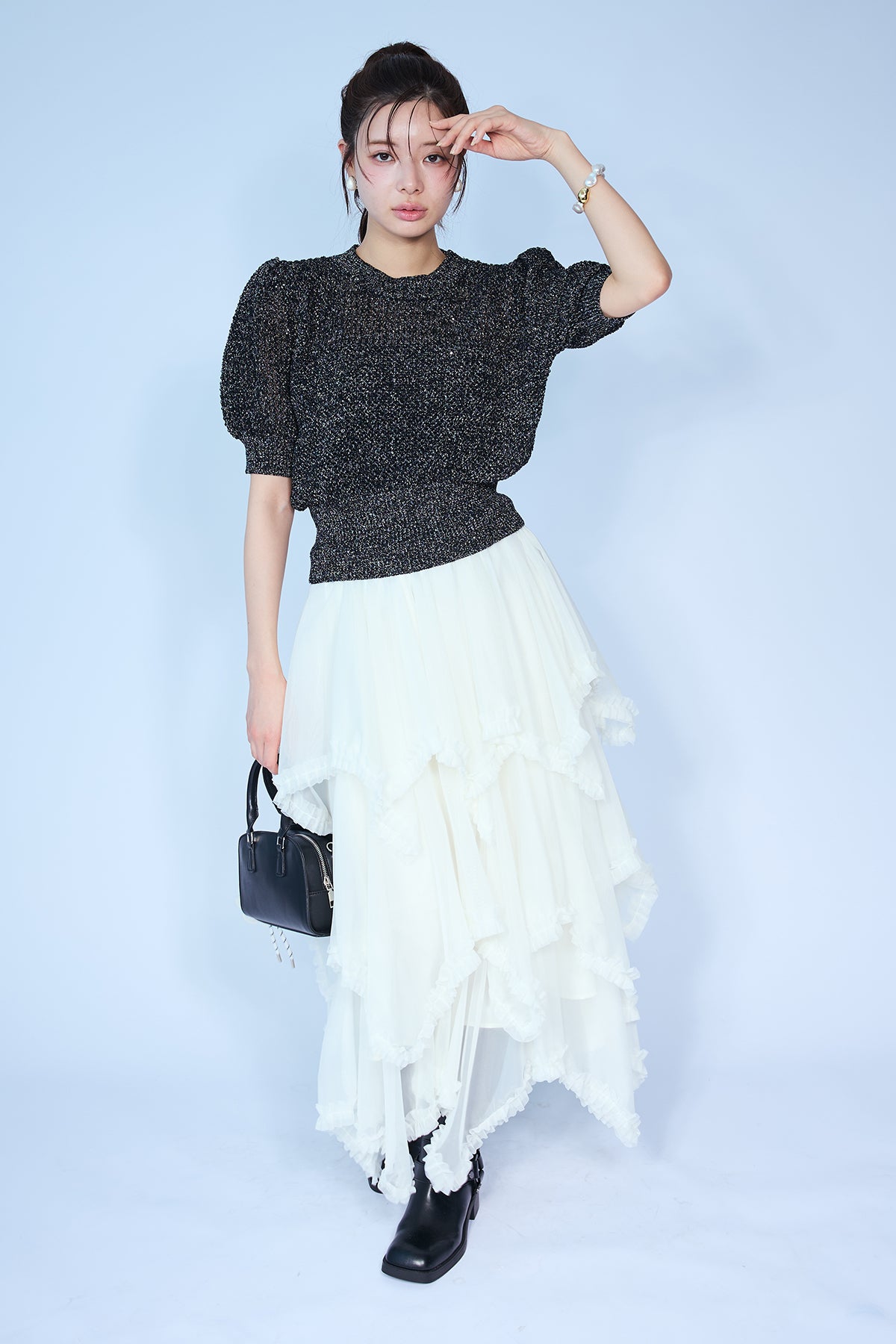 [予約/SET]ラメ混パフスリーブハーフスリーブニット+ムードチュールフリルスカート(2set)