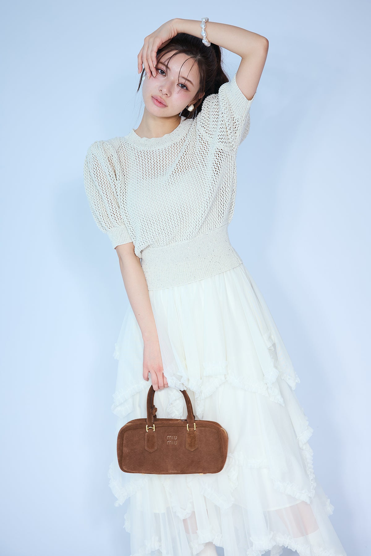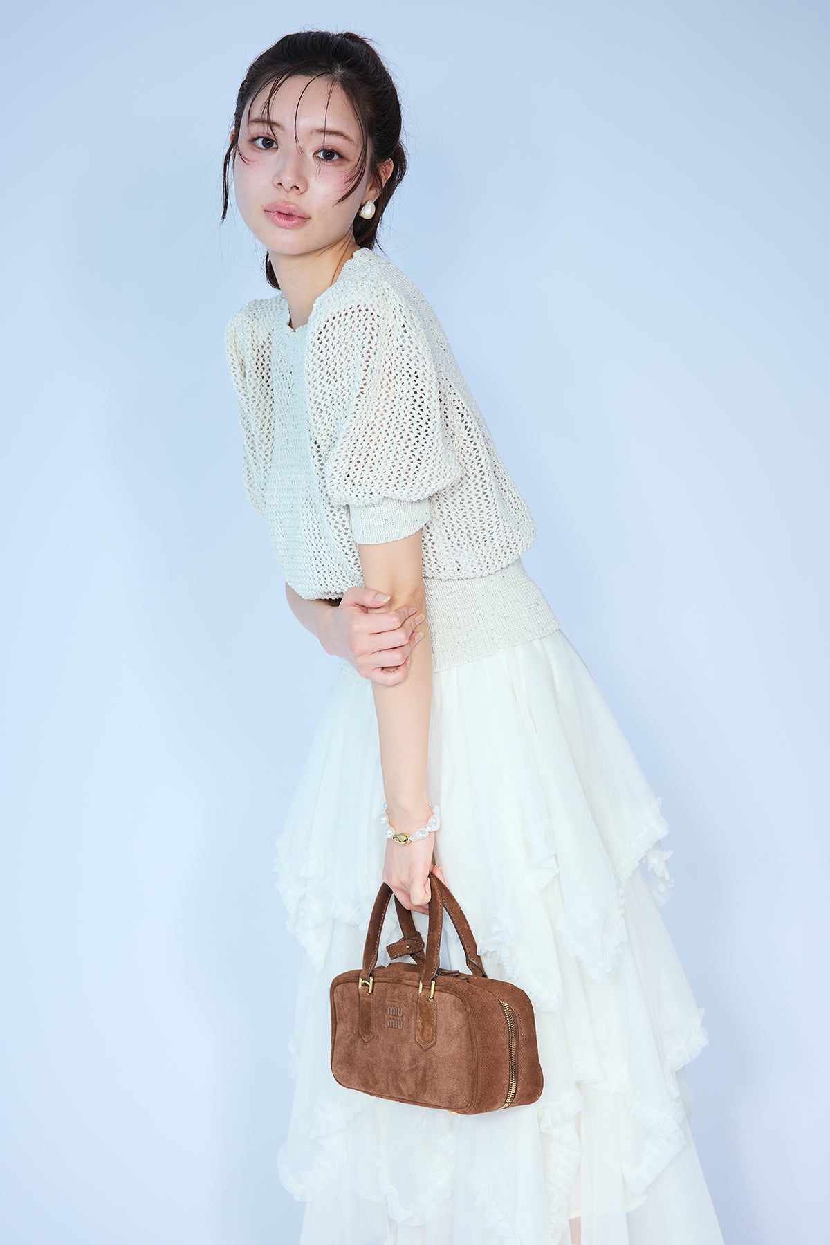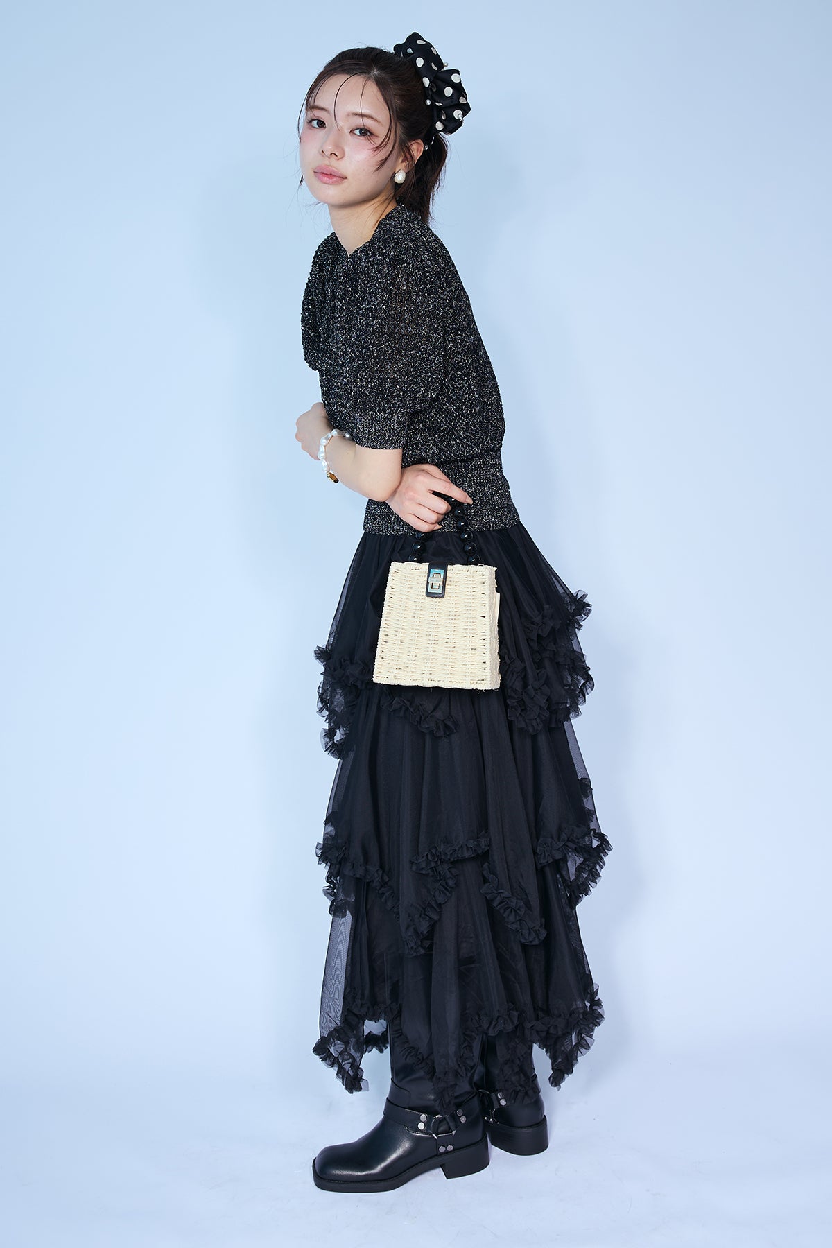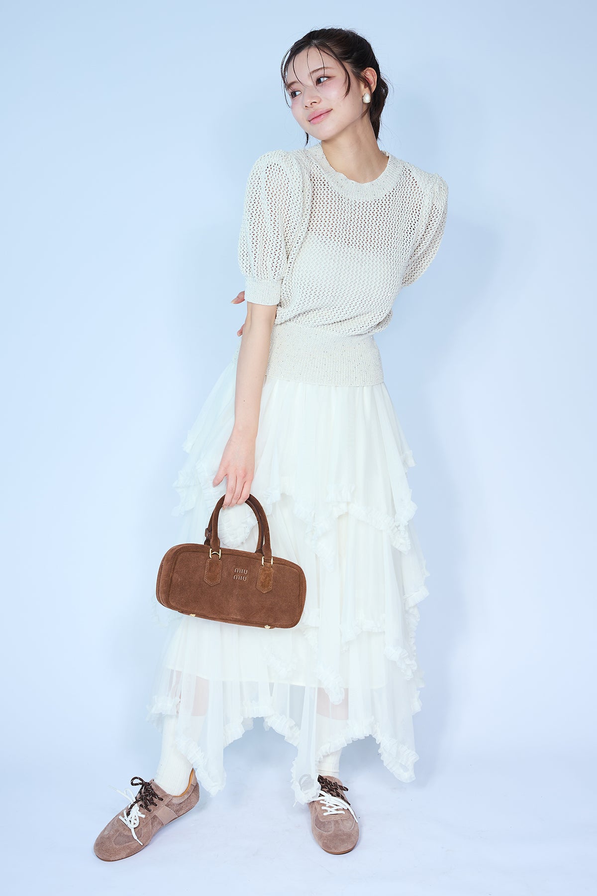 [予約/SET]ラメ混パフスリーブハーフスリーブニット+ムードチュールフリルスカート(2set)